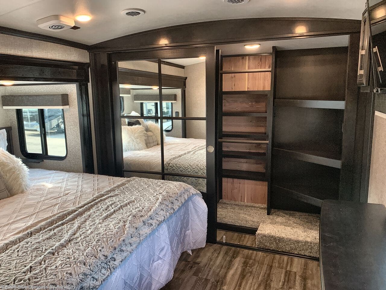 Trips to the lake are made comfortable in this triple slide out fifth wheel. Once you arrive at the campground, set up the two power awnings with LED lights, and there is an exterior TV for the big game. Head inside to relax on the theater seats directly across from the TV and fireplace or play a game at the roll-top dinette. The chef of your group will love this kitchen with its residential refrigerator, kitchen island, and pantry, plus additional storage for canned goods or paper products. The full bath will allow you to stay clean throughout your trip, you'll find a walk-in shower with teak seat, linen shelves above the bath and a medicine cabinet. Nothing says luxury like your own king bed slide out in the front bedroom, a large front closet with hamper and drawers for wrinkle-free clothes, and a flip-up dresser featuring a 32" TV!