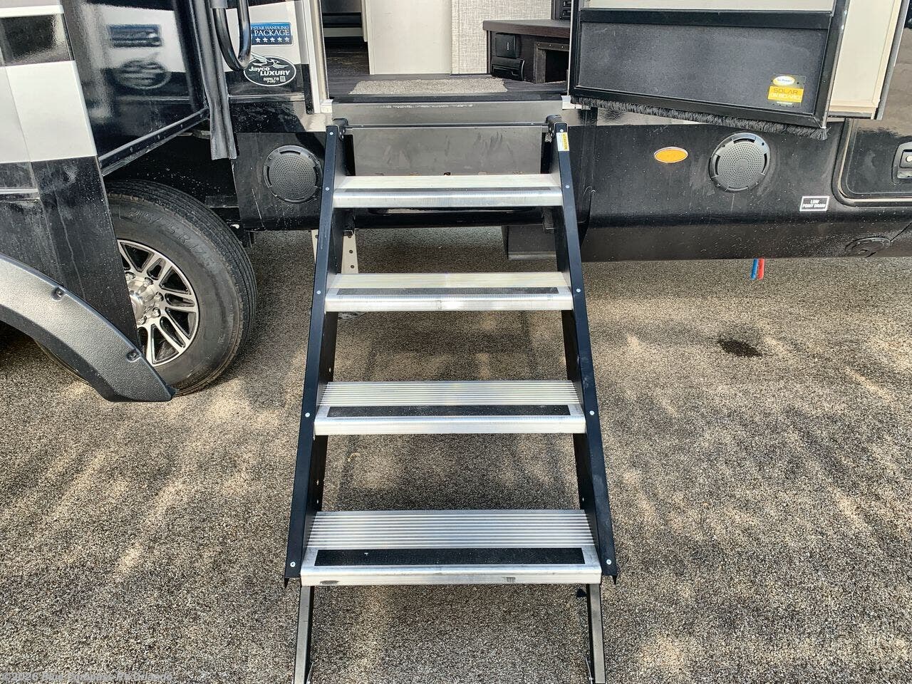 Trips to the lake are made comfortable in this triple slide out fifth wheel. Once you arrive at the campground, set up the two power awnings with LED lights, and there is an exterior TV for the big game. Head inside to relax on the theater seats directly across from the TV and fireplace or play a game at the roll-top dinette. The chef of your group will love this kitchen with its residential refrigerator, kitchen island, and pantry, plus additional storage for canned goods or paper products. The full bath will allow you to stay clean throughout your trip, you'll find a walk-in shower with teak seat, linen shelves above the bath and a medicine cabinet. Nothing says luxury like your own king bed slide out in the front bedroom, a large front closet with hamper and drawers for wrinkle-free clothes, and a flip-up dresser featuring a 32" TV!