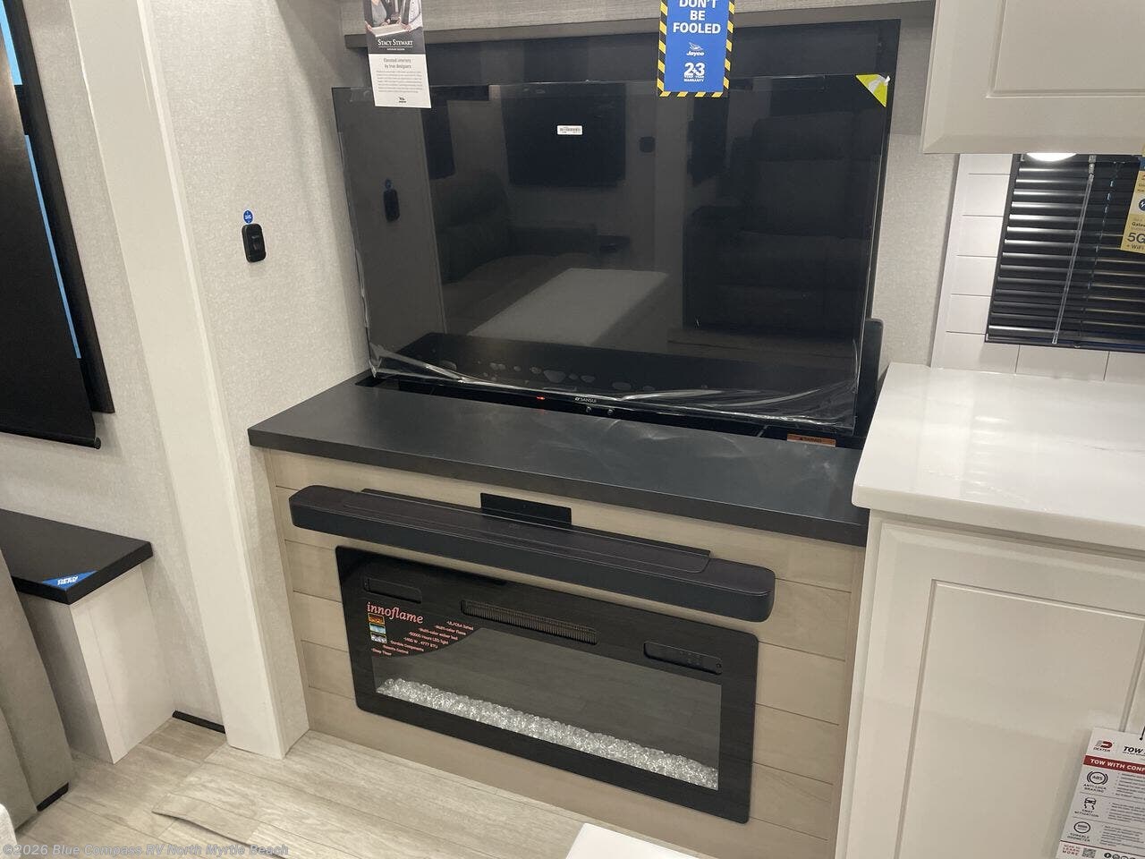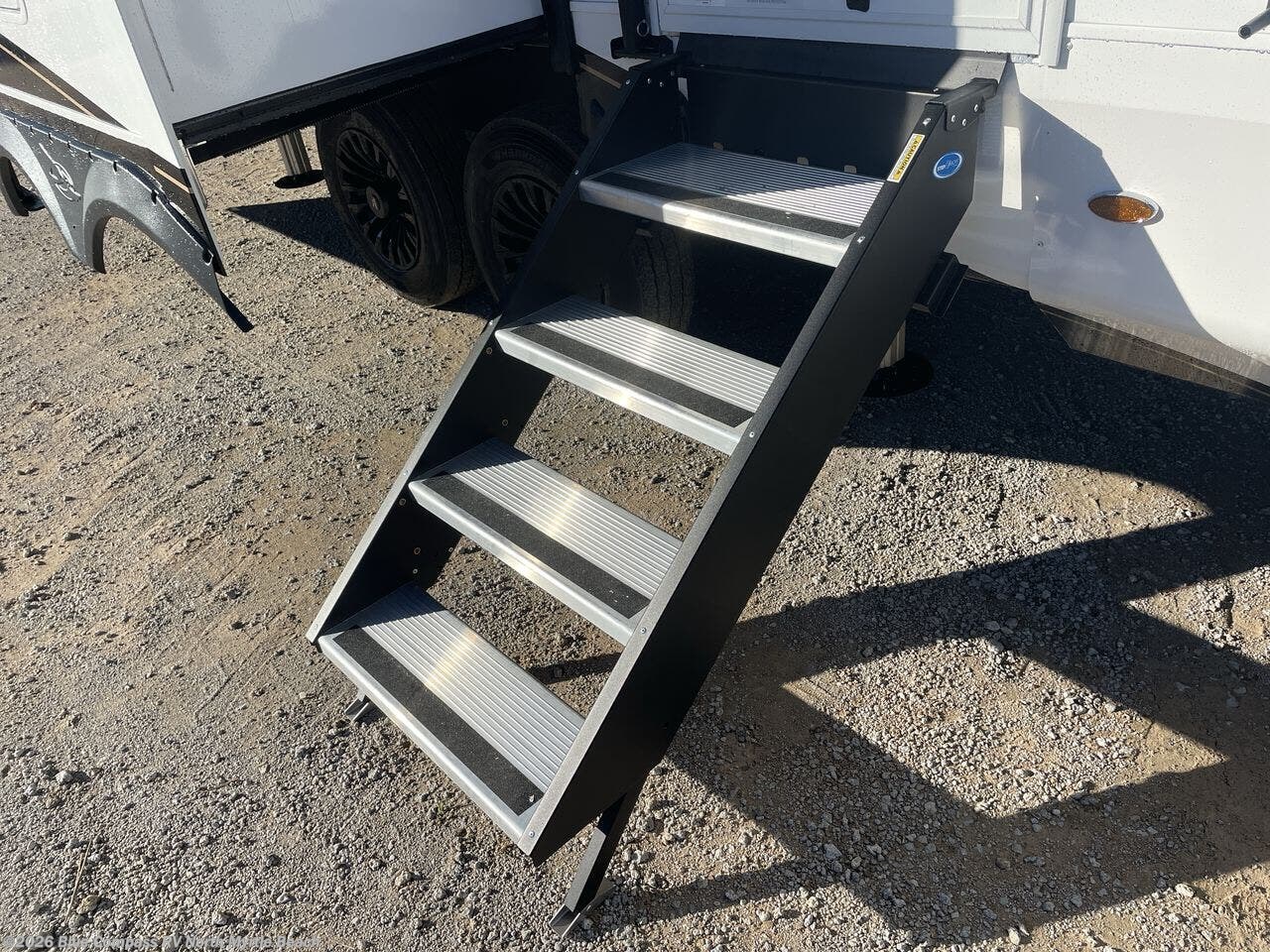 You can't go wrong with this fifth wheel that can sleep four! You will love how much space you have in the main living area thanks to the dual opposing slides, and there is a kitchen island here with a pull-out extension for added prep space. The convenient half bath is right off of the kitchen for quick restroom breaks, and you'll find a shoe garage and a wardrobe just as you enter the unit to keep the RV tidy. Head to the master bedroom for a rest on the king bed slide out, or you may want to watch a show on the 32" bedroom TV. The front master bath may be your favorite feature of this unit. Here, you'll find dual bath sinks, a walk-in shower with a seat, plus a spacious walk-in closet for your clothes. And don't overlook the exterior with its two power awnings, 32" exterior TV, and a Jayport with LP quick connect for your outdoor grill.