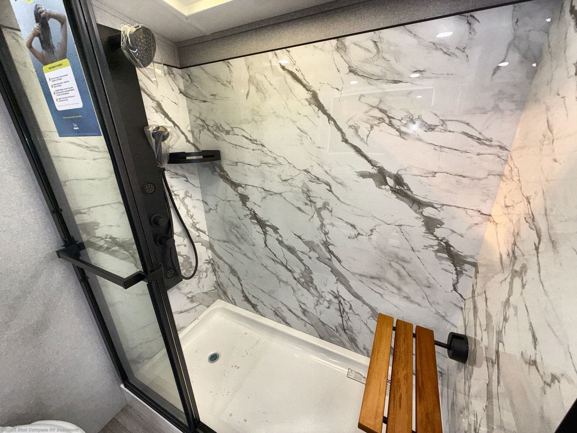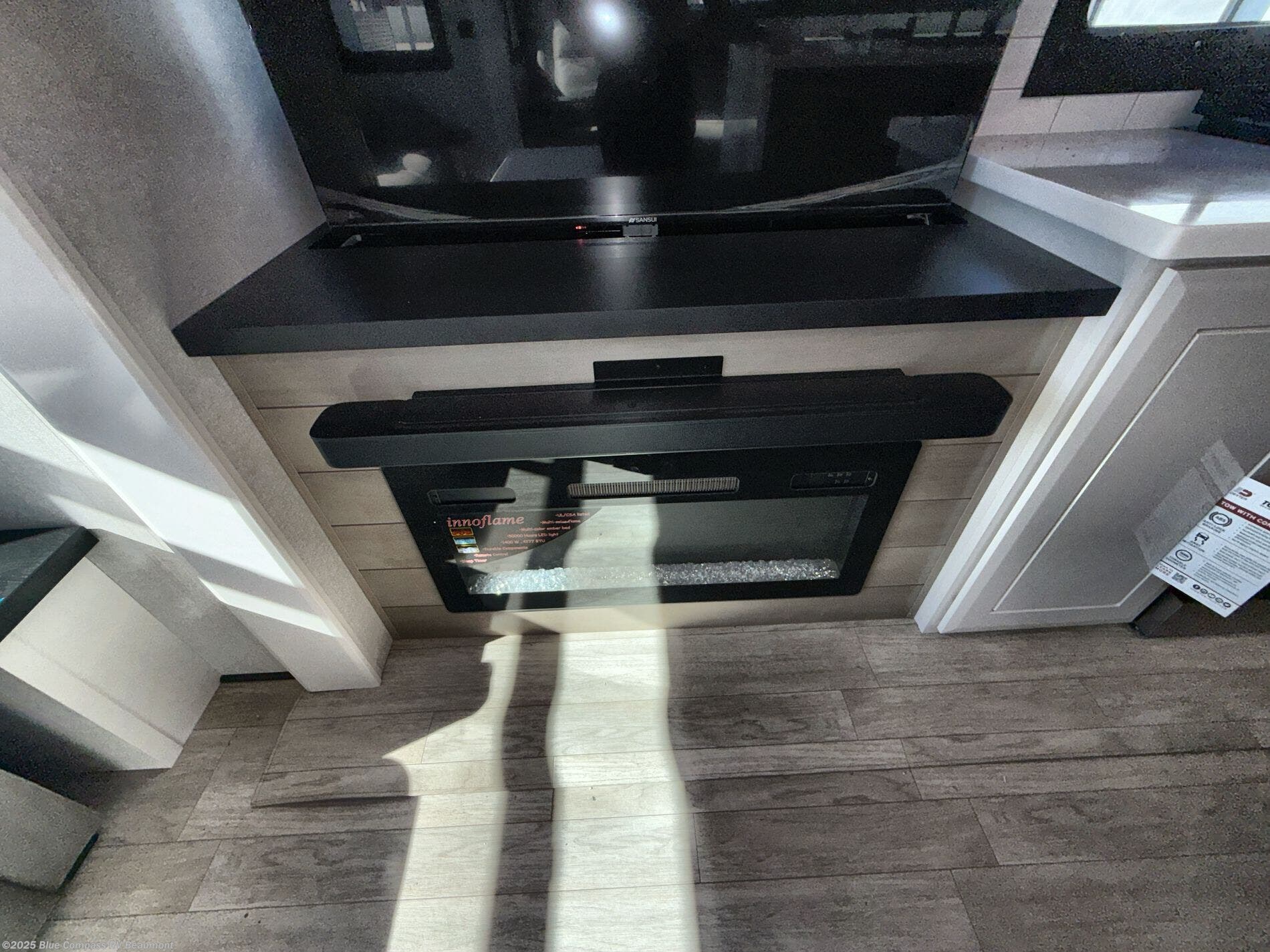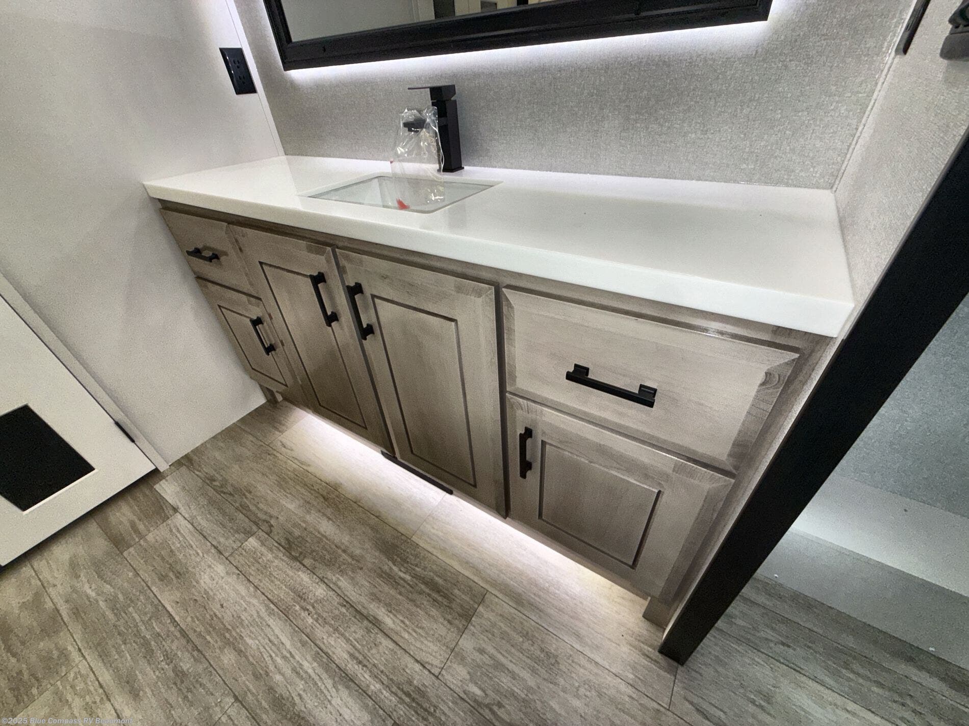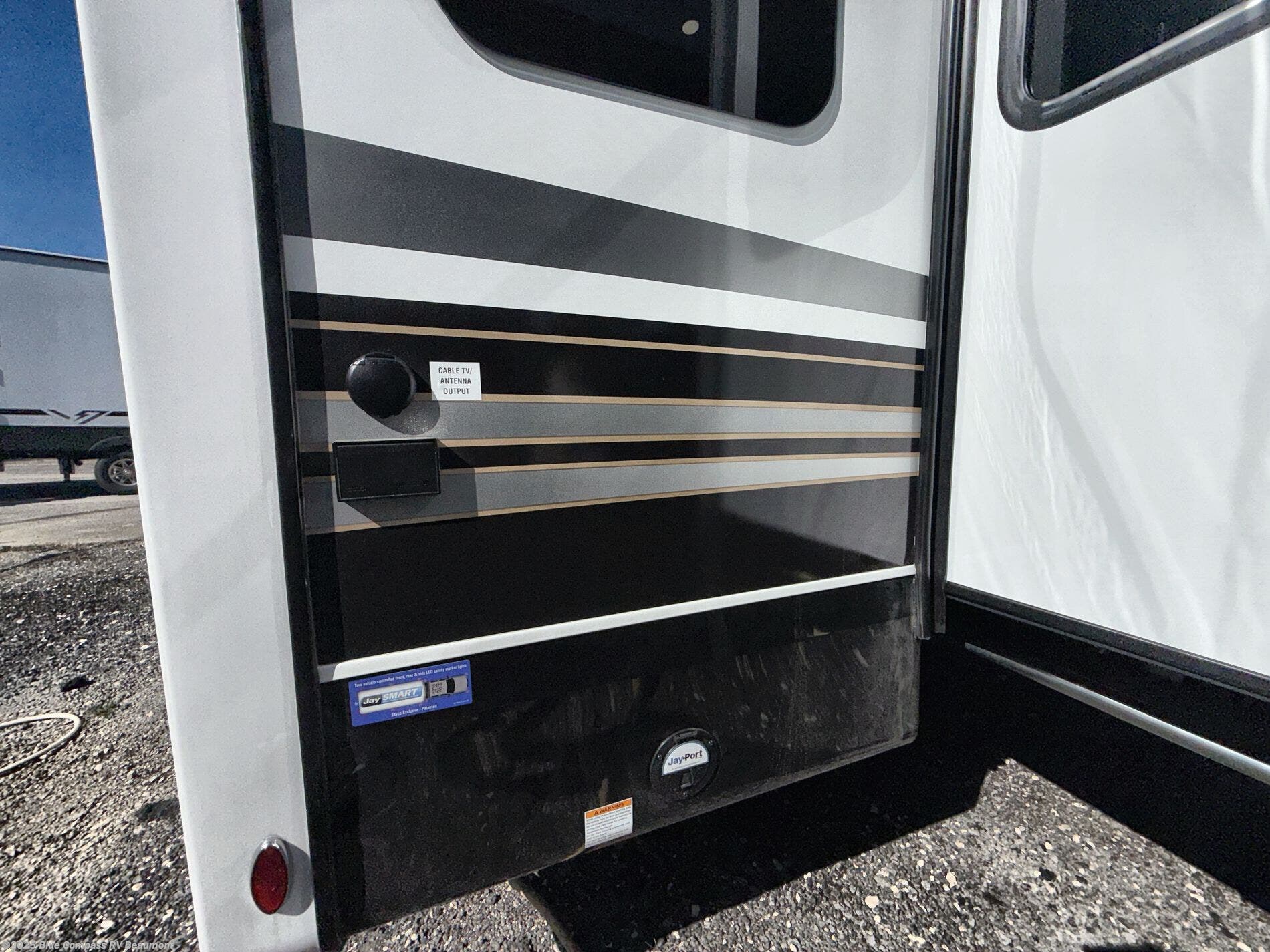 You can't go wrong with this fifth wheel that can sleep four! You will love how much space you have in the main living area thanks to the dual opposing slides, and there is a kitchen island here with a pull-out extension for added prep space. The convenient half bath is right off of the kitchen for quick restroom breaks, and you'll find a shoe garage and a wardrobe just as you enter the unit to keep the RV tidy. Head to the master bedroom for a rest on the king bed slide out, or you may want to watch a show on the 32" bedroom TV. The front master bath may be your favorite feature of this unit. Here, you'll find dual bath sinks, a walk-in shower with a seat, plus a spacious walk-in closet for your clothes. And don't overlook the exterior with its two power awnings, 32" exterior TV, and a Jayport with LP quick connect for your outdoor grill.