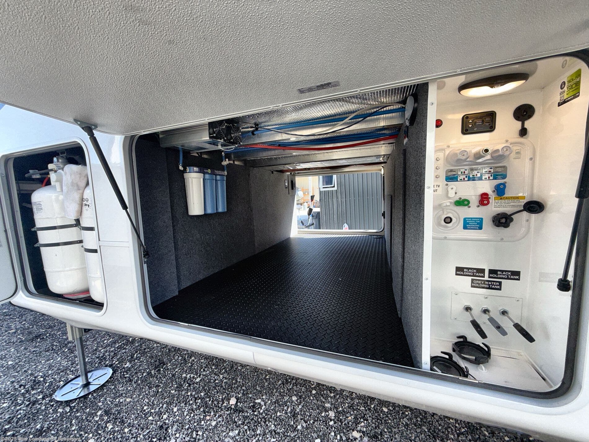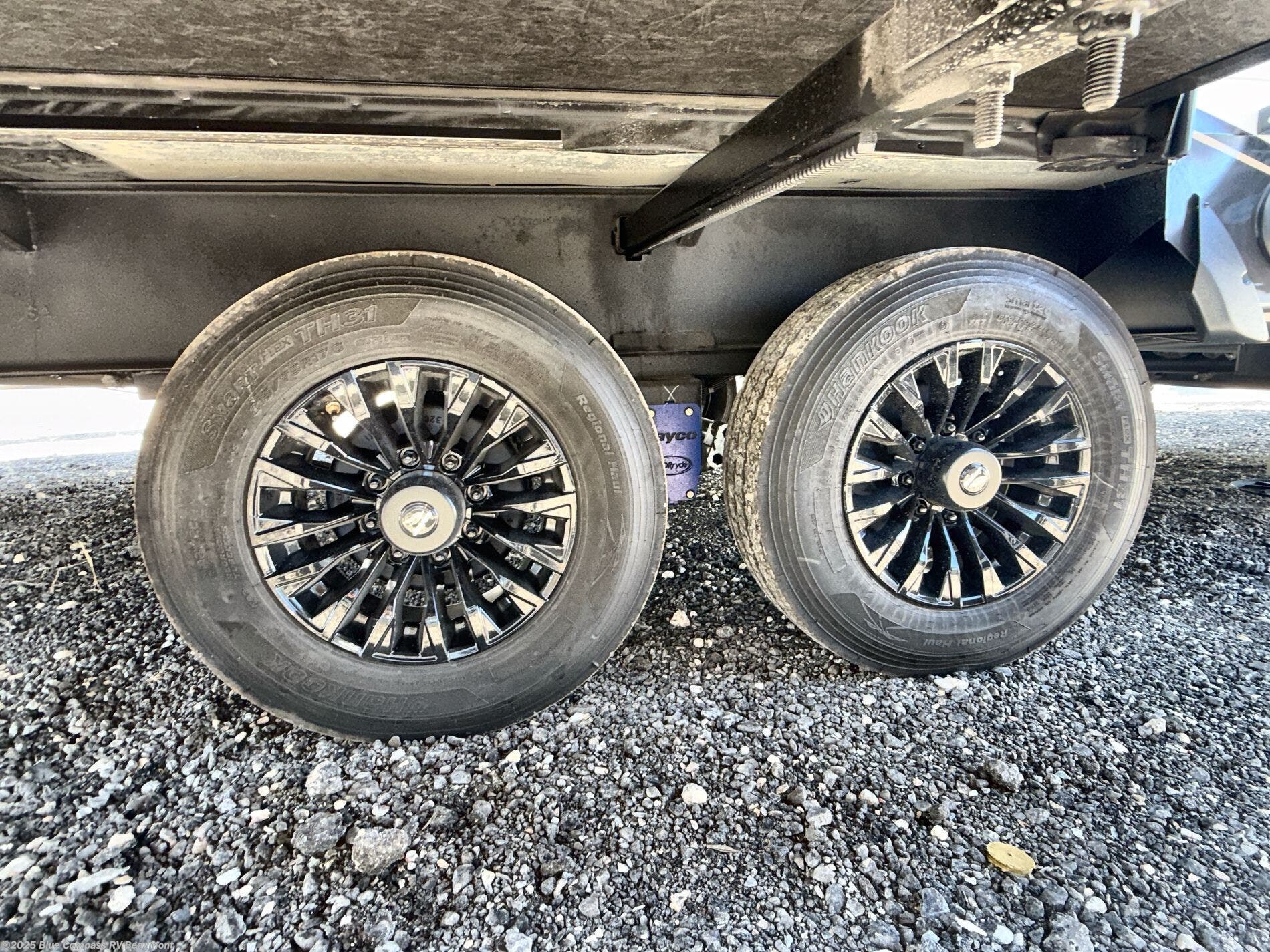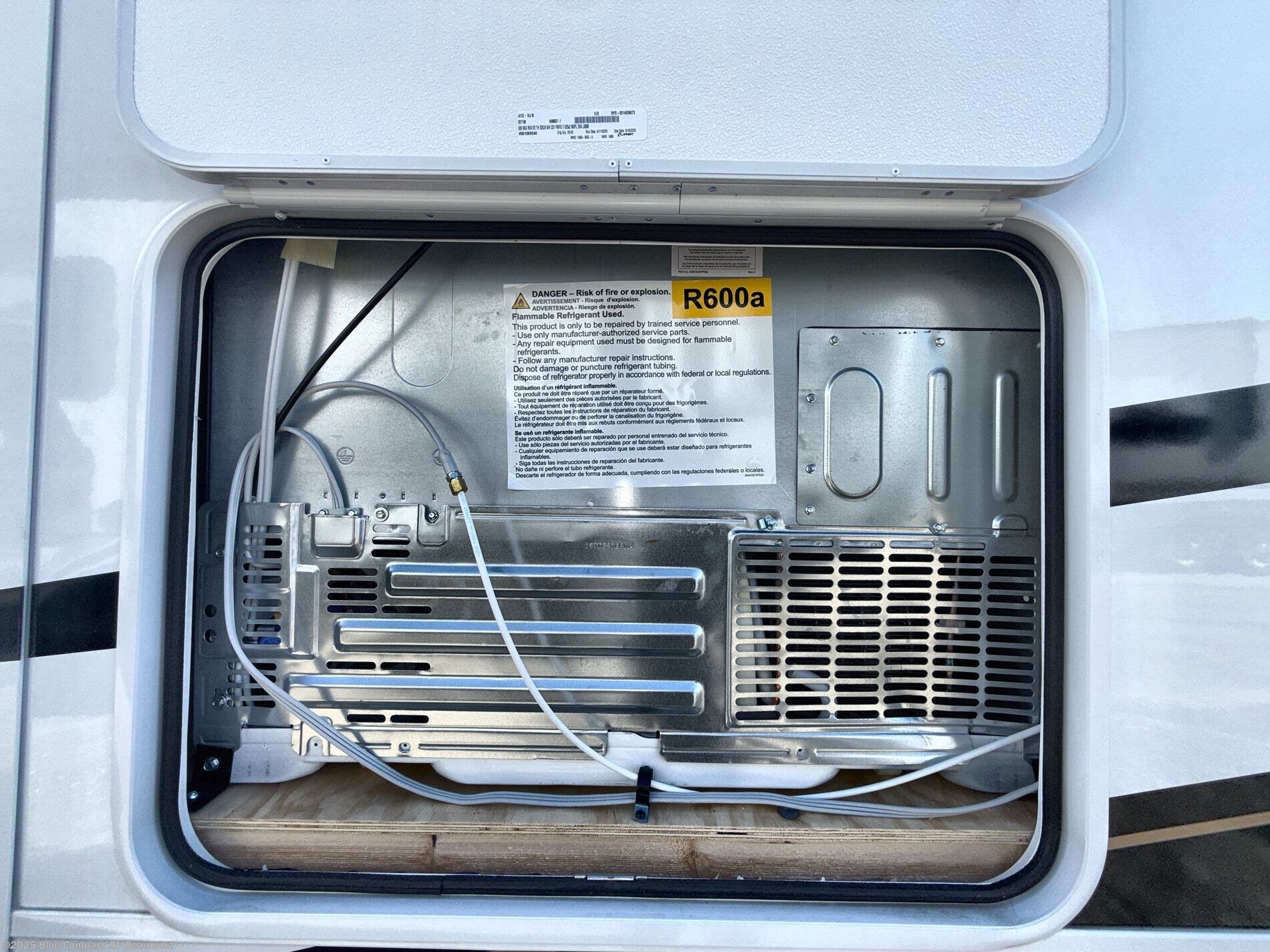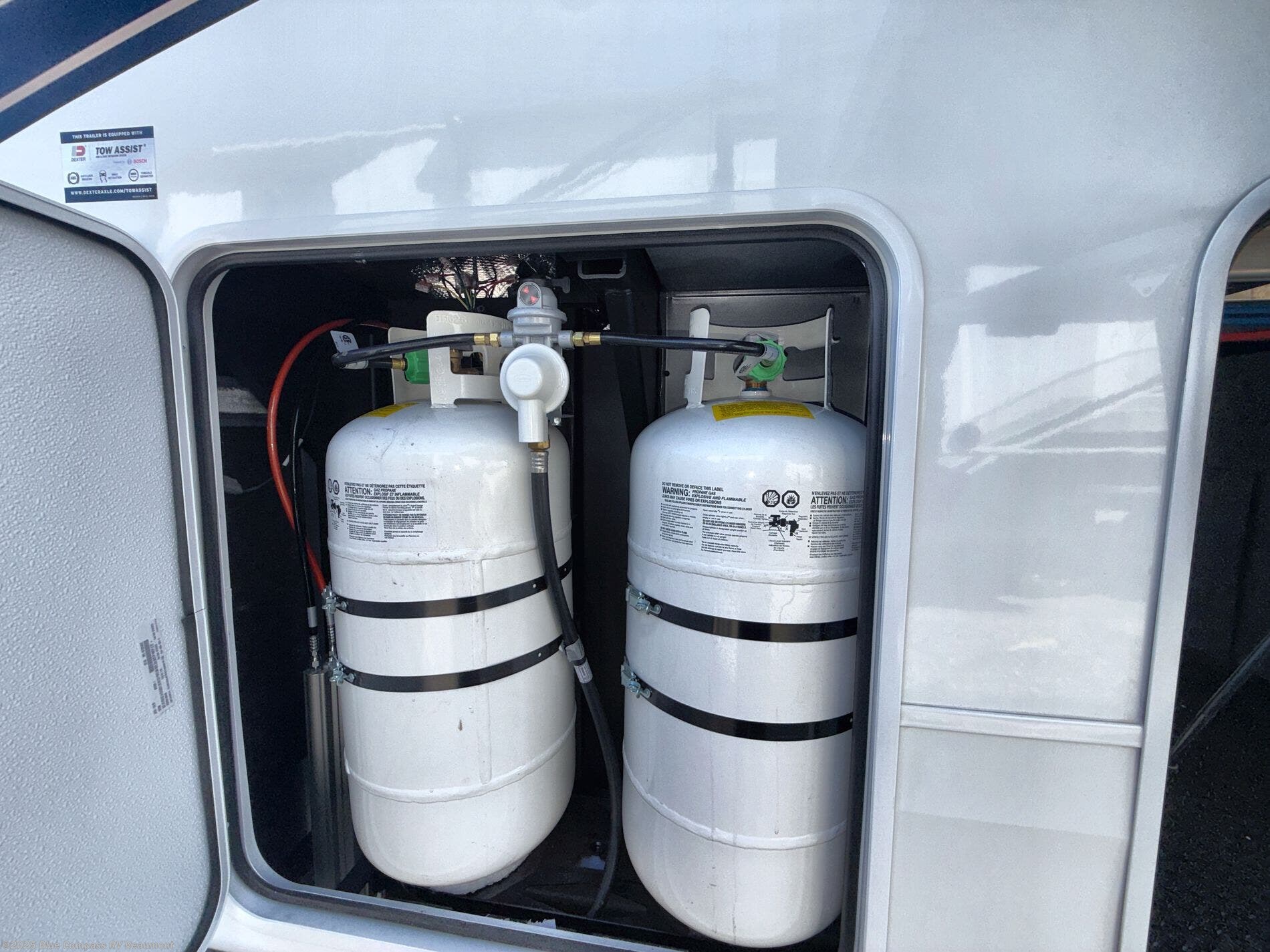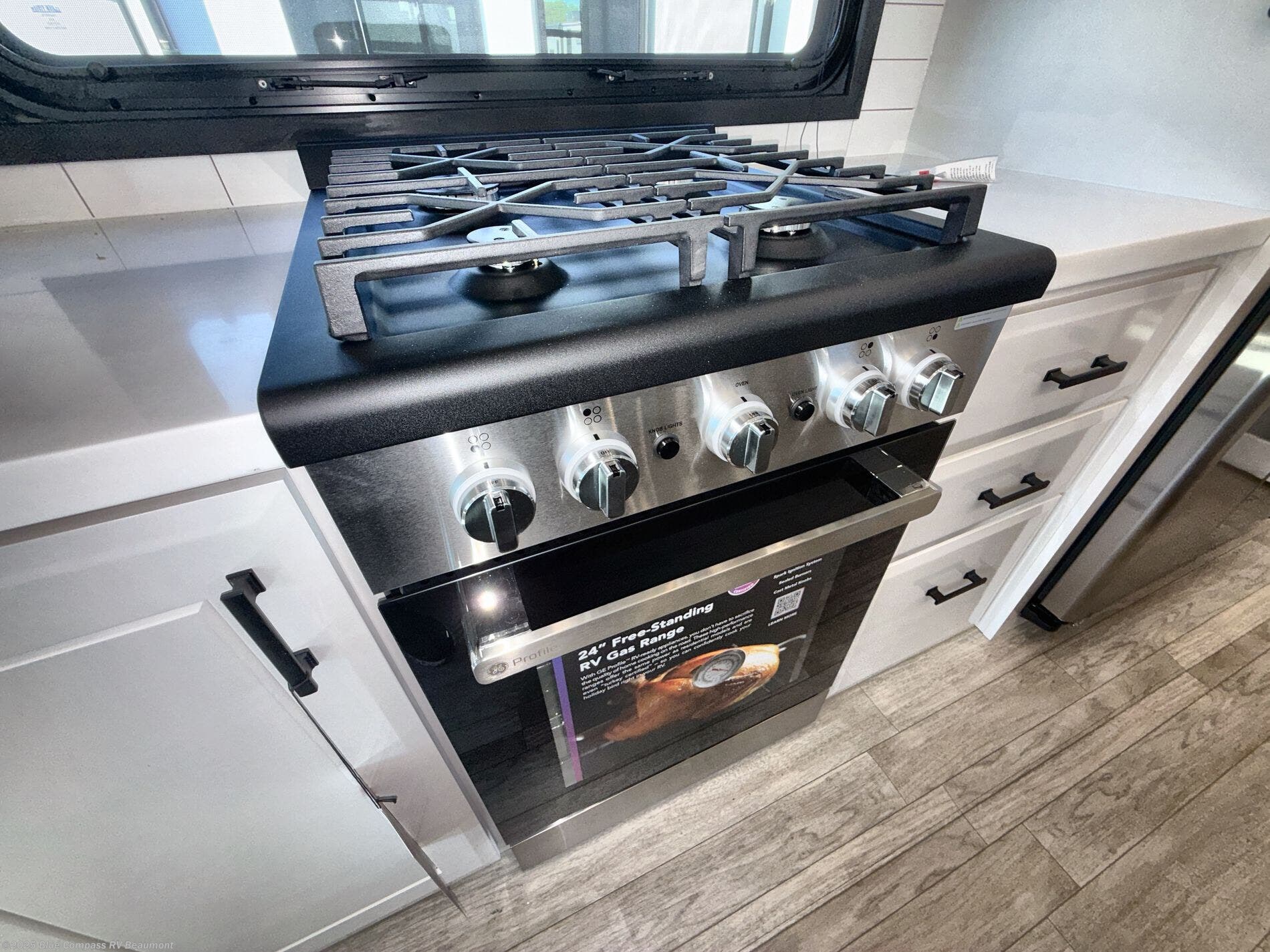 You can't go wrong with this fifth wheel that can sleep four! You will love how much space you have in the main living area thanks to the dual opposing slides, and there is a kitchen island here with a pull-out extension for added prep space. The convenient half bath is right off of the kitchen for quick restroom breaks, and you'll find a shoe garage and a wardrobe just as you enter the unit to keep the RV tidy. Head to the master bedroom for a rest on the king bed slide out, or you may want to watch a show on the 32" bedroom TV. The front master bath may be your favorite feature of this unit. Here, you'll find dual bath sinks, a walk-in shower with a seat, plus a spacious walk-in closet for your clothes. And don't overlook the exterior with its two power awnings, 32" exterior TV, and a Jayport with LP quick connect for your outdoor grill.
