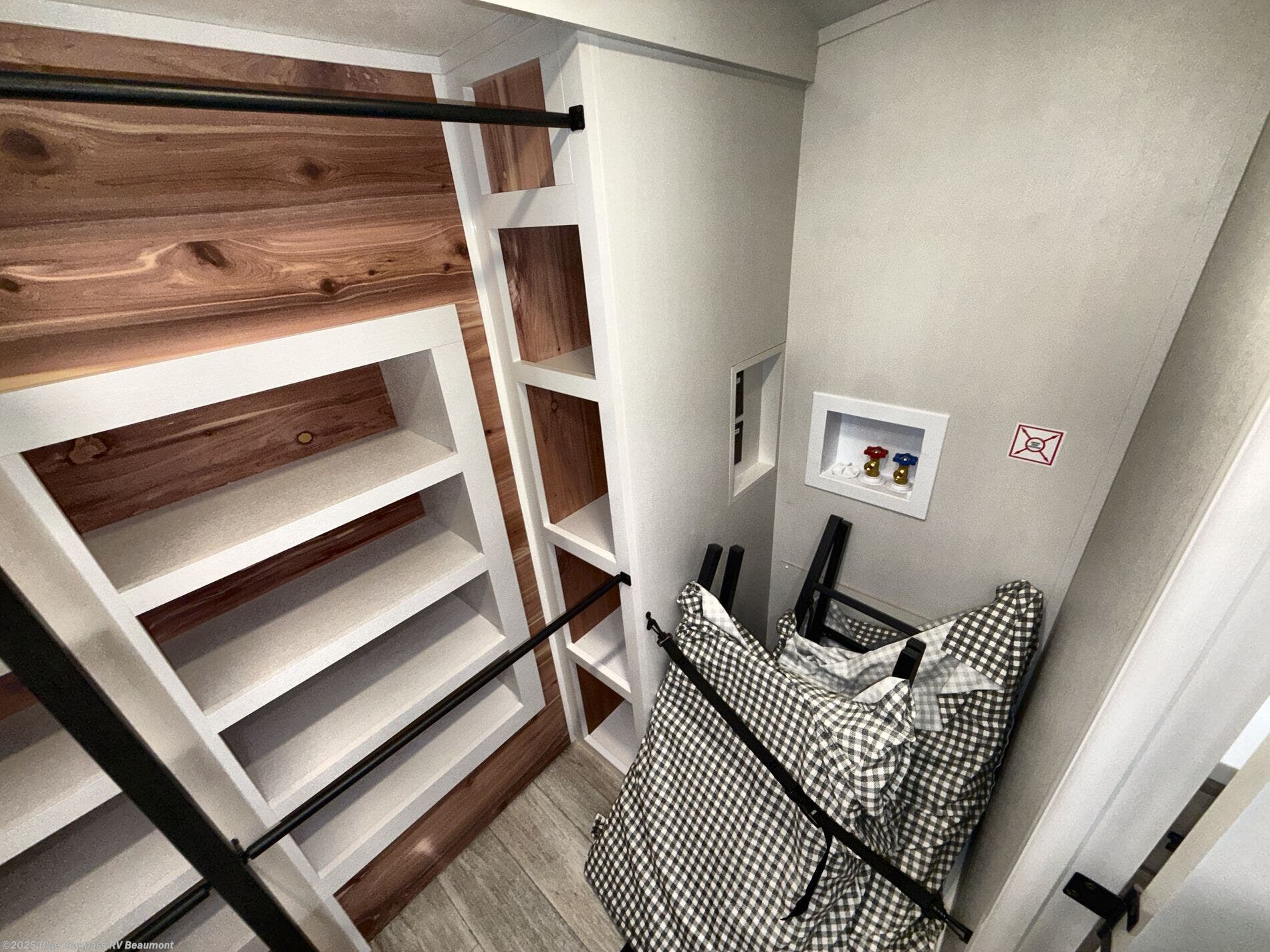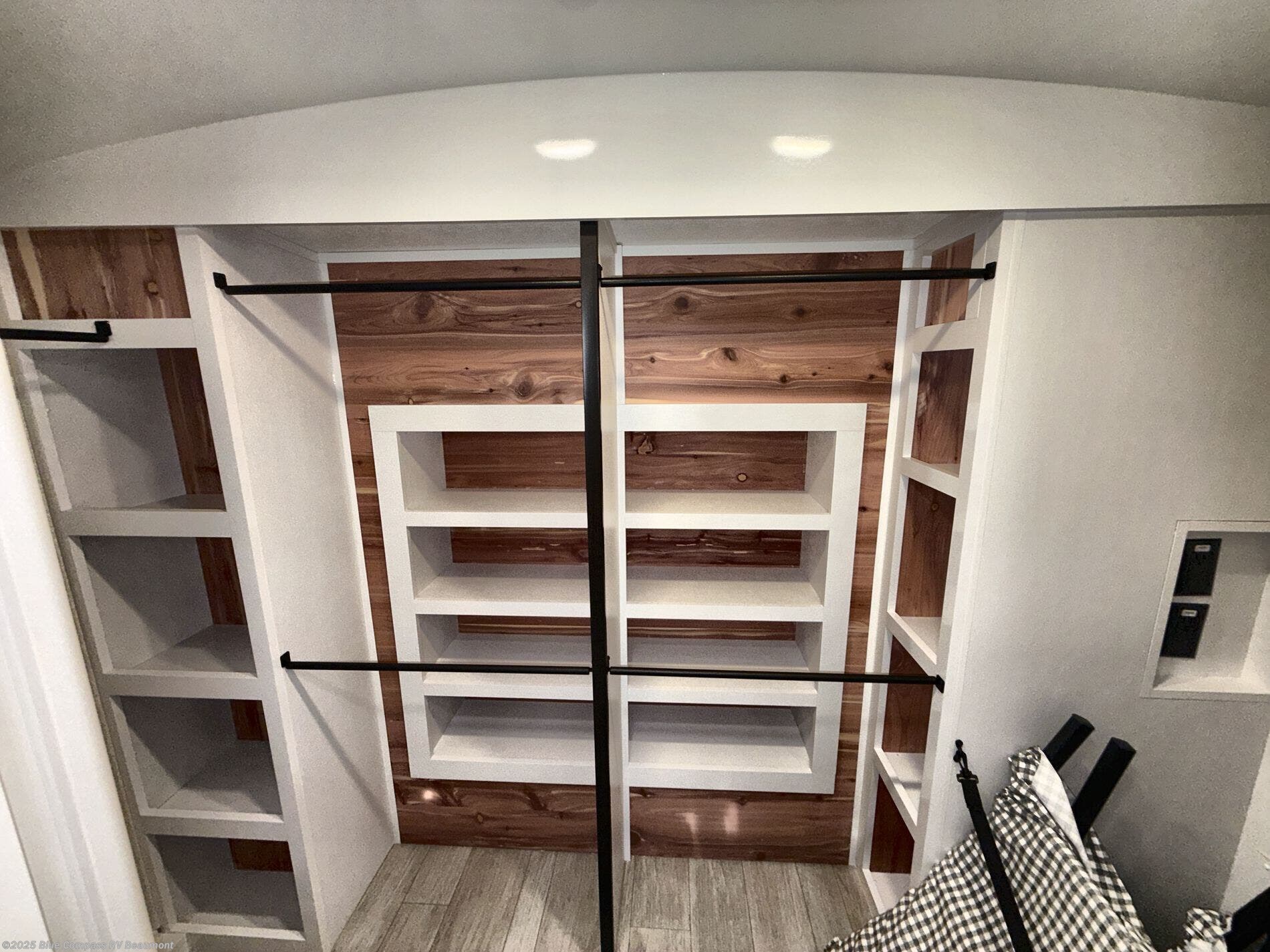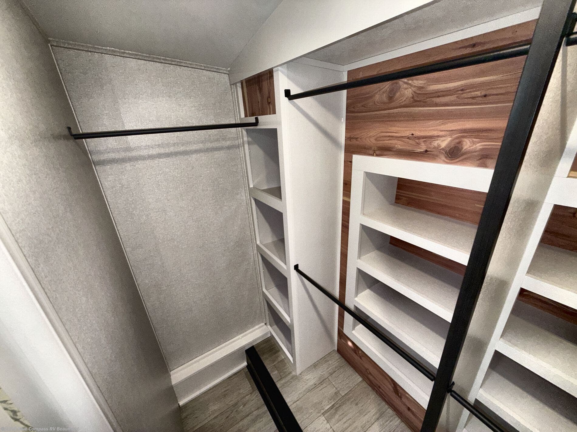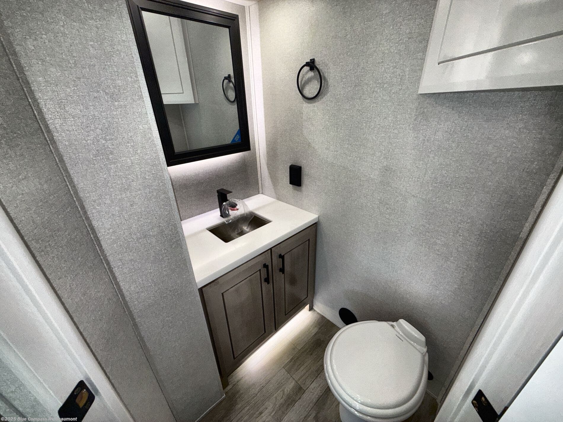 You can't go wrong with this fifth wheel that can sleep four! You will love how much space you have in the main living area thanks to the dual opposing slides, and there is a kitchen island here with a pull-out extension for added prep space. The convenient half bath is right off of the kitchen for quick restroom breaks, and you'll find a shoe garage and a wardrobe just as you enter the unit to keep the RV tidy. Head to the master bedroom for a rest on the king bed slide out, or you may want to watch a show on the 32" bedroom TV. The front master bath may be your favorite feature of this unit. Here, you'll find dual bath sinks, a walk-in shower with a seat, plus a spacious walk-in closet for your clothes. And don't overlook the exterior with its two power awnings, 32" exterior TV, and a Jayport with LP quick connect for your outdoor grill.