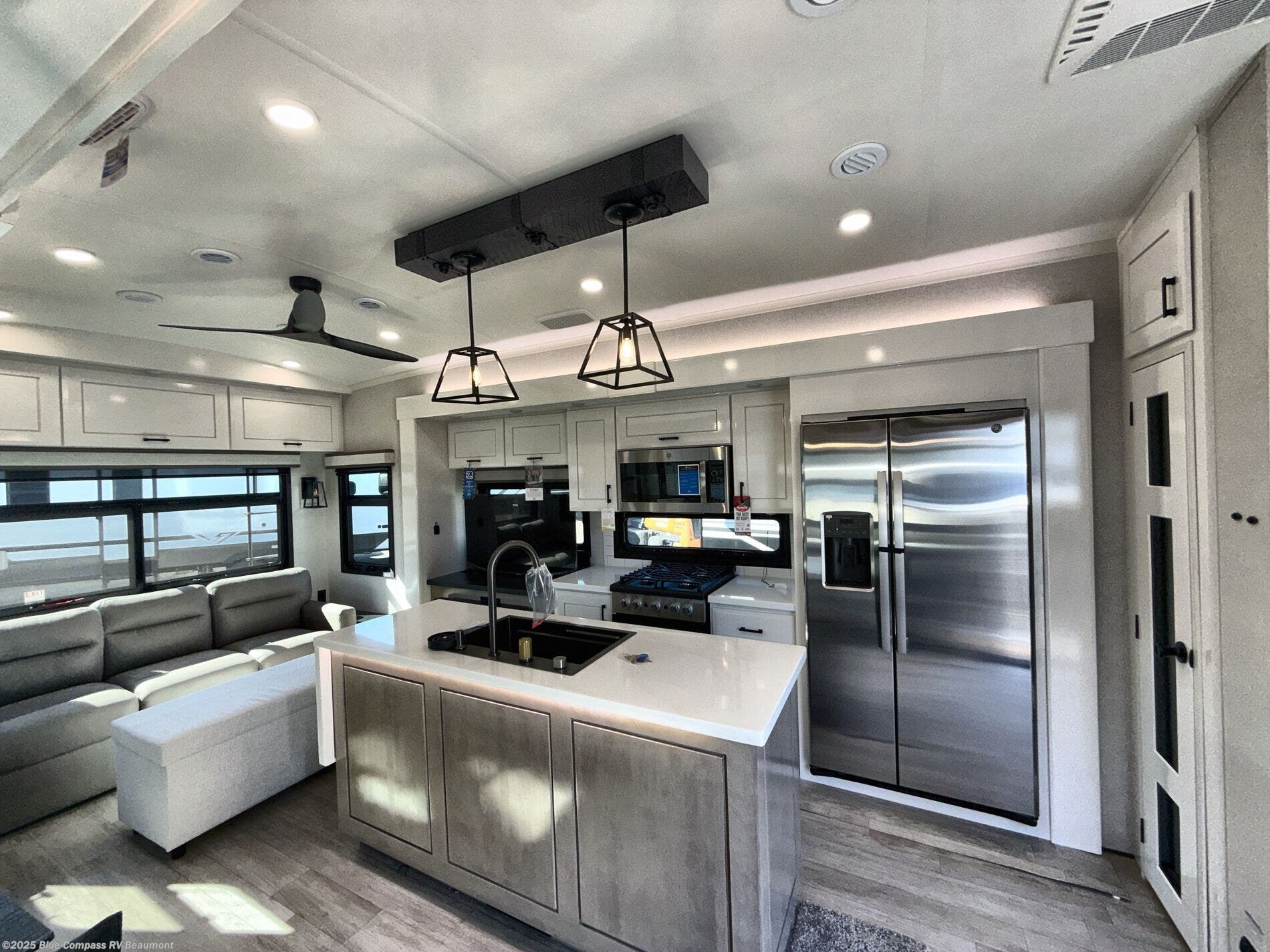 Each Pinnacle fifth wheel features Stronghold VBL lamination for the lightest, yet strongest construction in the RV industry. Add that to the Magnum Truss XL6 roof system and Climate Shield zero-degree tested weather protection and you'll be enjoying your fifth wheel for years to come. Some of the exterior conveniences you will appreciate are the Keyed-Alike lock system, the fully enclosed, universal docking center, and the 6-point hydraulic auto-leveling system for quick and easy set up. The 5 Star Handling Package will make towing a fifth wheel a walk in the park, and the two Whisper Quiet A/C units will keep you comfortable during the hot summer months. Inside, you'll enjoy the residential "Do it all" sink with pull-out kitchen faucet, glass rinse, and vegetable rinse, the handcrafted hardwood glazed cabinetry, the vinyl flooring throughout, plus many more comforts. There is even a central vacuum system, a wireless remote control system, USB ports throughout, plus many more conveniences to make each trip enjoyable.