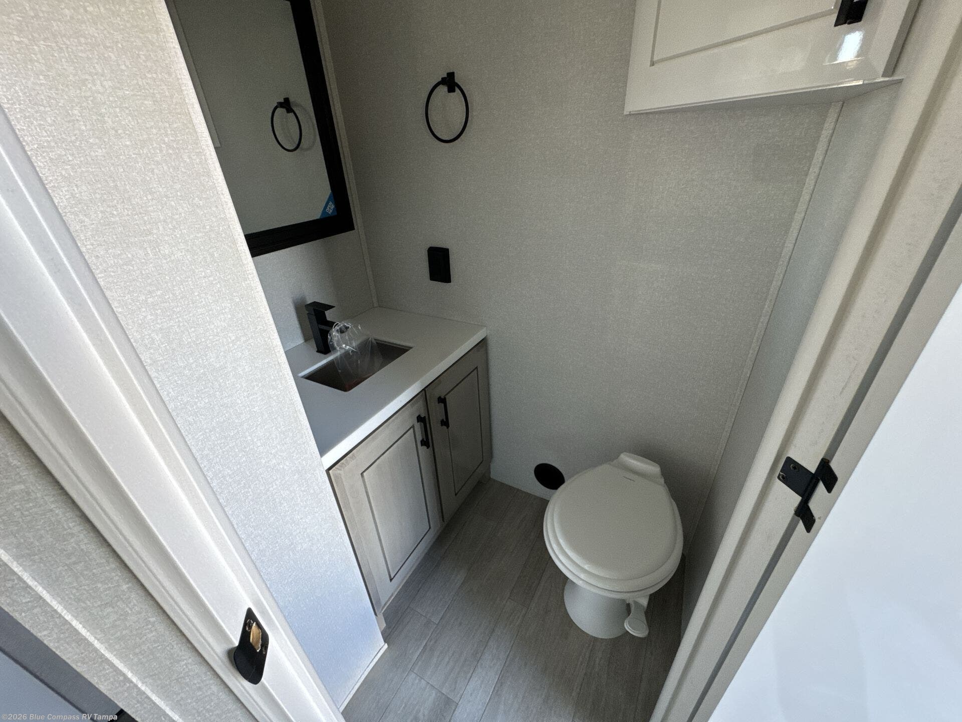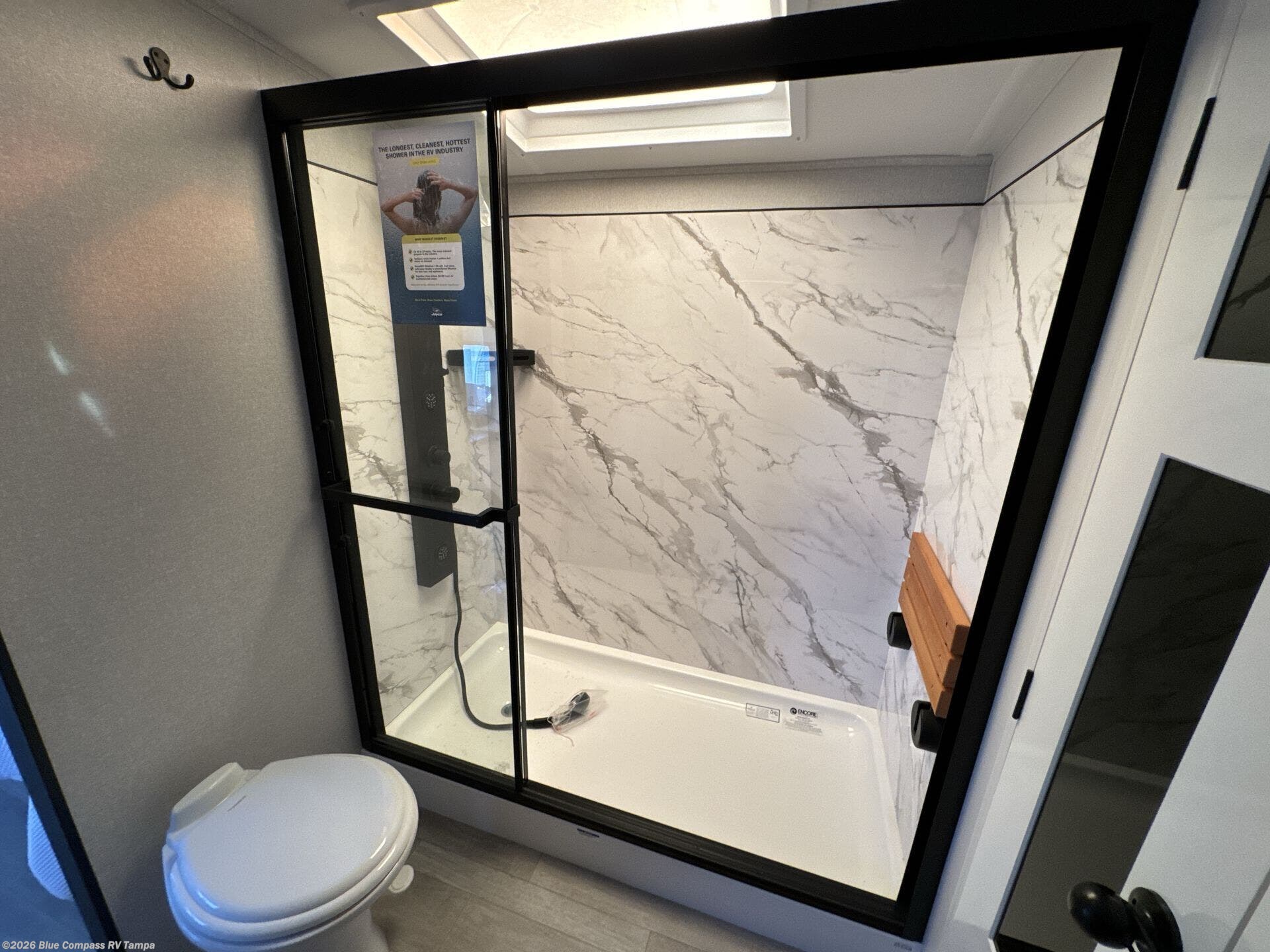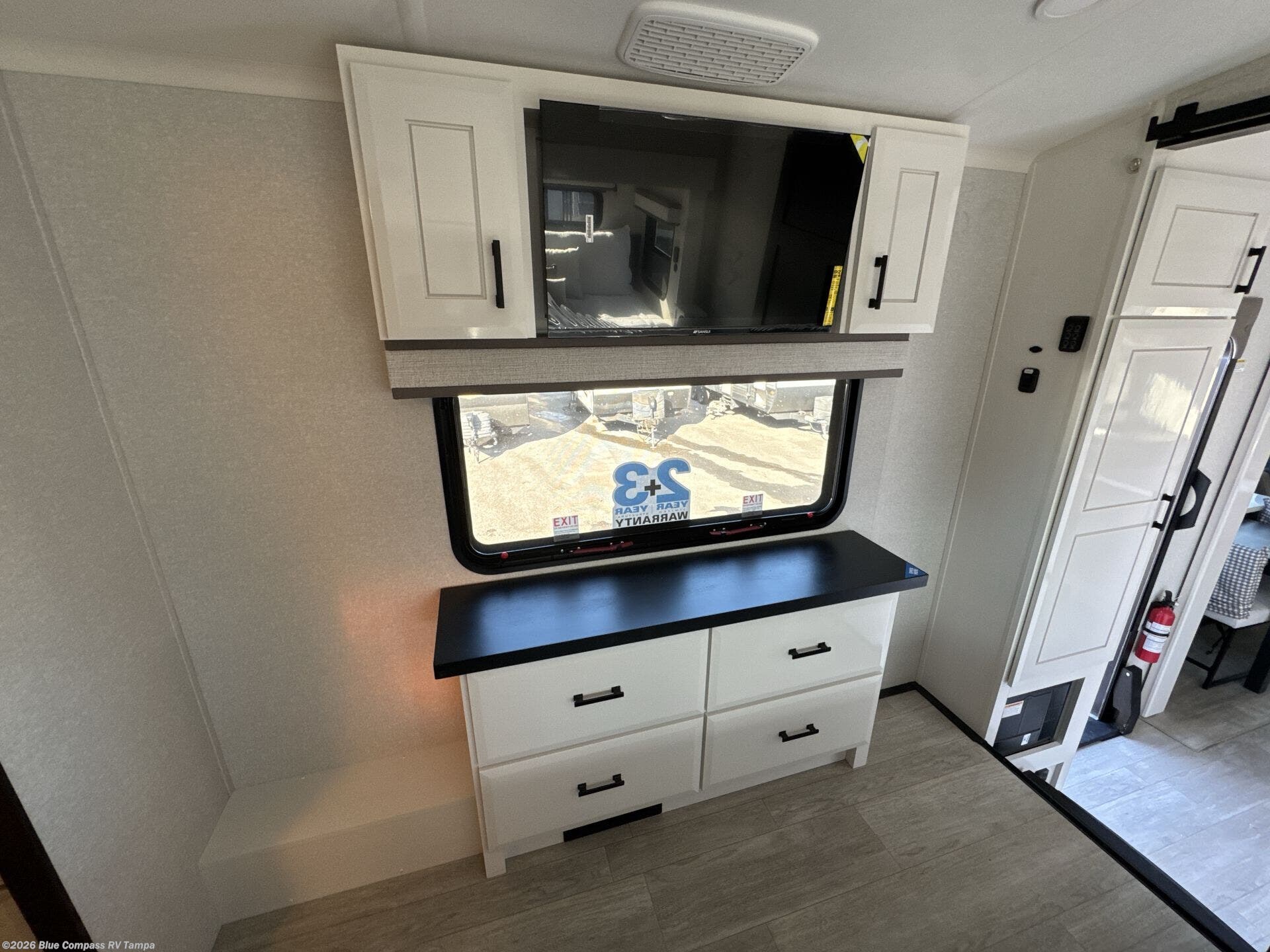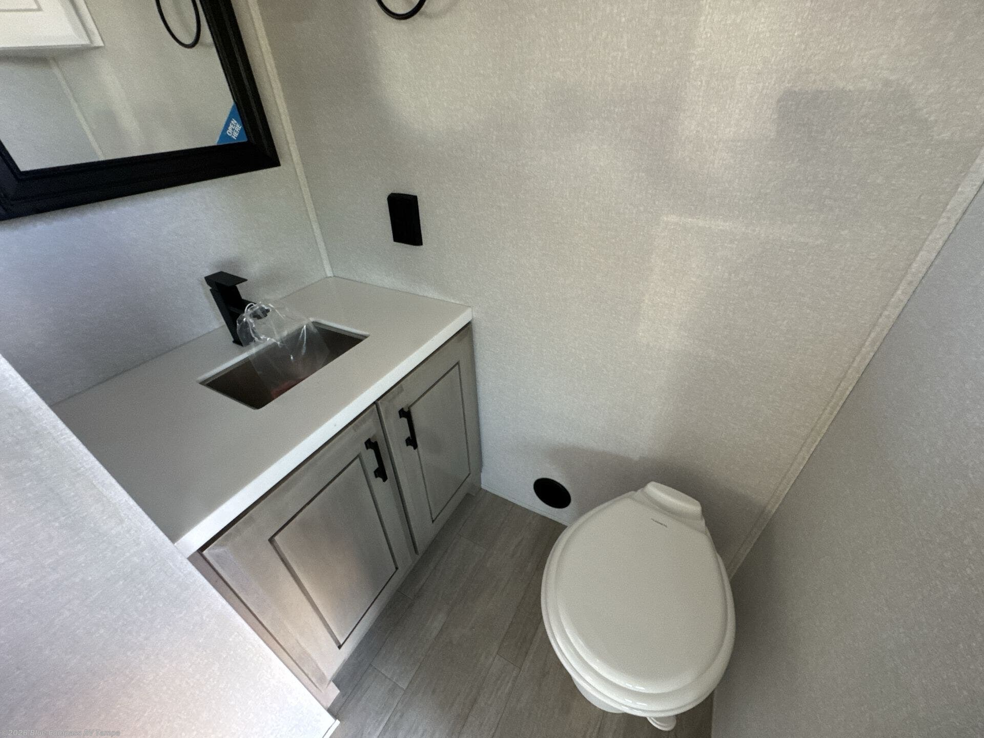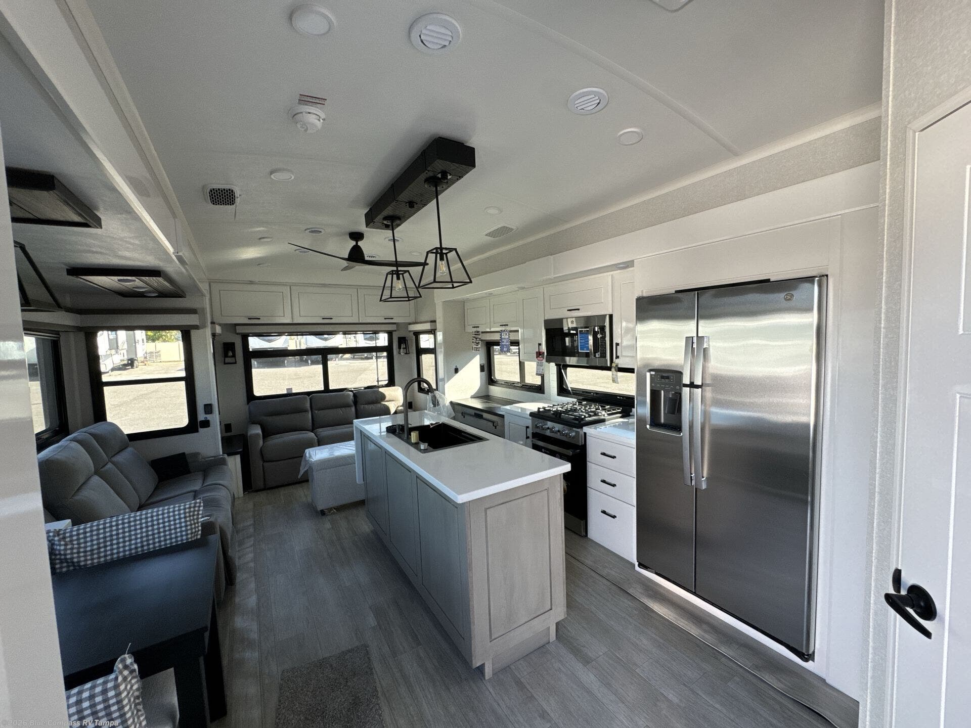 You can't go wrong with this fifth wheel that can sleep four! You will love how much space you have in the main living area thanks to the dual opposing slides, and there is a kitchen island here with a pull-out extension for added prep space. The convenient half bath is right off of the kitchen for quick restroom breaks, and you'll find a shoe garage and a wardrobe just as you enter the unit to keep the RV tidy. Head to the master bedroom for a rest on the king bed slide out, or you may want to watch a show on the 32" bedroom TV. The front master bath may be your favorite feature of this unit. Here, you'll find dual bath sinks, a walk-in shower with a seat, plus a spacious walk-in closet for your clothes. And don't overlook the exterior with its two power awnings, 32" exterior TV, and a Jayport with LP quick connect for your outdoor grill.
