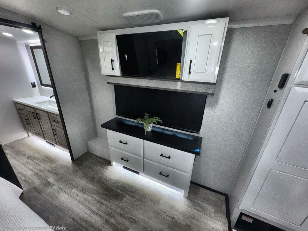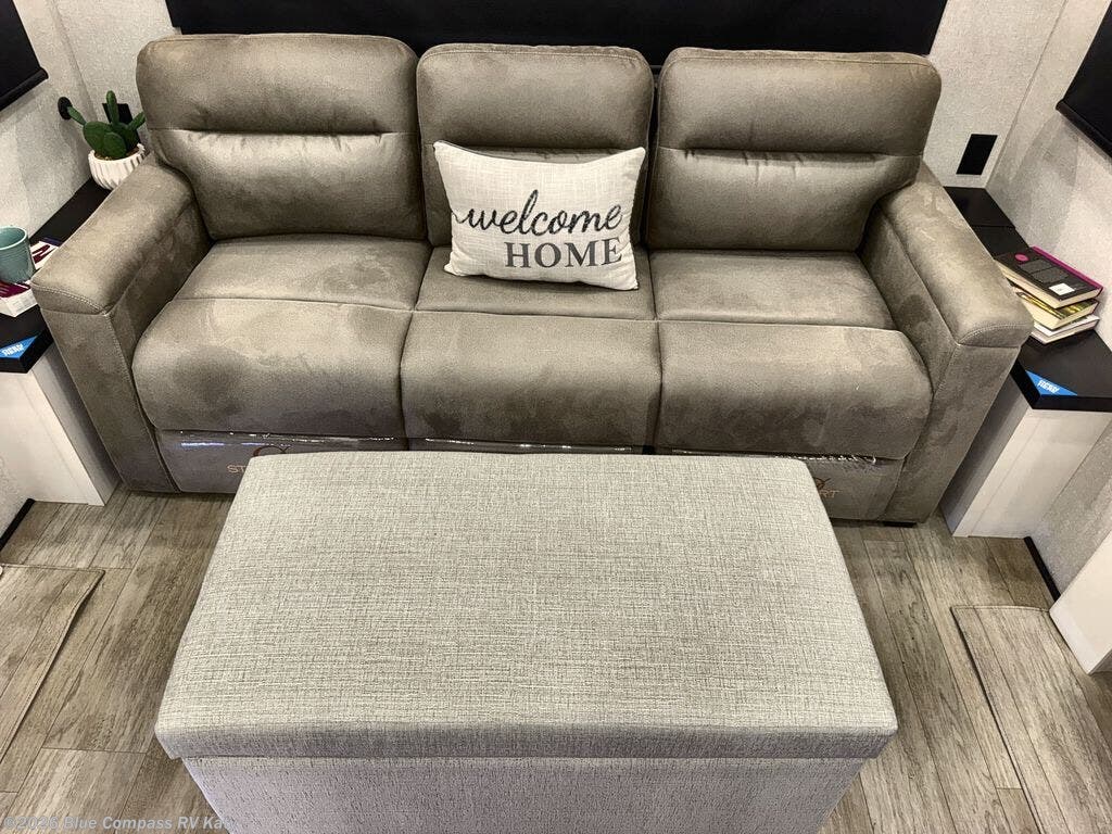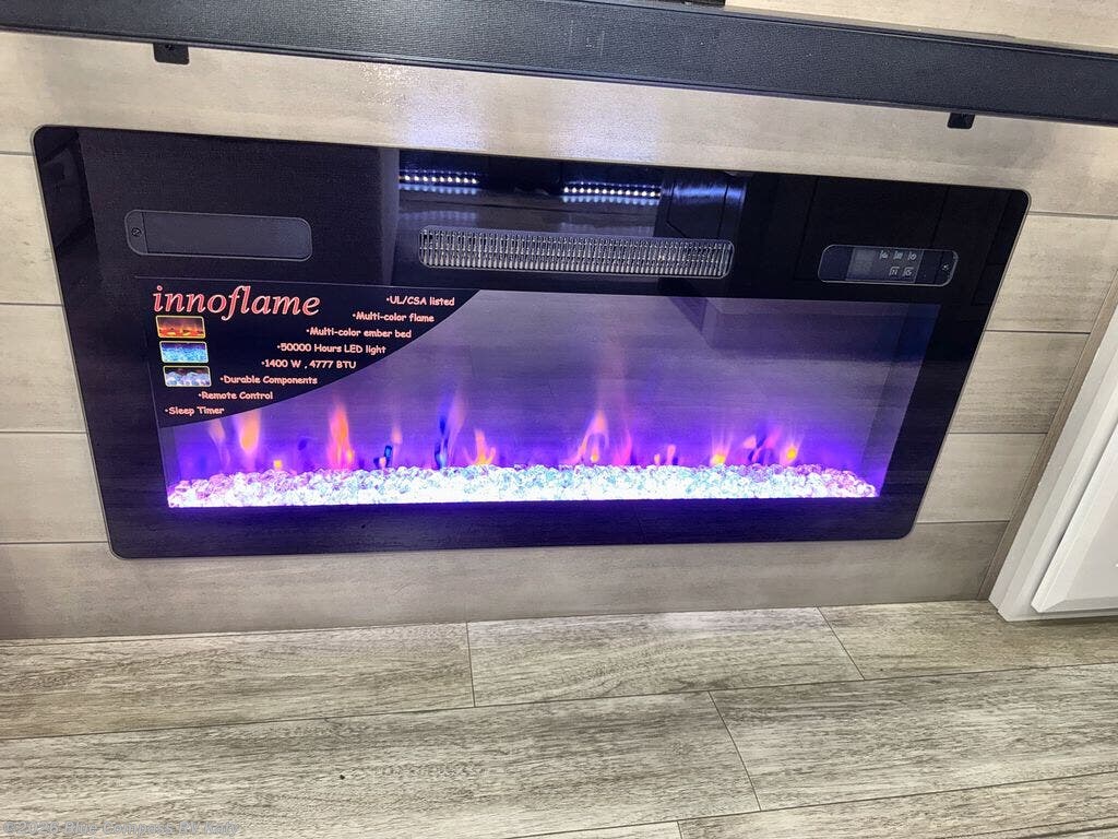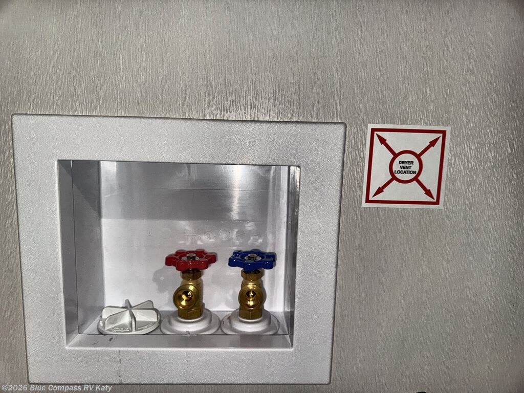 You can't go wrong with this fifth wheel that can sleep four! You will love how much space you have in the main living area thanks to the dual opposing slides, and there is a kitchen island here with a pull-out extension for added prep space. The convenient half bath is right off of the kitchen for quick restroom breaks, and you'll find a shoe garage and a wardrobe just as you enter the unit to keep the RV tidy. Head to the master bedroom for a rest on the king bed slide out, or you may want to watch a show on the 32" bedroom TV. The front master bath may be your favorite feature of this unit. Here, you'll find a spacious counter sink, a walk-in shower with a seat, plus a spacious walk-in closet for your clothes. And don't overlook the exterior with its two power awnings, 32" exterior TV, and a Jayport with LP quick connect for your outdoor grill.