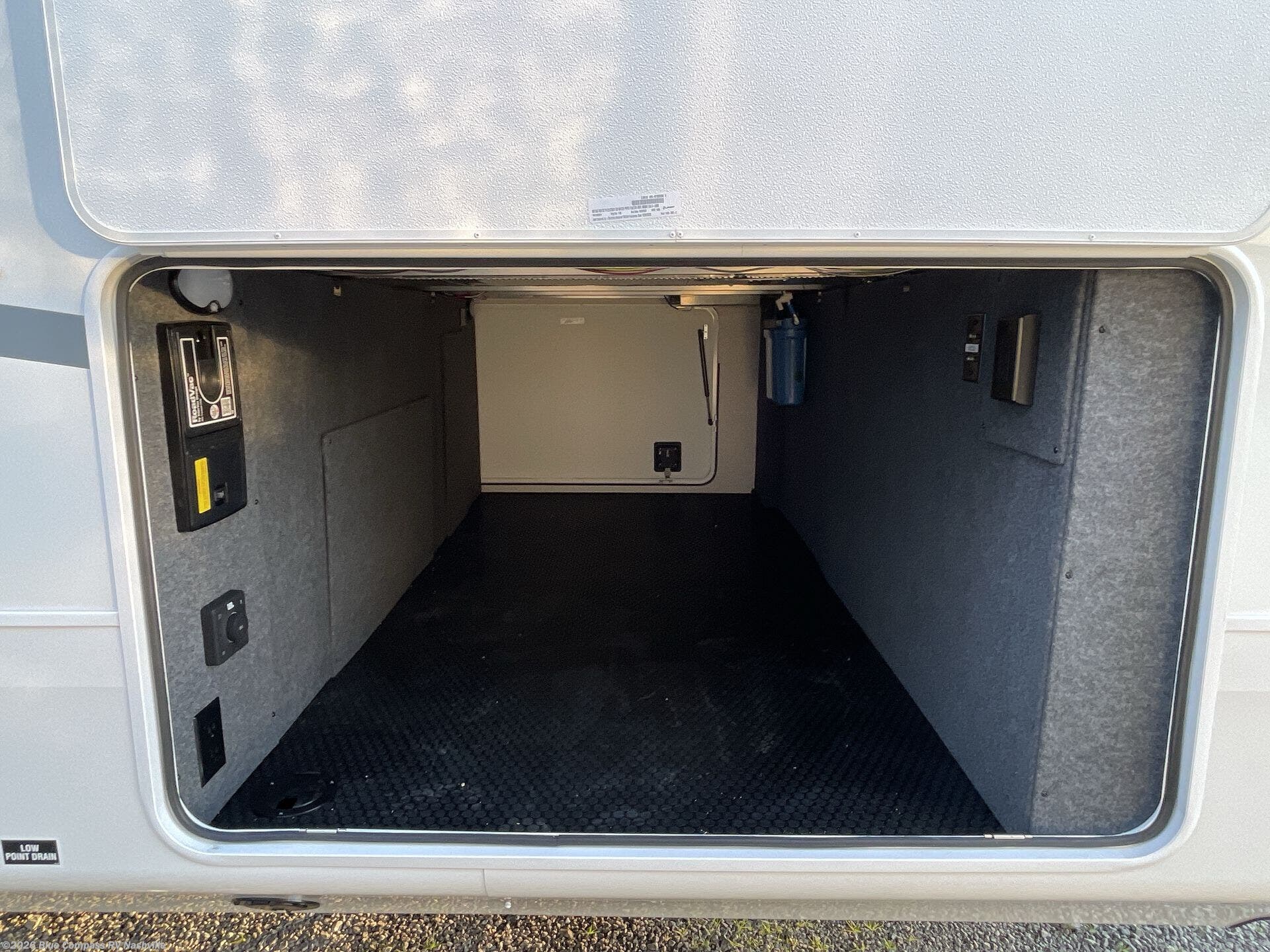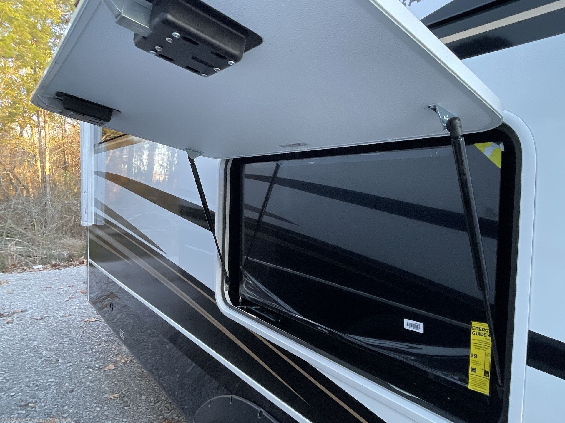 You can't go wrong with this fifth wheel that can sleep four! You will love how much space you have in the main living area thanks to the dual opposing slides, and there is a kitchen island here with a pull-out extension for added prep space. The convenient half bath is right off of the kitchen for quick restroom breaks, and you'll find a shoe garage and a wardrobe just as you enter the unit to keep the RV tidy. Head to the master bedroom for a rest on the king bed slide out, or you may want to watch a show on the 32" bedroom TV. The front master bath may be your favorite feature of this unit. Here, you'll find a spacious counter sink, a walk-in shower with a seat, plus a spacious walk-in closet for your clothes. And don't overlook the exterior with its two power awnings, 32" exterior TV, and a Jayport with LP quick connect for your outdoor grill.