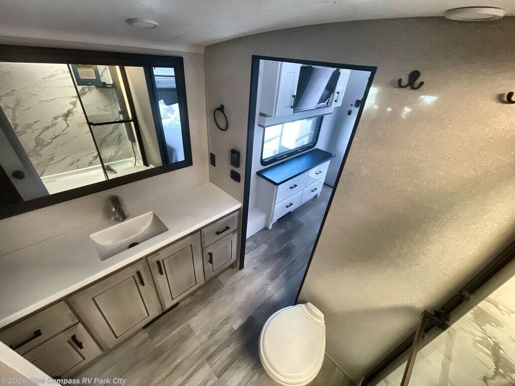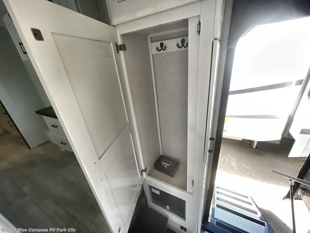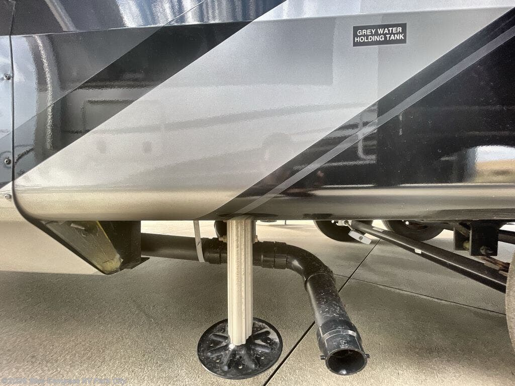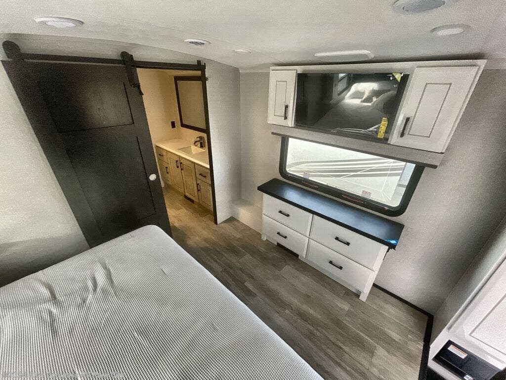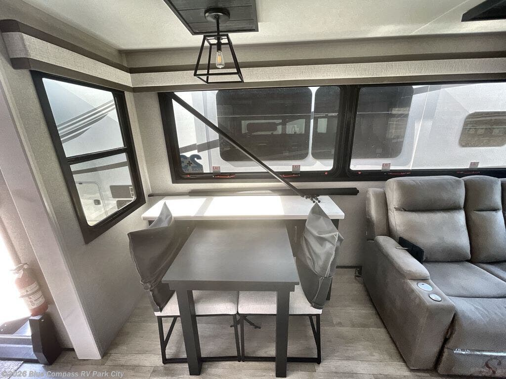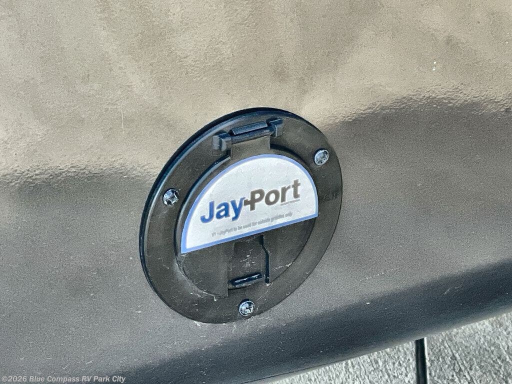You can't go wrong with this fifth wheel that can sleep four! You will love how much space you have in the main living area thanks to the dual opposing slides, and there is a kitchen island here with a pull-out extension for added prep space. The convenient half bath is right off of the kitchen for quick restroom breaks, and you'll find a shoe garage and a wardrobe just as you enter the unit to keep the RV tidy. Head to the master bedroom for a rest on the king bed slide out, or you may want to watch a show on the 32" bedroom TV. The front master bath may be your favorite feature of this unit. Here, you'll find a spacious counter sink, a walk-in shower with a seat, plus a spacious walk-in closet for your clothes. And don't overlook the exterior with its two power awnings, 32" exterior TV, and a Jayport with LP quick connect for your outdoor grill.