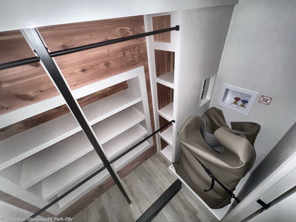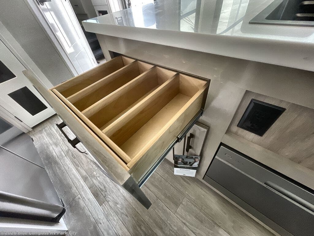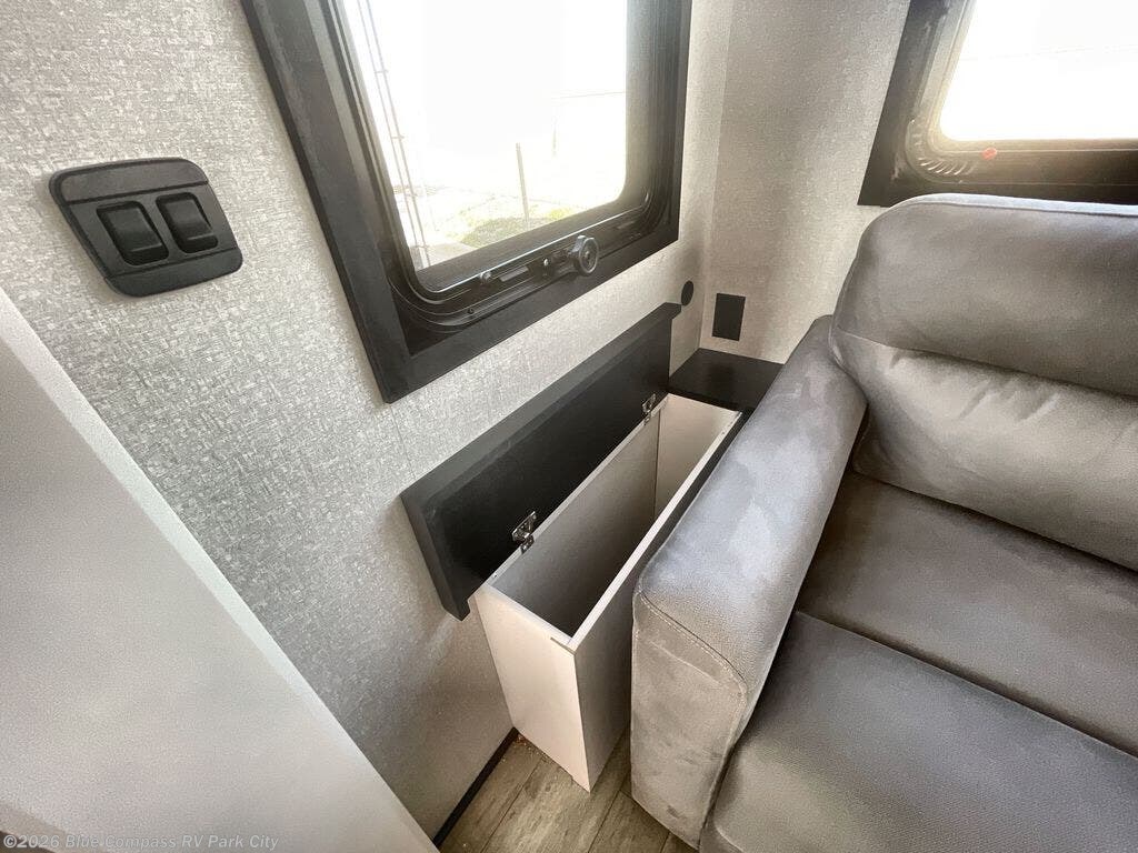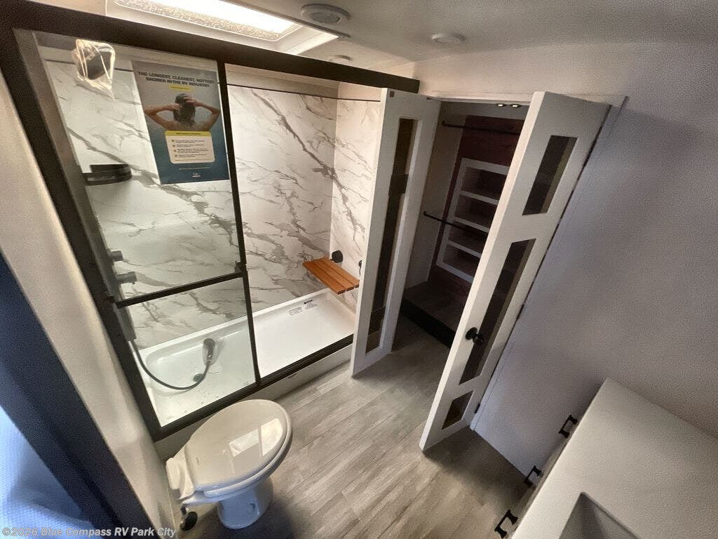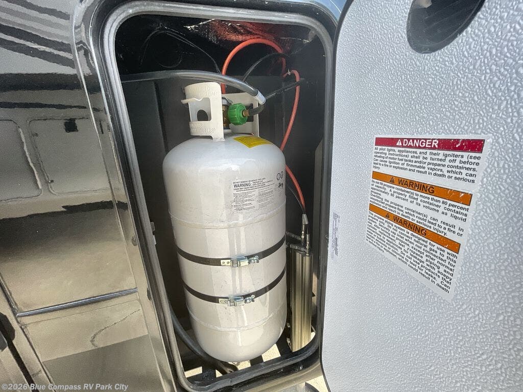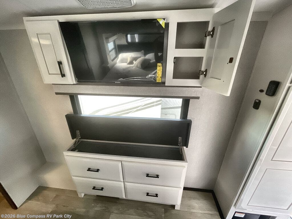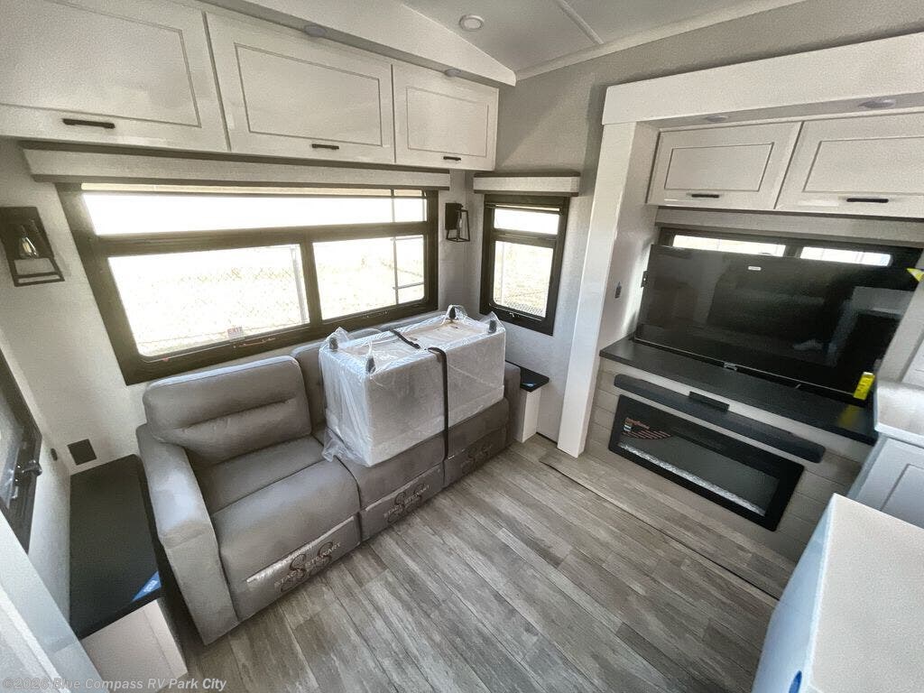 You can't go wrong with this fifth wheel that can sleep four! You will love how much space you have in the main living area thanks to the dual opposing slides, and there is a kitchen island here with a pull-out extension for added prep space. The convenient half bath is right off of the kitchen for quick restroom breaks, and you'll find a shoe garage and a wardrobe just as you enter the unit to keep the RV tidy. Head to the master bedroom for a rest on the king bed slide out, or you may want to watch a show on the 32" bedroom TV. The front master bath may be your favorite feature of this unit. Here, you'll find a spacious counter sink, a walk-in shower with a seat, plus a spacious walk-in closet for your clothes. And don't overlook the exterior with its two power awnings, 32" exterior TV, and a Jayport with LP quick connect for your outdoor grill.