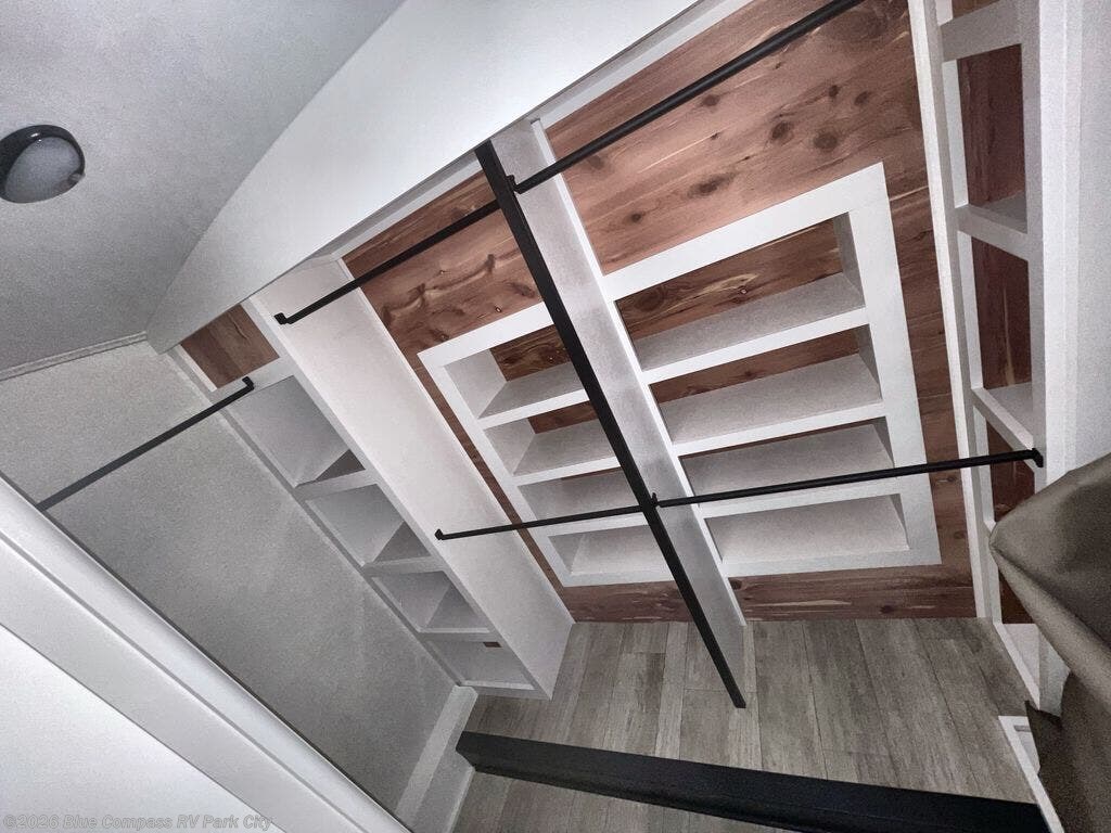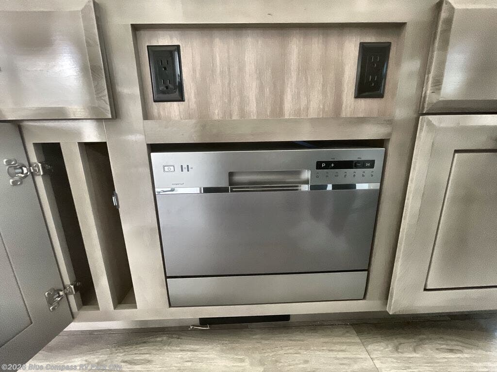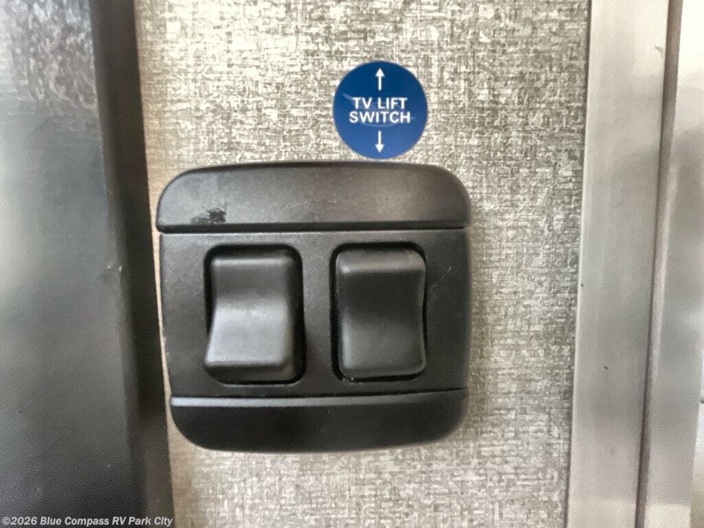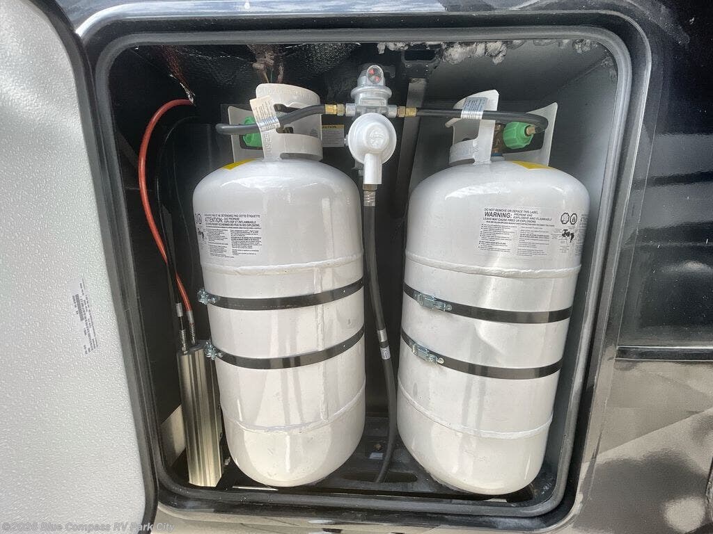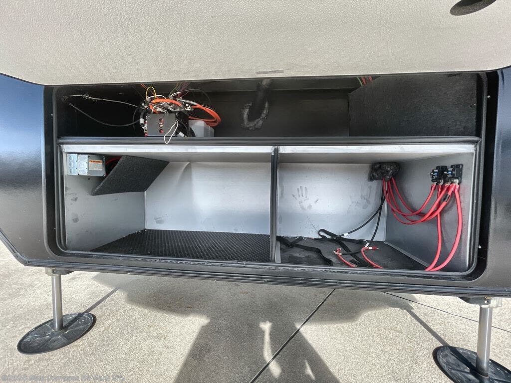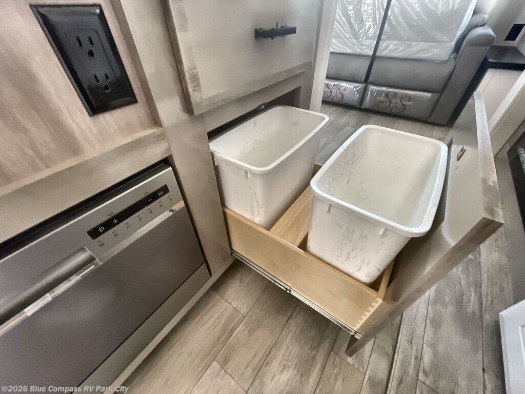 You can't go wrong with this fifth wheel that can sleep four! You will love how much space you have in the main living area thanks to the dual opposing slides, and there is a kitchen island here with a pull-out extension for added prep space. The convenient half bath is right off of the kitchen for quick restroom breaks, and you'll find a shoe garage and a wardrobe just as you enter the unit to keep the RV tidy. Head to the master bedroom for a rest on the king bed slide out, or you may want to watch a show on the 32" bedroom TV. The front master bath may be your favorite feature of this unit. Here, you'll find a spacious counter sink, a walk-in shower with a seat, plus a spacious walk-in closet for your clothes. And don't overlook the exterior with its two power awnings, 32" exterior TV, and a Jayport with LP quick connect for your outdoor grill.
