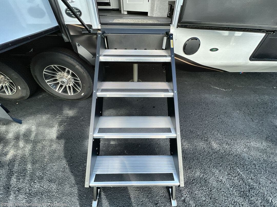 You can't go wrong with this fifth wheel that can sleep four! You will love how much space you have in the main living area thanks to the dual opposing slides, and there is a kitchen island here with a pull-out extension for added prep space. The convenient half bath is right off of the kitchen for quick restroom breaks, and you'll find a shoe garage and a wardrobe just as you enter the unit to keep the RV tidy. Head to the master bedroom for a rest on the king bed slide out, or you may want to watch a show on the 32" bedroom TV. The front master bath may be your favorite feature of this unit. Here, you'll find a spacious counter sink, a walk-in shower with a seat, plus a spacious walk-in closet for your clothes. And don't overlook the exterior with its two power awnings, 32" exterior TV, and a Jayport with LP quick connect for your outdoor grill.