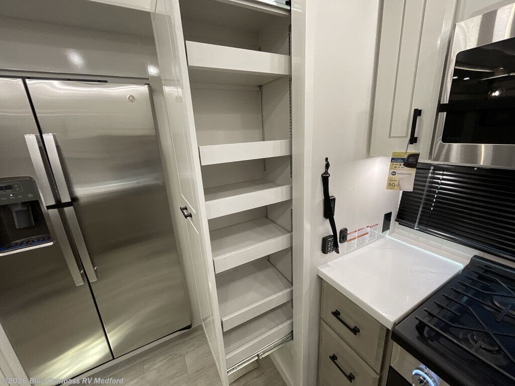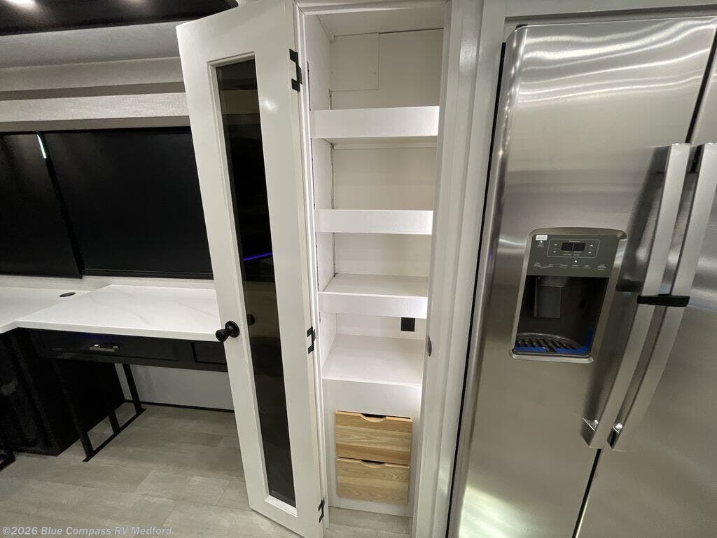Triples slides, a desk/coffee bar, fireplace, and a huge master bath in front all indicate the kind of vacation you will experience in this Pinnacle Fifth Wheel! As you enter, a convenient half bath is located straight ahead. Slightly to your left, a nice seating area for gathering with family or friends to relax and watch TV, enjoy the fireplace while reading a book or watching a movie, and the dining table with chairs. The dinette slide also houses a 21 cu. ft. residential refrigerator and pantry. The rear kitchen features a u-shaped counter, all the appliances you need to cook like at home, even a pull-out butcher block space for chopping up your veggies. Back through and up the steps to your right in front, the master bedroom will make you feel like royalty with its king bed, plus luxurious full rear bath. A huge vanity with dual bath sinks will allow you both to get ready at the same time, plus there is a walk-in shower with a seat for added convenience. Speaking of walk-in, you will also love the spacious walk-in closet that includes washer/dryer prep.