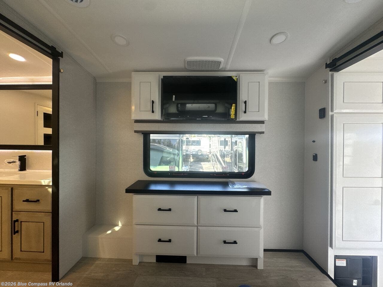 Triples slides, a desk/coffee bar, fireplace, and a huge master bath in front all indicate the kind of vacation you will experience in this Pinnacle Fifth Wheel! As you enter, a convenient half bath is located straight ahead. Slightly to your left, a nice seating area for gathering with family or friends to relax and watch TV, enjoy the fireplace while reading a book or watching a movie, and the dining table with chairs. The dinette slide also houses a 21 cu. ft. residential refrigerator and pantry. The rear kitchen features a u-shaped counter, all the appliances you need to cook like at home, even a pull-out butcher block space for chopping up your veggies. Back through and up the steps to your right in front, the master bedroom will make you feel like royalty with its king bed, plus luxurious full rear bath. A huge vanity with dual bath sinks will allow you both to get ready at the same time, plus there is a walk-in shower with a seat for added convenience. Speaking of walk-in, you will also love the spacious walk-in closet that includes washer/dryer prep.