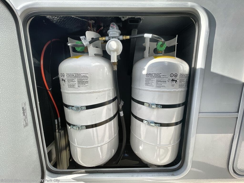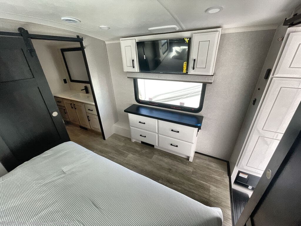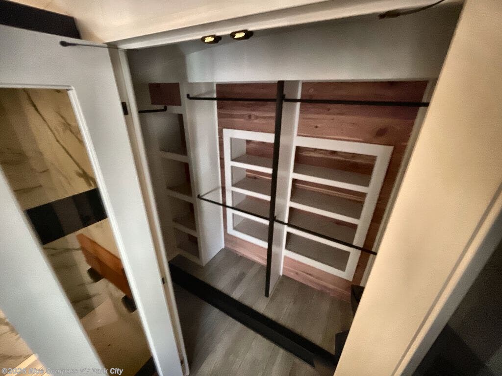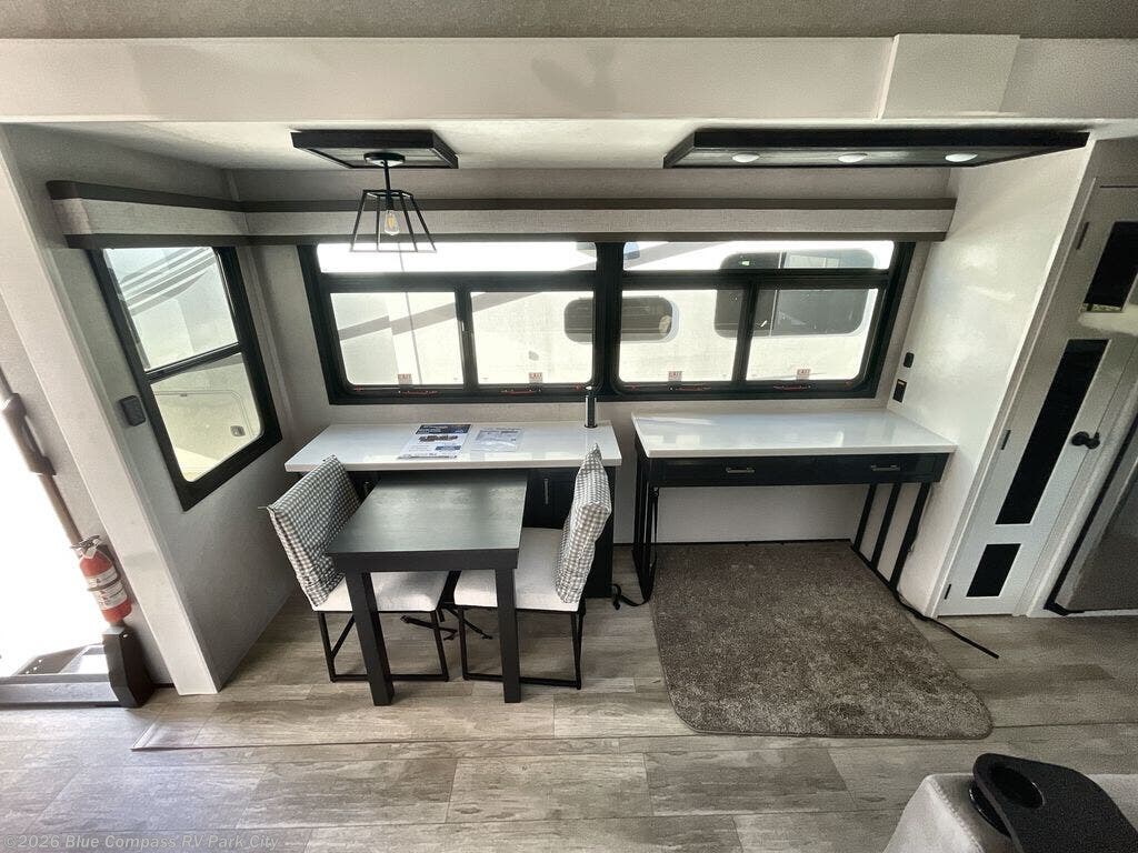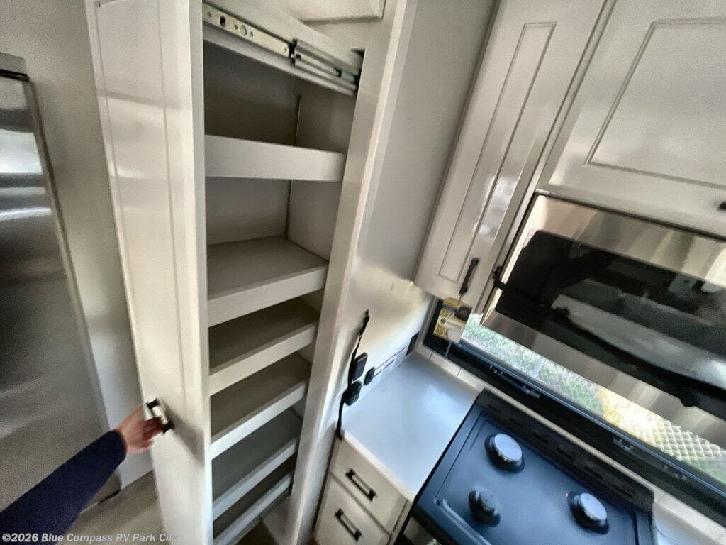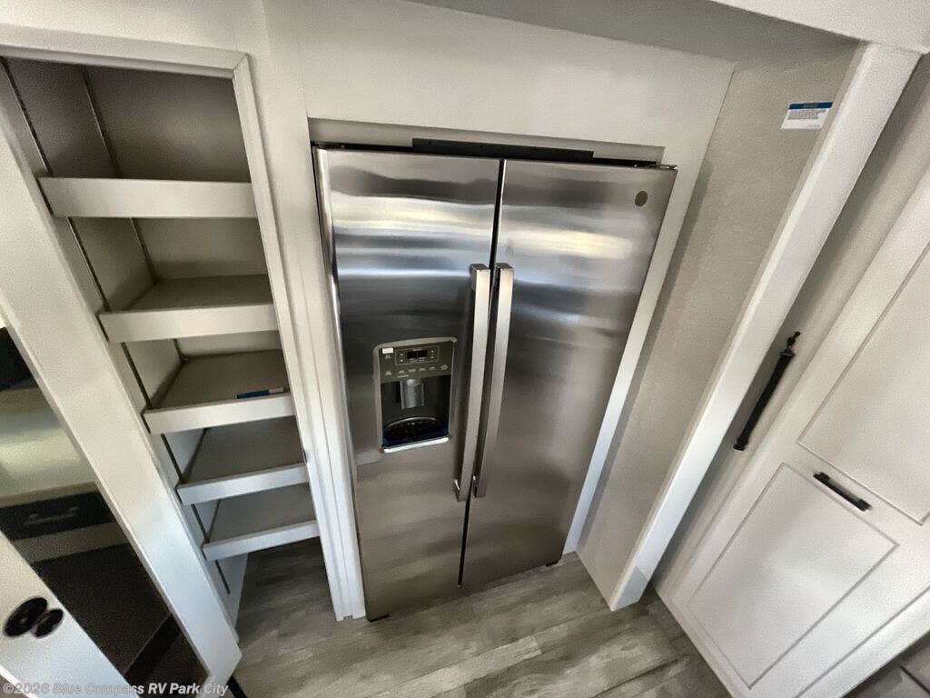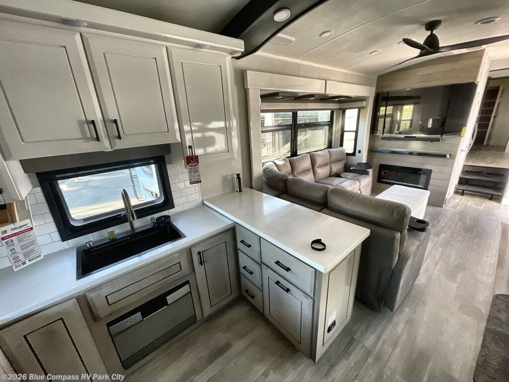 Triples slides, a desk/coffee bar, fireplace, and a huge master bath in front all indicate the kind of vacation you will experience in this Pinnacle Fifth Wheel! As you enter, a convenient half bath is located straight ahead. Slightly to your left, a nice seating area for gathering with family or friends to relax and watch TV, enjoy the fireplace while reading a book or watching a movie, and the dining table with chairs. The dinette slide also houses a 21 cu. ft. residential refrigerator and pantry. The rear kitchen features a u-shaped counter, all the appliances you need to cook like at home, even a pull-out butcher block space for chopping up your veggies. Back through and up the steps to your right in front, the master bedroom will make you feel like royalty with its king bed, plus luxurious full rear bath. A huge vanity with dual bath sinks will allow you both to get ready at the same time, plus there is a walk-in shower with a seat for added convenience. Speaking of walk-in, you will also love the spacious walk-in closet that includes washer/dryer prep.