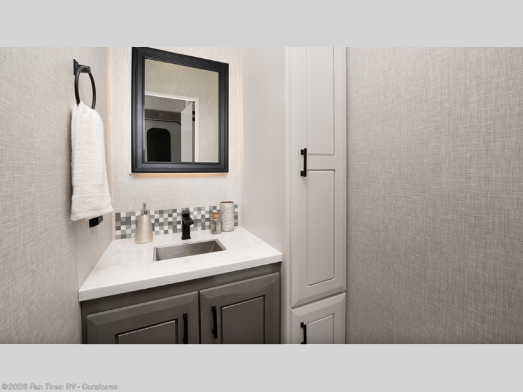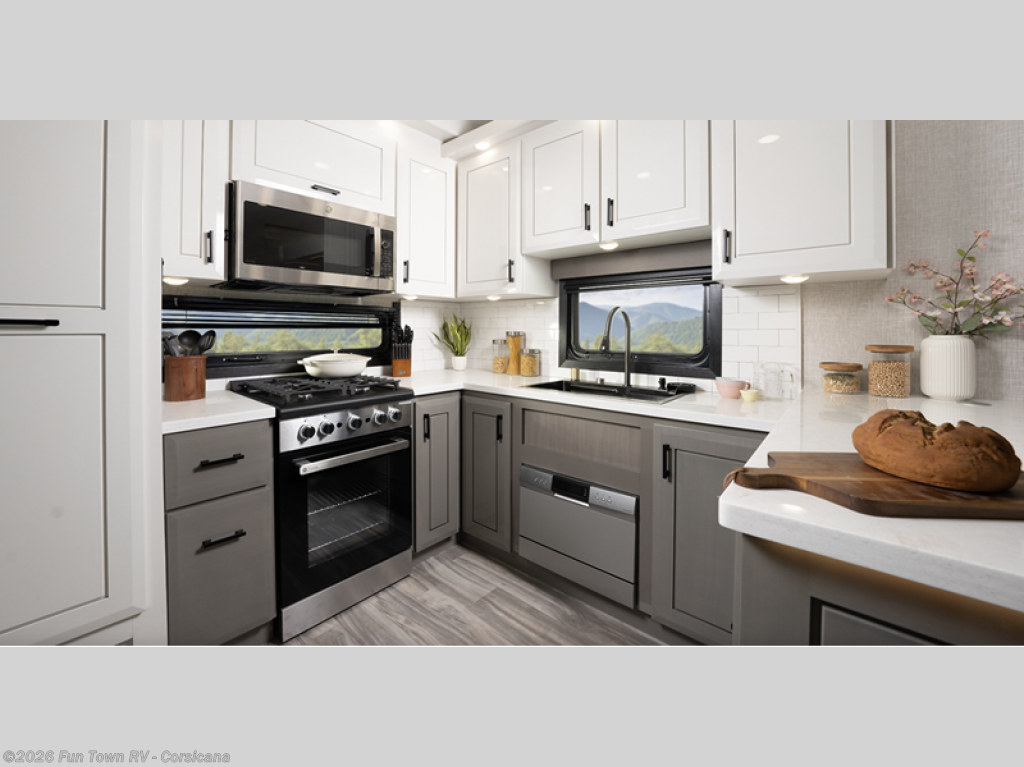 Triples slides, a desk/coffee bar, fireplace, and a huge master bath in front all indicate the kind of vacation you will experience in this Pinnacle Fifth Wheel! As you enter, a convenient half bath is located straight ahead. Slightly to your left, a nice seating area for gathering with family or friends to relax and watch TV, enjoy the fireplace while reading a book or watching a movie, and the dining table with chairs. The dinette slide also houses a 21 cu. ft. residential refrigerator and pantry. The rear kitchen features a u-shaped counter, all the appliances you need to cook like at home, even a pull-out butcher block space for chopping up your veggies. Back through and up the steps to your right in front, the master bedroom will make you feel like royalty with its king bed, plus luxurious full rear bath. A huge vanity with dual bath sinks will allow you both to get ready at the same time, plus there is a walk-in shower with a seat for added convenience. Speaking of walk-in, you will also love the spacious walk-in closet that includes washer/dryer prep.