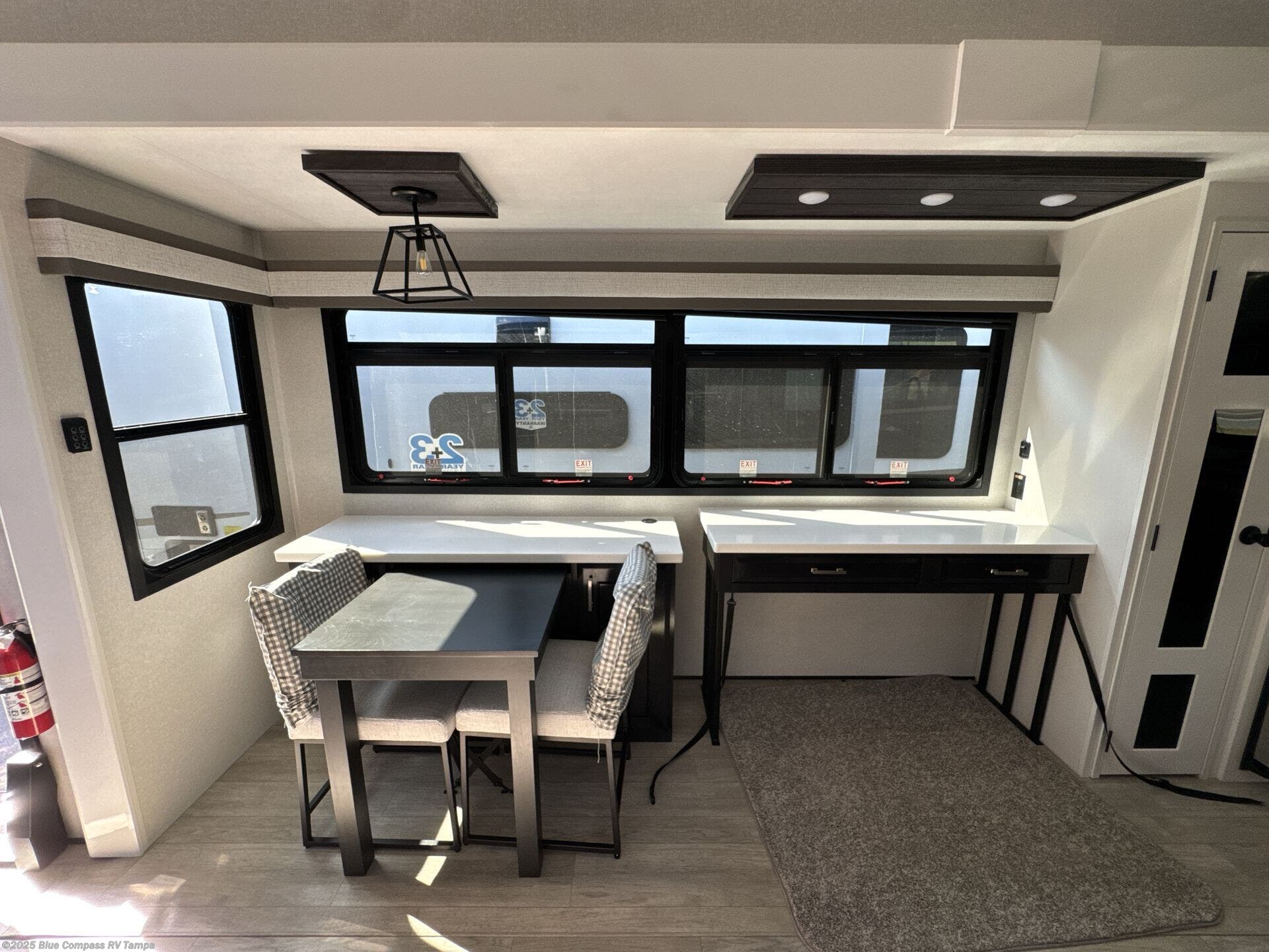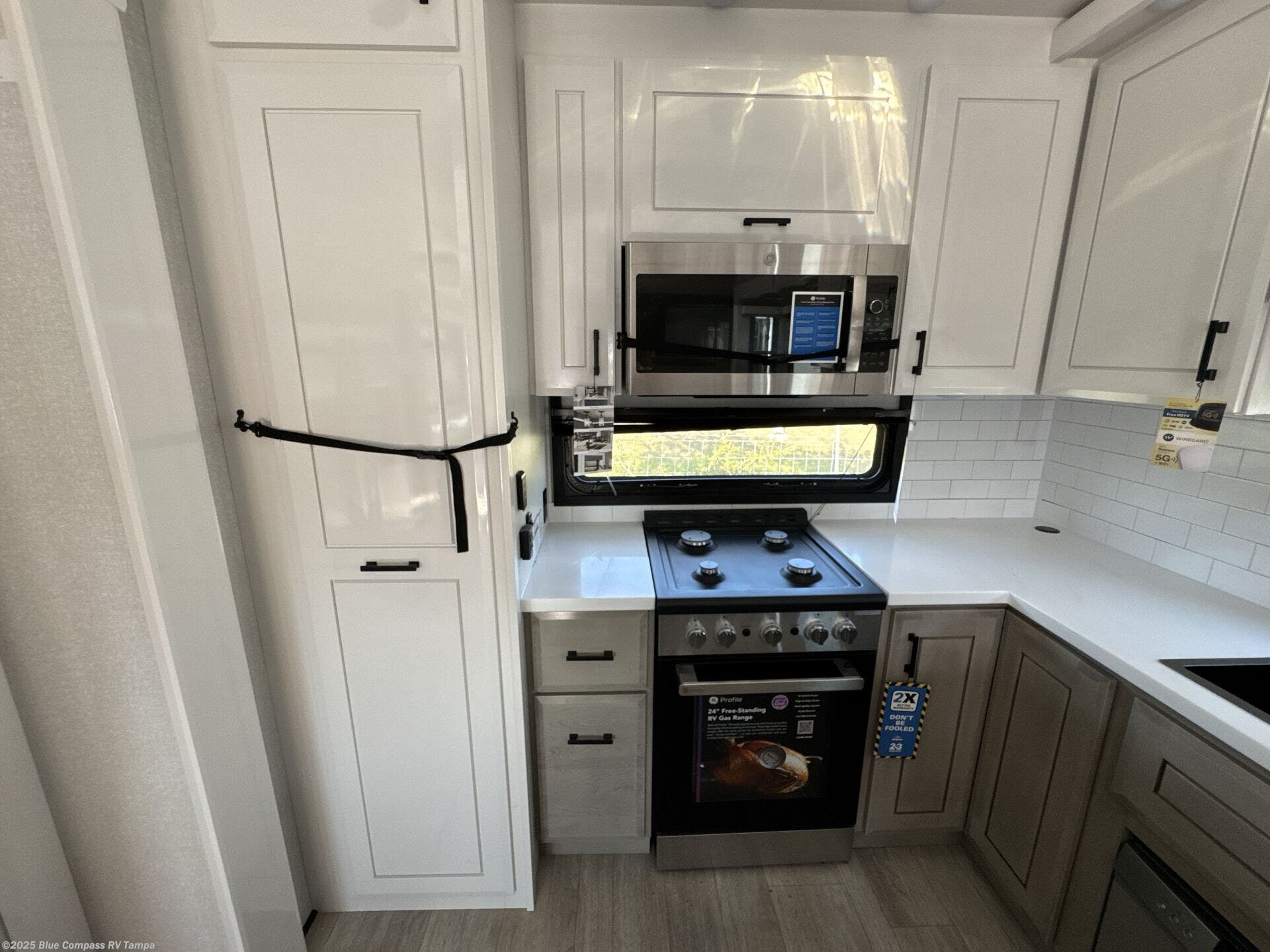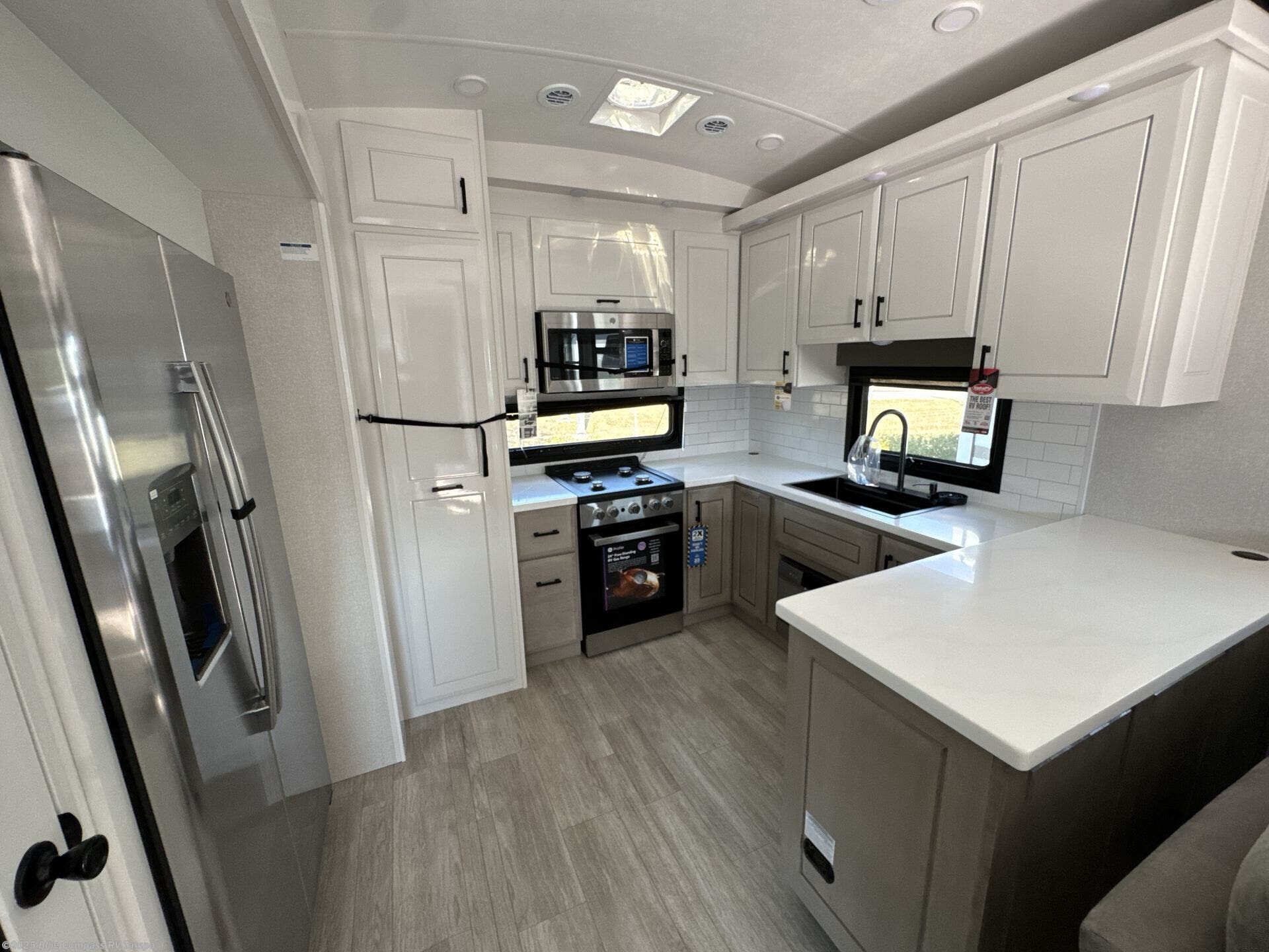 Triples slides, a desk/coffee bar, fireplace, and a huge master bath in front all indicate the kind of vacation you will experience in this Pinnacle Fifth Wheel! As you enter, a convenient half bath is located straight ahead. Slightly to your left, a nice seating area for gathering with family or friends to relax and watch TV, enjoy the fireplace while reading a book or watching a movie, and the dining table with chairs. The dinette slide also houses a 21 cu. ft. residential refrigerator and pantry. The rear kitchen features a u-shaped counter, all the appliances you need to cook like at home, even a pull-out butcher block space for chopping up your veggies. Back through and up the steps to your right in front, the master bedroom will make you feel like royalty with its king bed, plus luxurious full rear bath. A huge vanity with dual bath sinks will allow you both to get ready at the same time, plus there is a walk-in shower with a seat for added convenience. Speaking of walk-in, you will also love the spacious walk-in closet that includes washer/dryer prep.