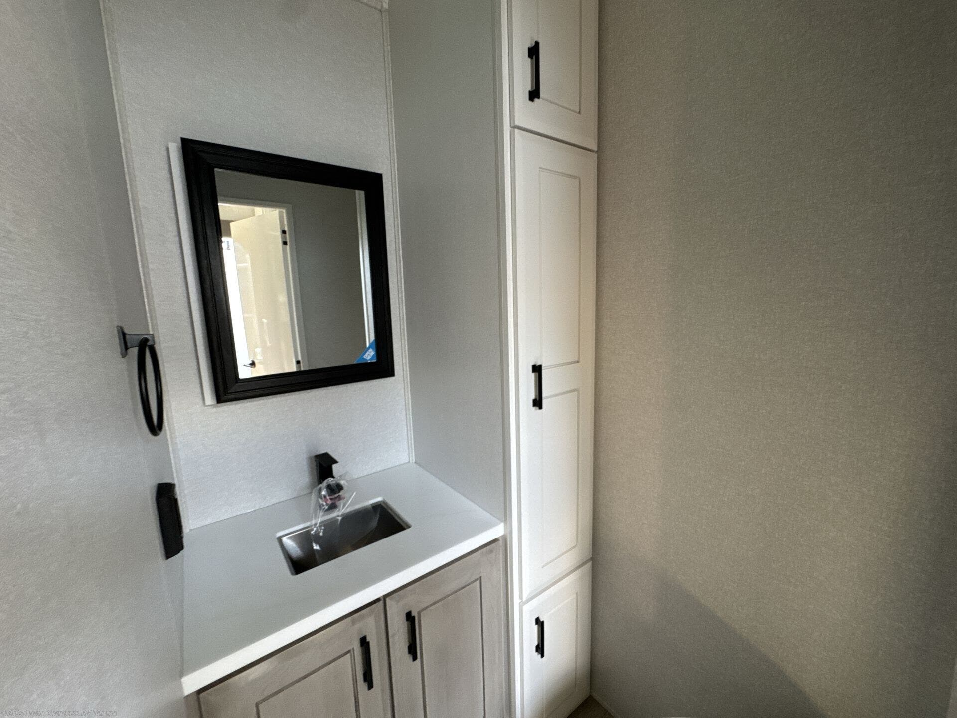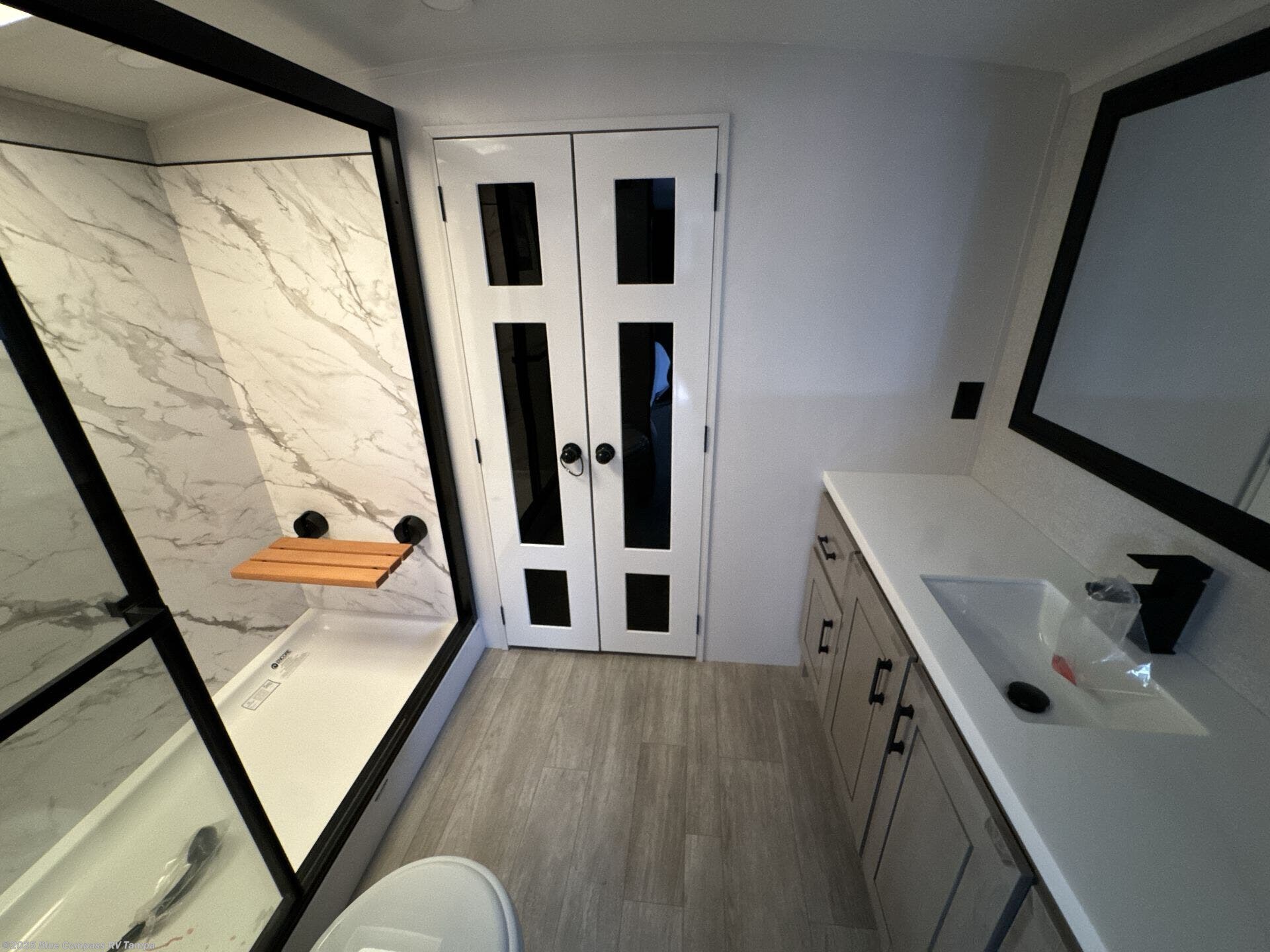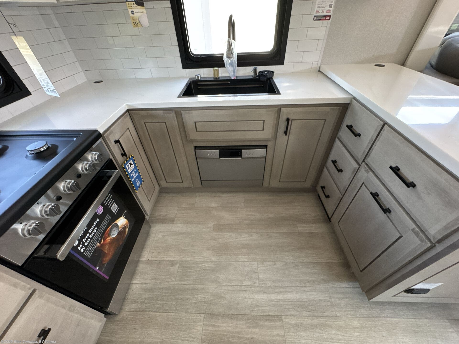Triples slides, a desk/coffee bar, fireplace, and a huge master bath in front all indicate the kind of vacation you will experience in this Pinnacle Fifth Wheel! As you enter, a convenient half bath is located straight ahead. Slightly to your left, a nice seating area for gathering with family or friends to relax and watch TV, enjoy the fireplace while reading a book or watching a movie, and the dining table with chairs. The dinette slide also houses a 21 cu. ft. residential refrigerator and pantry. The rear kitchen features a u-shaped counter, all the appliances you need to cook like at home, even a pull-out butcher block space for chopping up your veggies. Back through and up the steps to your right in front, the master bedroom will make you feel like royalty with its king bed, plus luxurious full rear bath. A huge vanity with dual bath sinks will allow you both to get ready at the same time, plus there is a walk-in shower with a seat for added convenience. Speaking of walk-in, you will also love the spacious walk-in closet that includes washer/dryer prep.