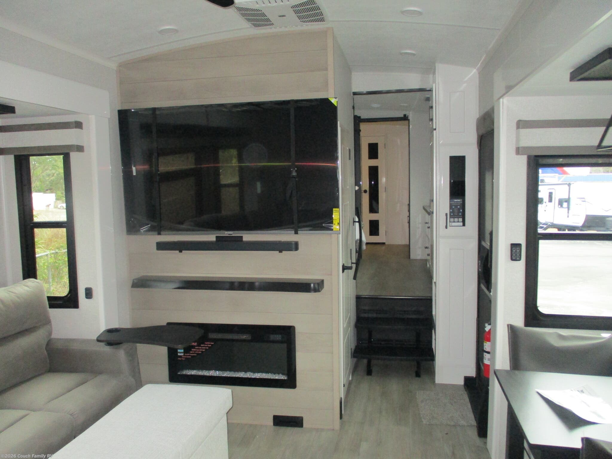 - Upscale living area — premium seating, entertainment center, and fireplace