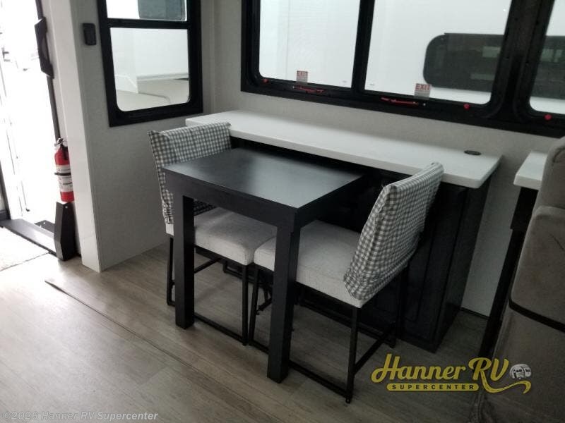Triples slides, a desk/coffee bar, fireplace, and a huge master bath in front all indicate the kind of vacation you will experience in this Pinnacle Fifth Wheel! As you enter, a convenient half bath is located straight ahead. Slightly to your left, a nice seating area for gathering with family or friends to relax and watch TV, enjoy the fireplace while reading a book or watching a movie, and the dining table with chairs. The dinette slide also houses a 21 cu. ft. residential refrigerator and pantry. The rear kitchen features a u-shaped counter, all the appliances you need to cook like at home, even a pull-out butcher block space for chopping up your veggies. Back through and up the steps to your right in front, the master bedroom will make you feel like royalty with its king bed, plus luxurious full rear bath. A huge vanity with dual bath sinks will allow you both to get ready at the same time, plus there is a walk-in shower with a seat for added convenience. Speaking of walk-in, you will also love the spacious walk-in closet that includes washer/dryer prep.