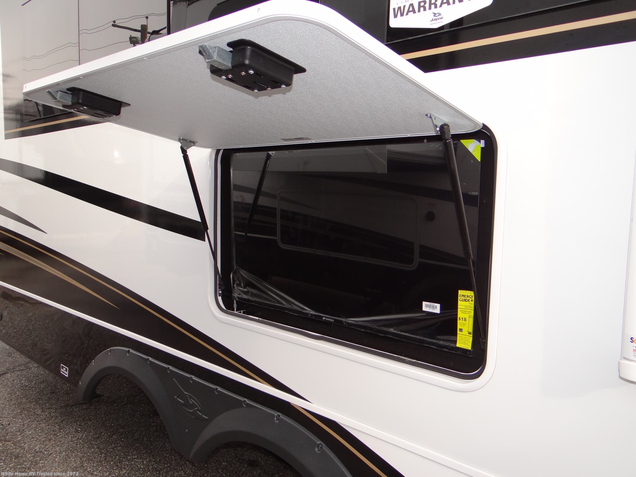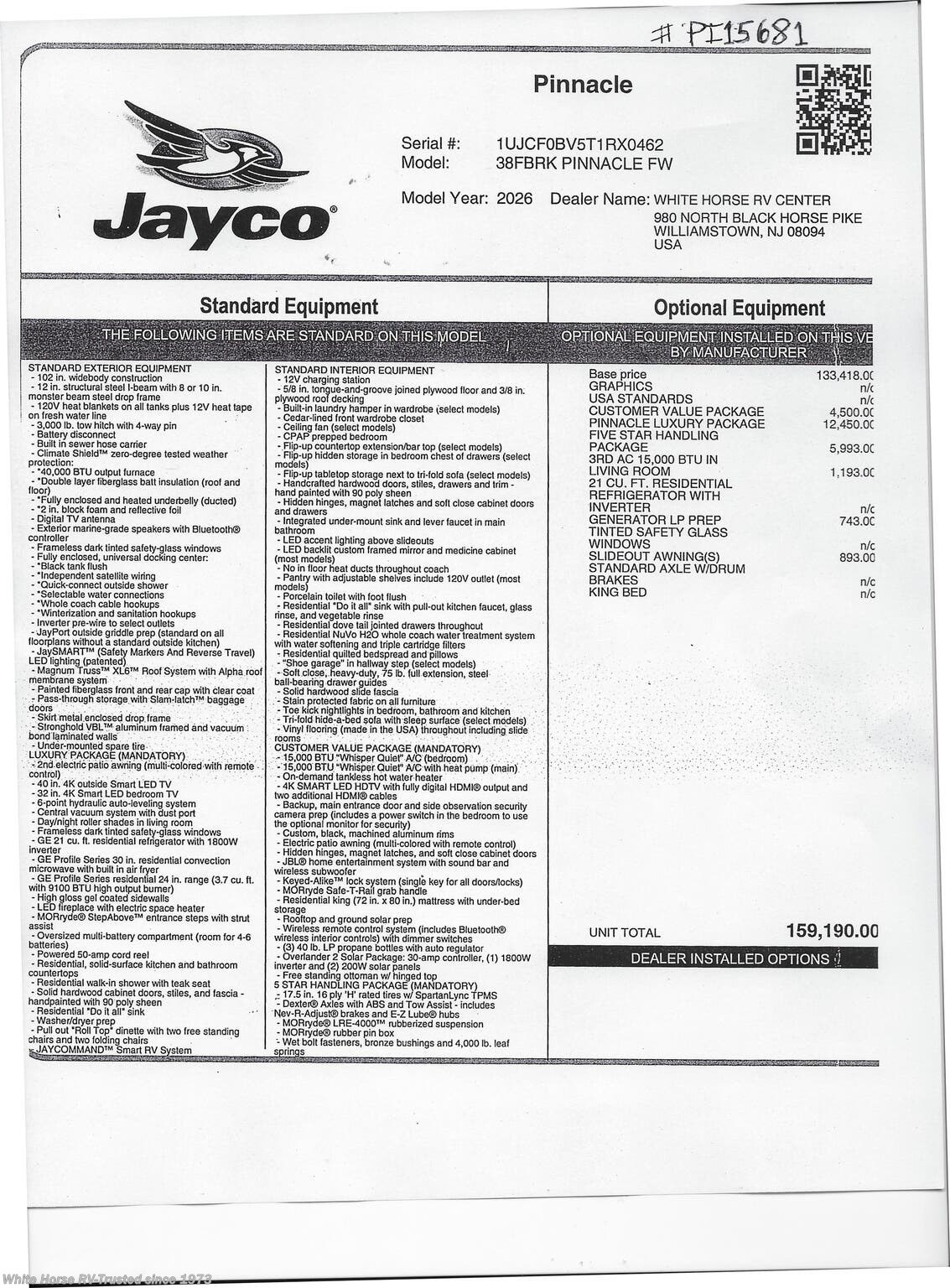 This Stock # PI15681 also has the following factory options included: ... Interior Décor Modern Farmhouse, 3rd AC 15,000 BTU in Living Room, Generator LP Prep, & Slide out Awning (s) ... all backed by Jayco’s 2+3-year warranty! MSRP $159,190.00.