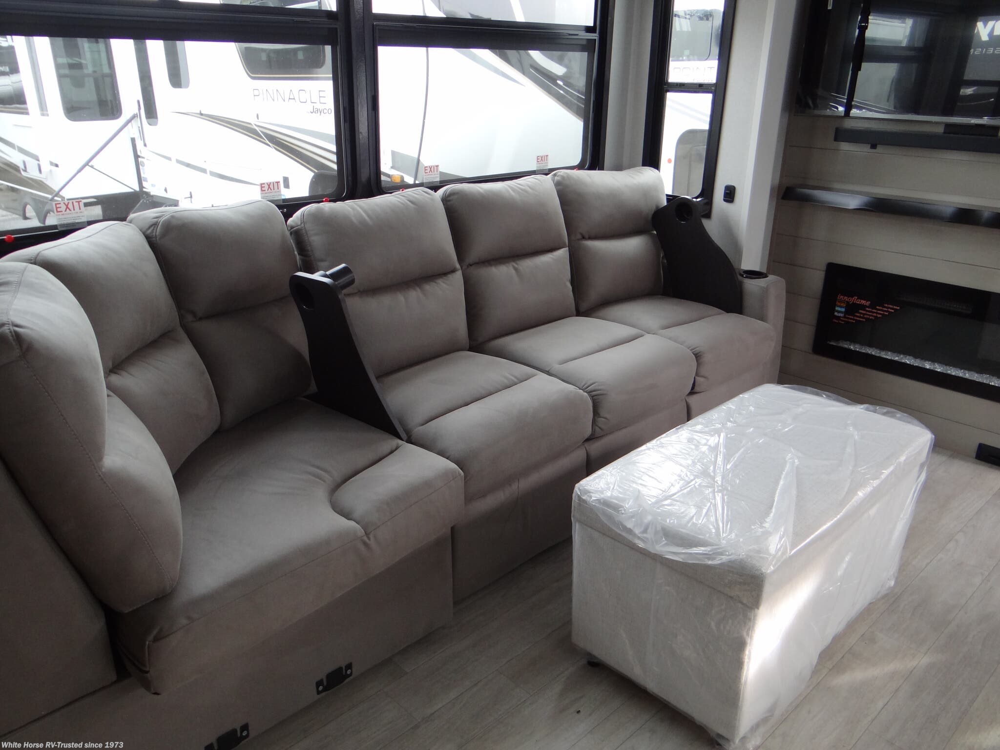 Pinnacle Luxury Package: 2nd Electric Patio Awning w/ Integrated RGB Lights, 40" 4K Outside Smart LED TV, 32" 4K Smart LED Bedroom TV, 6-point Hydraulic Auto-Leveling System, Central Vacuum System w/ Dust Port, Day/Night Roller Shades in Living Room, Frameless Dark Tinted Safety-Glass Windows, GE 21 Cu Ft Residential Refrigerator w/ 1800W Inverter, GE Profile Series 30" Residential Convection Microwave w/Built In Air Fryer, GE Profile Series Residential 24" Range (3.7 cu ft w/9100 BTU high Output Burner), High Gloss Gel-Coated Sidewalls, LED Fireplace w/ Electric Space Heater, MORryde® StepAbove™ Entrance Steps (Main) w/Strut Assist, Oversized Multi Battery Compartment (Industry Leading Room for 4-6 Batteries), Powered 50 Amp Cord Reel, Residential Solid-Surface Kitchen and Bathroom Countertops, Residential Walk-In Shower w/ Shampoo/Soap Holder, Teak Seat and Shower Tower, Solid Hardwood Cabinet Doors, Stiles and Fascia - Hand Painted w/90 Poly Sheen, Under Sink Dishwasher, Washer/Dryer Prep, Pull Out Roll Top Dinette w/ (2) Freestanding Chairs and (2) Folding Chairs, JAYCOMMAND® "Smart RV" System