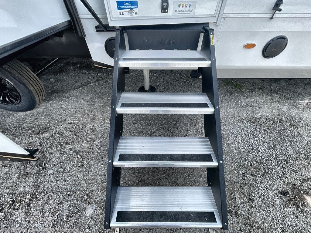 Triples slides, a desk/coffee bar, fireplace, and a huge master bath in front all indicate the kind of vacation you will experience in this Pinnacle Fifth Wheel! As you enter, a convenient half bath is located straight ahead. Slightly to your left, a nice seating area for gathering with family or friends to relax and watch TV, enjoy the fireplace while reading a book or watching a movie, and the dining table with chairs. The dinette slide also houses a 21 cu. ft. residential refrigerator and pantry. The rear kitchen features a u-shaped counter, all the appliances you need to cook like at home, even a pull-out butcher block space for chopping up your veggies. Back through and up the steps to your right in front, the master bedroom will make you feel like royalty with its king bed, plus luxurious full rear bath. A huge vanity with dual bath sinks will allow you both to get ready at the same time, plus there is a walk-in shower with a seat for added convenience. Speaking of walk-in, you will also love the spacious walk-in closet that includes washer/dryer prep.