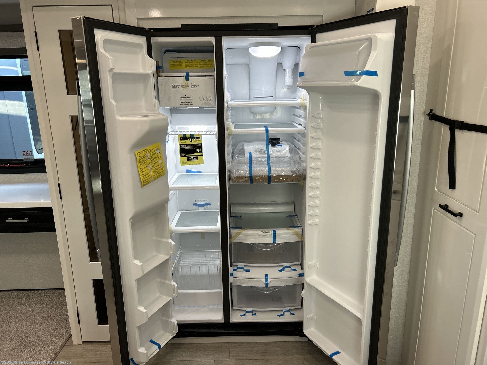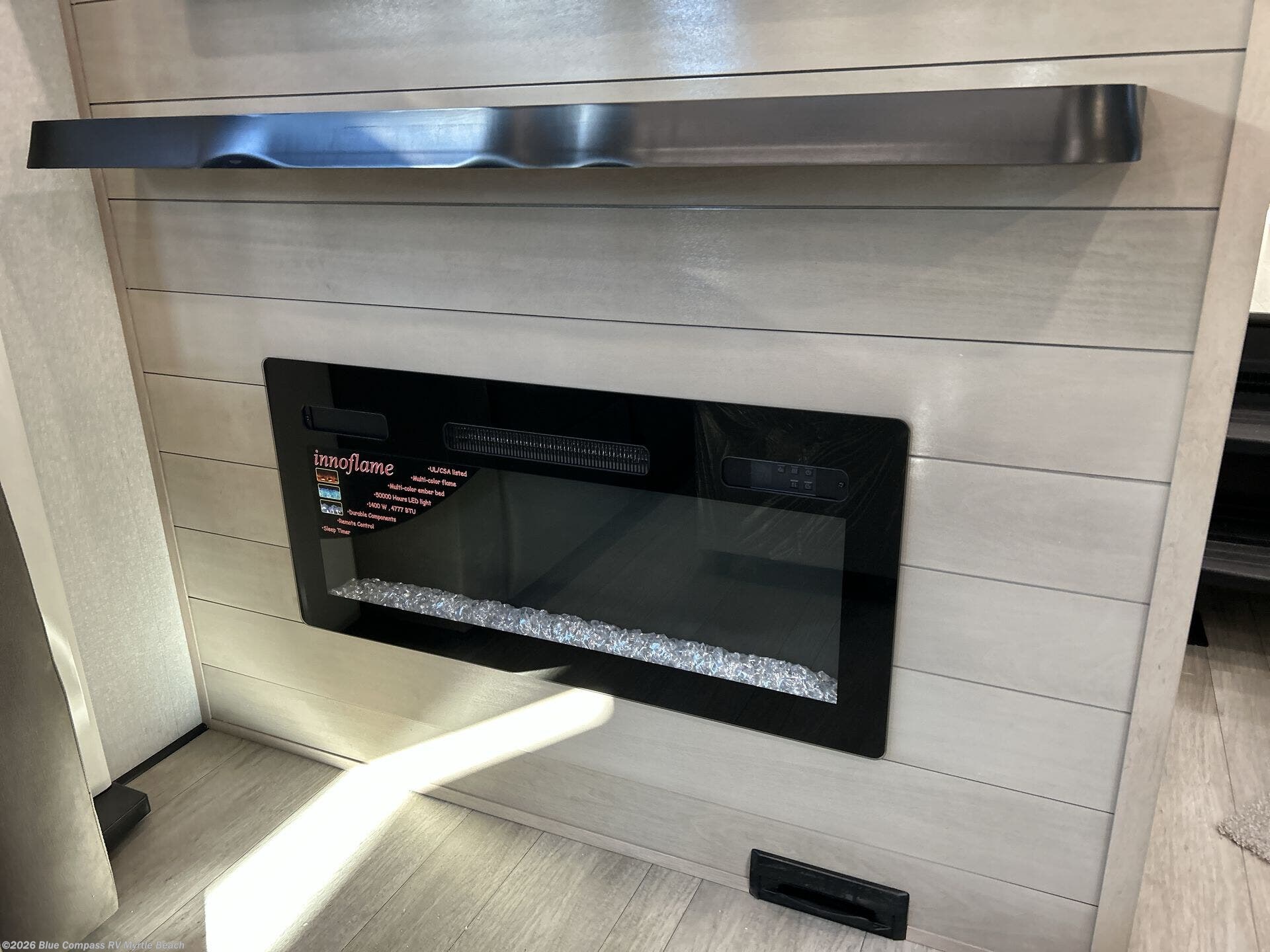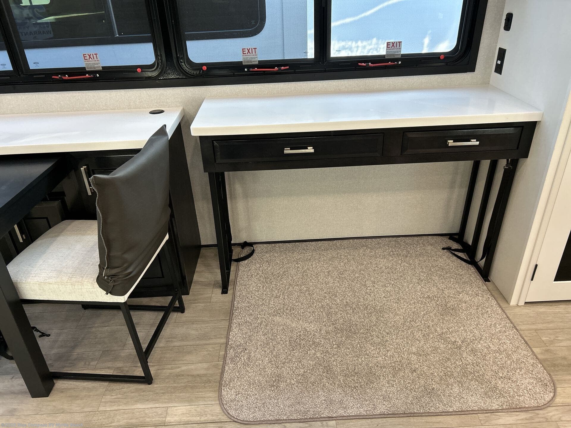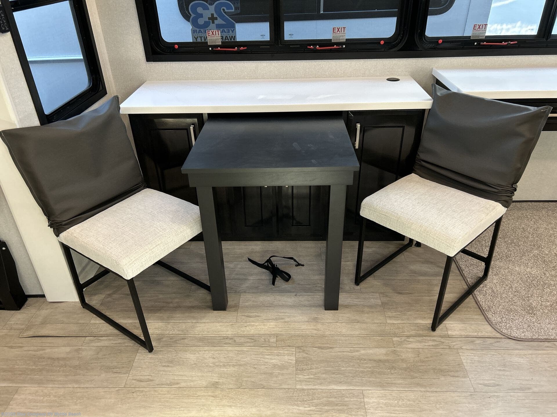 Triples slides, a desk/coffee bar, fireplace, and a huge master bath in front all indicate the kind of vacation you will experience in this Pinnacle Fifth Wheel! As you enter, a convenient half bath is located straight ahead. Slightly to your left, a nice seating area for gathering with family or friends to relax and watch TV, enjoy the fireplace while reading a book or watching a movie, and the dining table with chairs. The dinette slide also houses a 21 cu. ft. residential refrigerator and pantry. The rear kitchen features a u-shaped counter, all the appliances you need to cook like at home, even a pull-out butcher block space for chopping up your veggies. Back through and up the steps to your right in front, the master bedroom will make you feel like royalty with its king bed, plus luxurious full rear bath. A huge vanity with dual bath sinks will allow you both to get ready at the same time, plus there is a walk-in shower with a seat for added convenience. Speaking of walk-in, you will also love the spacious walk-in closet that includes washer/dryer prep.