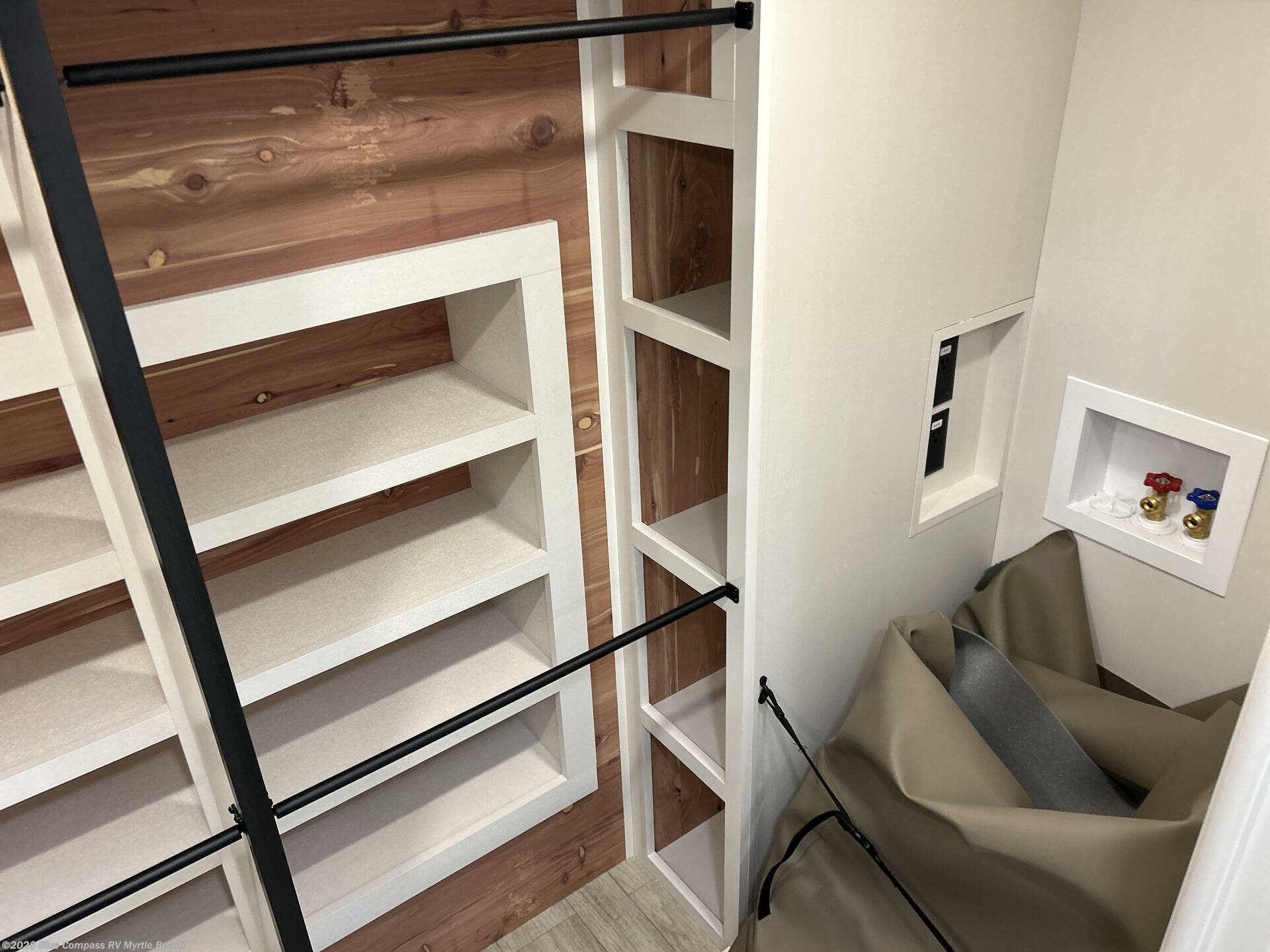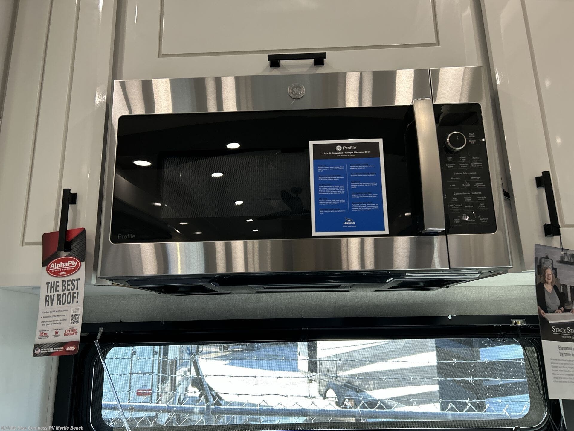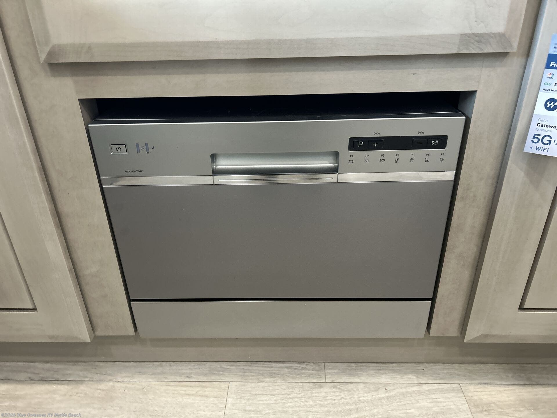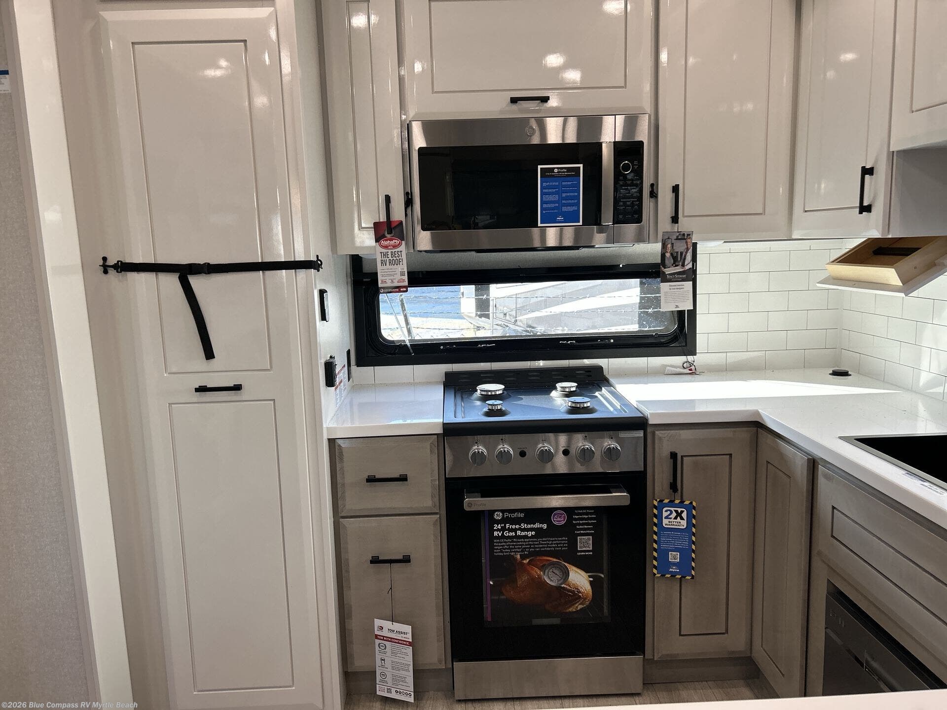Triples slides, a desk/coffee bar, fireplace, and a huge master bath in front all indicate the kind of vacation you will experience in this Pinnacle Fifth Wheel! As you enter, a convenient half bath is located straight ahead. Slightly to your left, a nice seating area for gathering with family or friends to relax and watch TV, enjoy the fireplace while reading a book or watching a movie, and the dining table with chairs. The dinette slide also houses a 21 cu. ft. residential refrigerator and pantry. The rear kitchen features a u-shaped counter, all the appliances you need to cook like at home, even a pull-out butcher block space for chopping up your veggies. Back through and up the steps to your right in front, the master bedroom will make you feel like royalty with its king bed, plus luxurious full rear bath. A huge vanity with dual bath sinks will allow you both to get ready at the same time, plus there is a walk-in shower with a seat for added convenience. Speaking of walk-in, you will also love the spacious walk-in closet that includes washer/dryer prep.