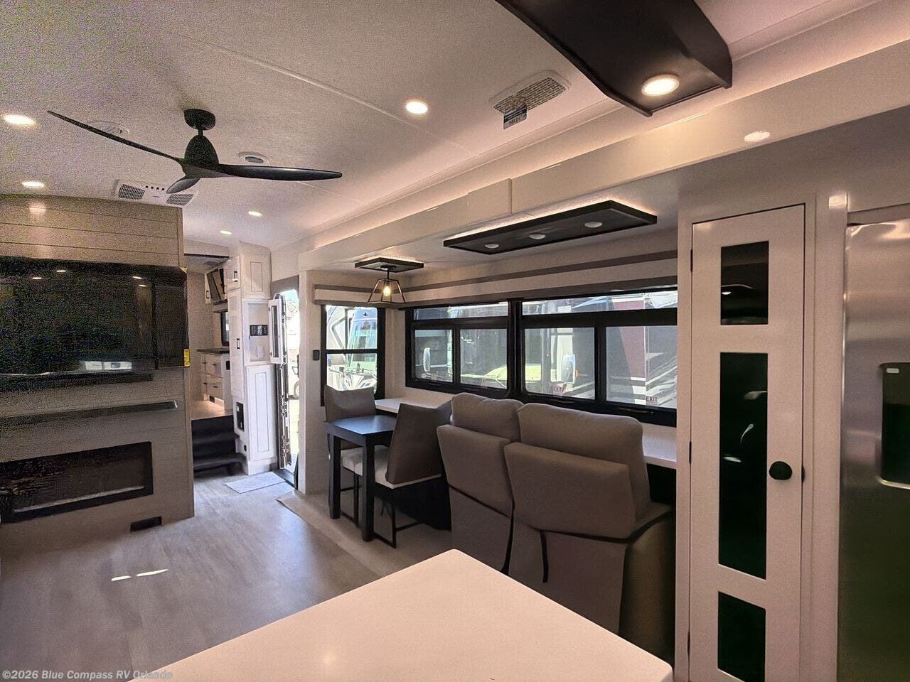 Triples slides, a desk/coffee bar, fireplace, and a huge master bath in front all indicate the kind of vacation you will experience in this Pinnacle Fifth Wheel! As you enter, a convenient half bath is located straight ahead. Slightly to your left, a nice seating area for gathering with family or friends to relax and watch TV, enjoy the fireplace while reading a book or watching a movie, and the dining table with chairs. The dinette slide also houses a 21 cu. ft. residential refrigerator and pantry. The rear kitchen features a u-shaped counter, all the appliances you need to cook like at home, even a pull-out butcher block space for chopping up your veggies. Back through and up the steps to your right in front, the master bedroom will make you feel like royalty with its king bed, plus luxurious full rear bath. A huge vanity with dual bath sinks will allow you both to get ready at the same time, plus there is a walk-in shower with a seat for added convenience. Speaking of walk-in, you will also love the spacious walk-in closet that includes washer/dryer prep.