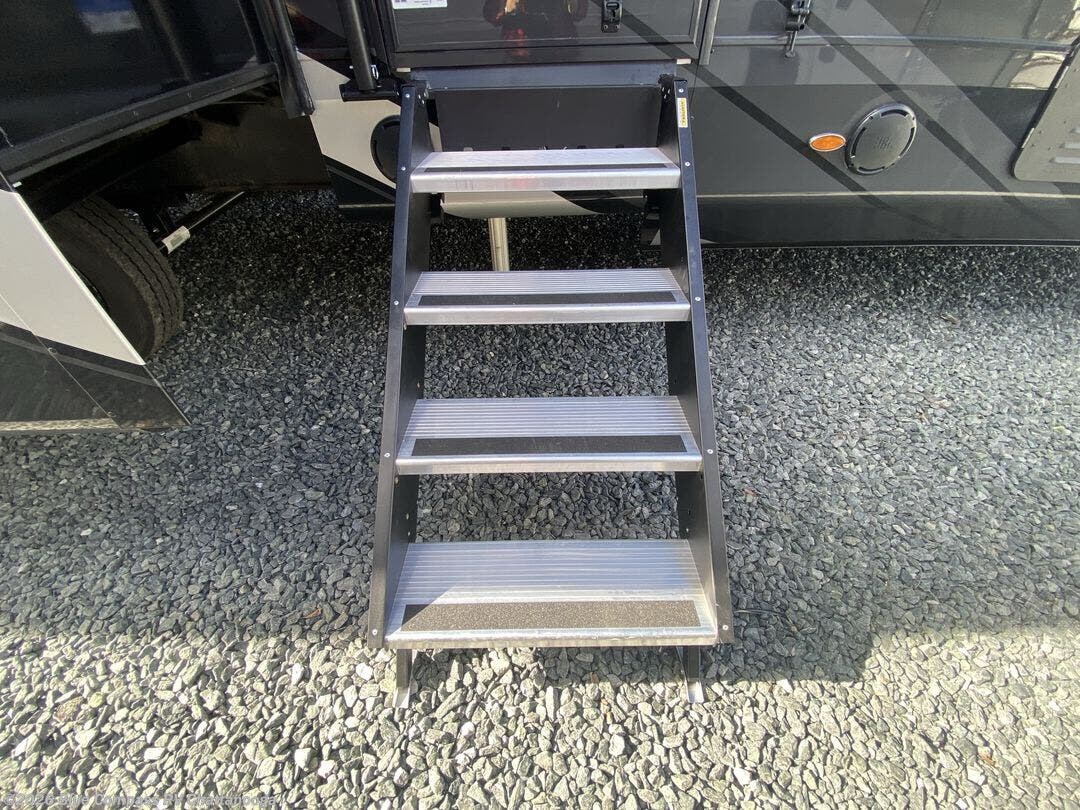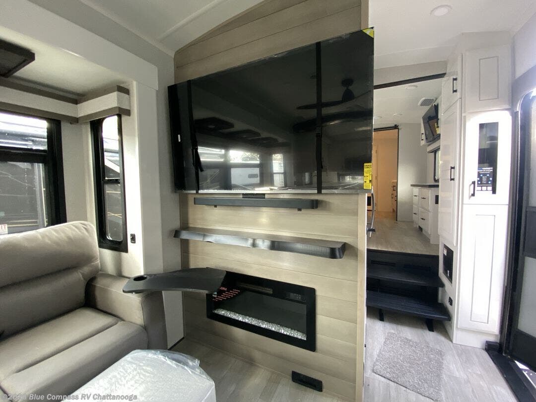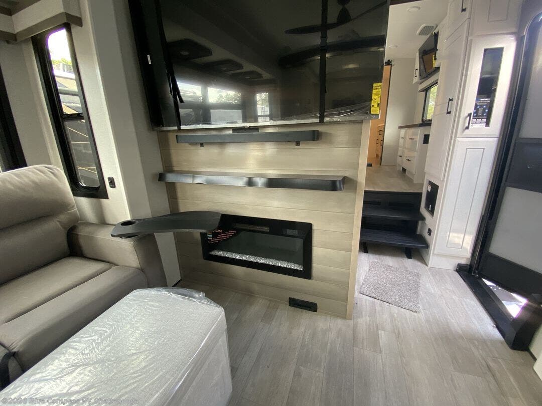 Triples slides, a desk/coffee bar, fireplace, and a huge master bath in front all indicate the kind of vacation you will experience in this Pinnacle Fifth Wheel! As you enter, a convenient half bath is located straight ahead. Slightly to your left, a nice seating area for gathering with family or friends to relax and watch TV, enjoy the fireplace while reading a book or watching a movie, and the dining table with chairs. The dinette slide also houses a 21 cu. ft. residential refrigerator and pantry. The rear kitchen features a u-shaped counter, all the appliances you need to cook like at home, even a pull-out butcher block space for chopping up your veggies. Back through and up the steps to your right in front, the master bedroom will make you feel like royalty with its king bed, plus luxurious full rear bath. A huge vanity with dual bath sinks will allow you both to get ready at the same time, plus there is a walk-in shower with a seat for added convenience. Speaking of walk-in, you will also love the spacious walk-in closet that includes washer/dryer prep.