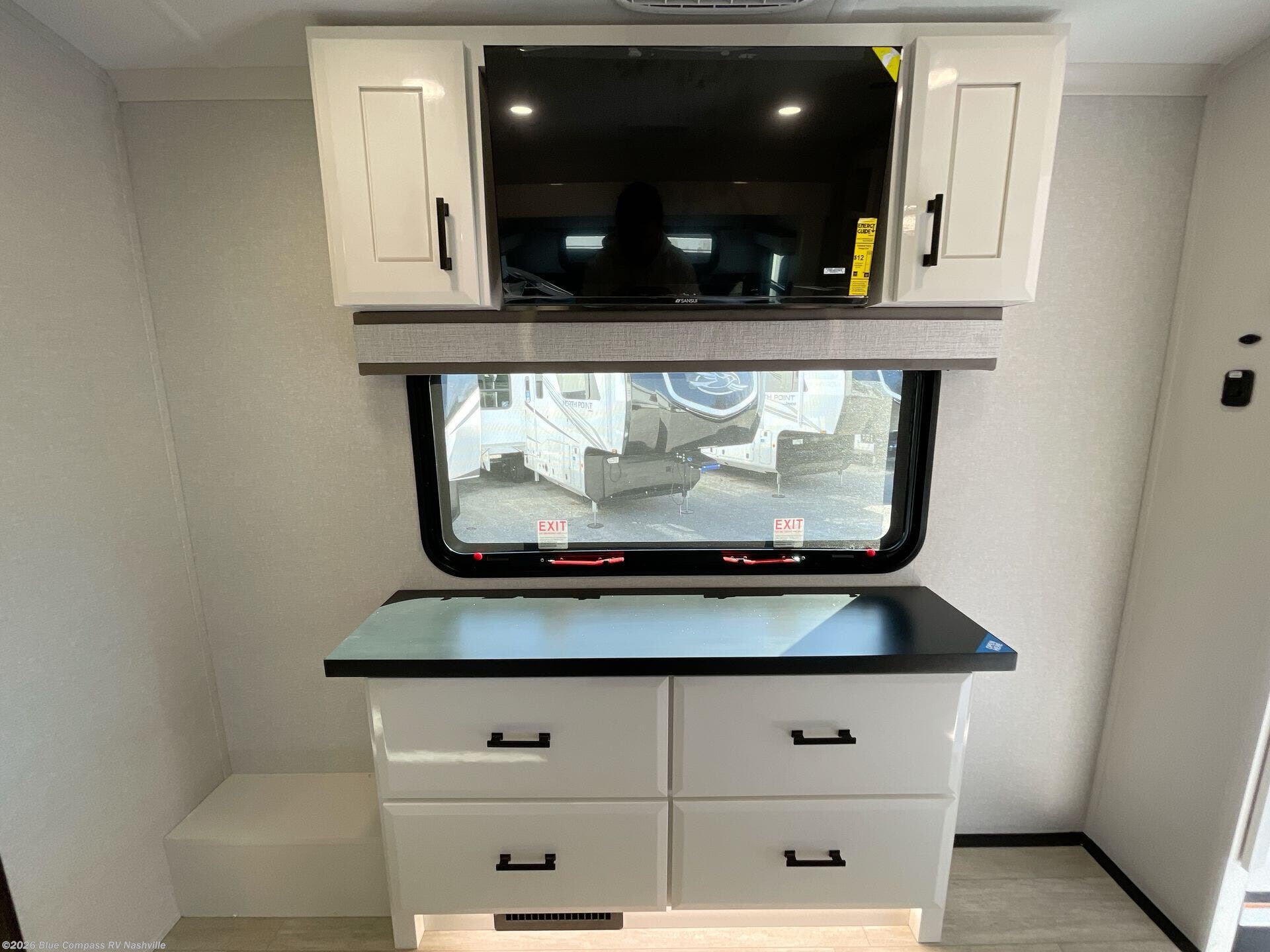 Triples slides, a desk/coffee bar, fireplace, and a huge master bath in front all indicate the kind of vacation you will experience in this Pinnacle Fifth Wheel! As you enter, a convenient half bath is located straight ahead. Slightly to your left, a nice seating area for gathering with family or friends to relax and watch TV, enjoy the fireplace while reading a book or watching a movie, and the dining table with chairs. The dinette slide also houses a 21 cu. ft. residential refrigerator and pantry. The rear kitchen features a u-shaped counter, all the appliances you need to cook like at home, even a pull-out butcher block space for chopping up your veggies. Back through and up the steps to your right in front, the master bedroom will make you feel like royalty with its king bed, plus luxurious full rear bath. A huge vanity with dual bath sinks will allow you both to get ready at the same time, plus there is a walk-in shower with a seat for added convenience. Speaking of walk-in, you will also love the spacious walk-in closet that includes washer/dryer prep.