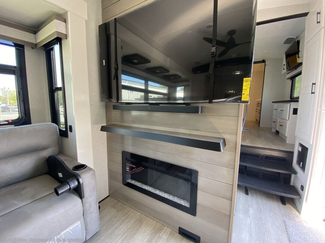 Triples slides, a desk/coffee bar, fireplace, and a huge master bath in front all indicate the kind of vacation you will experience in this Pinnacle Fifth Wheel! As you enter, a convenient half bath is located straight ahead. Slightly to your left, a nice seating area for gathering with family or friends to relax and watch TV, enjoy the fireplace while reading a book or watching a movie, and the dining table with chairs. The dinette slide also houses a 21 cu. ft. residential refrigerator and pantry. The rear kitchen features a u-shaped counter, all the appliances you need to cook like at home, even a pull-out butcher block space for chopping up your veggies. Back through and up the steps to your right in front, the master bedroom will make you feel like royalty with its king bed, plus luxurious full rear bath. A huge vanity with dual bath sinks will allow you both to get ready at the same time, plus there is a walk-in shower with a seat for added convenience. Speaking of walk-in, you will also love the spacious walk-in closet that includes washer/dryer prep.