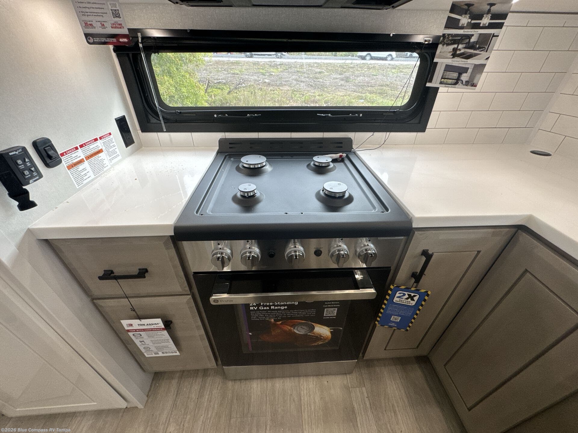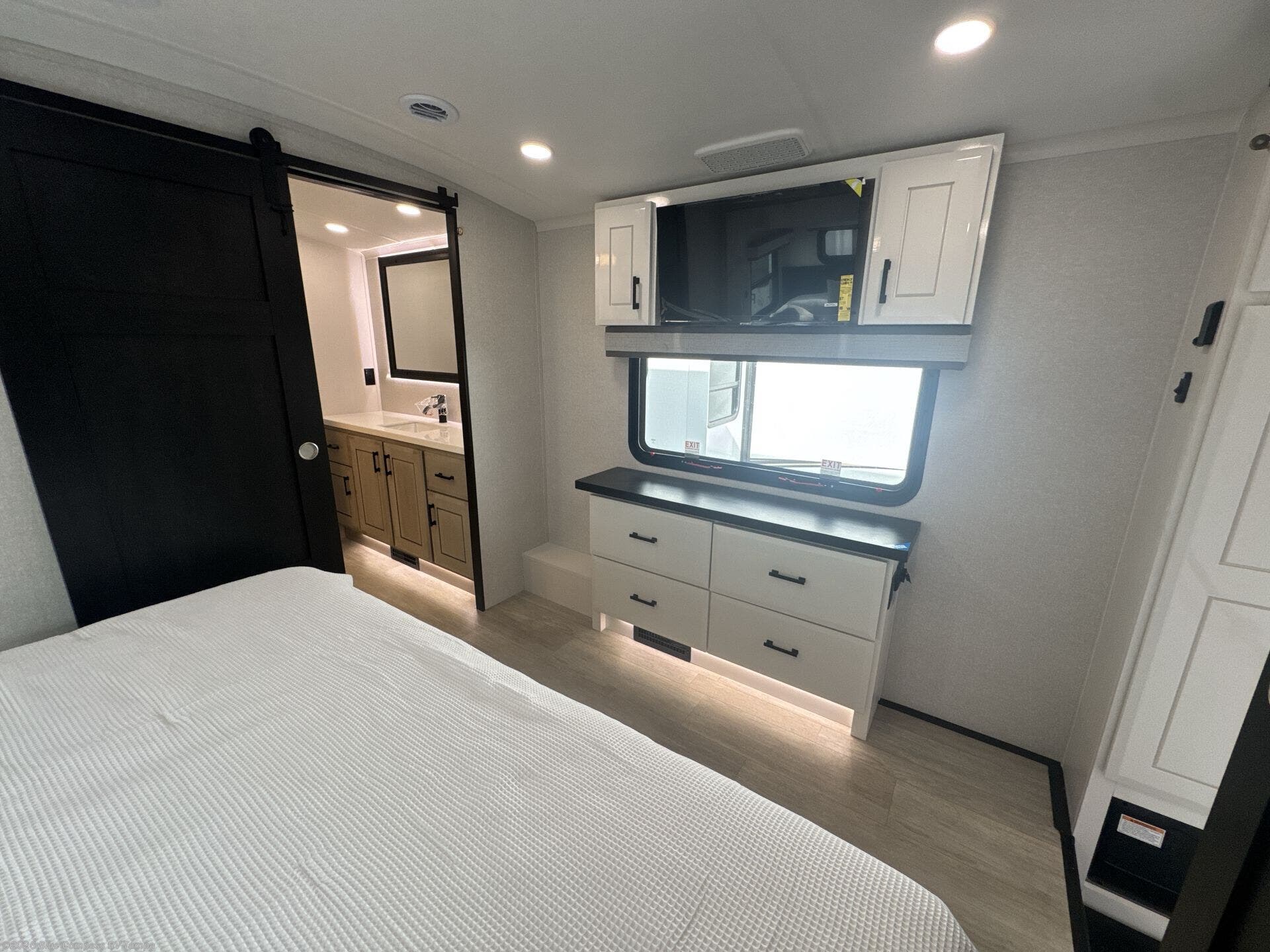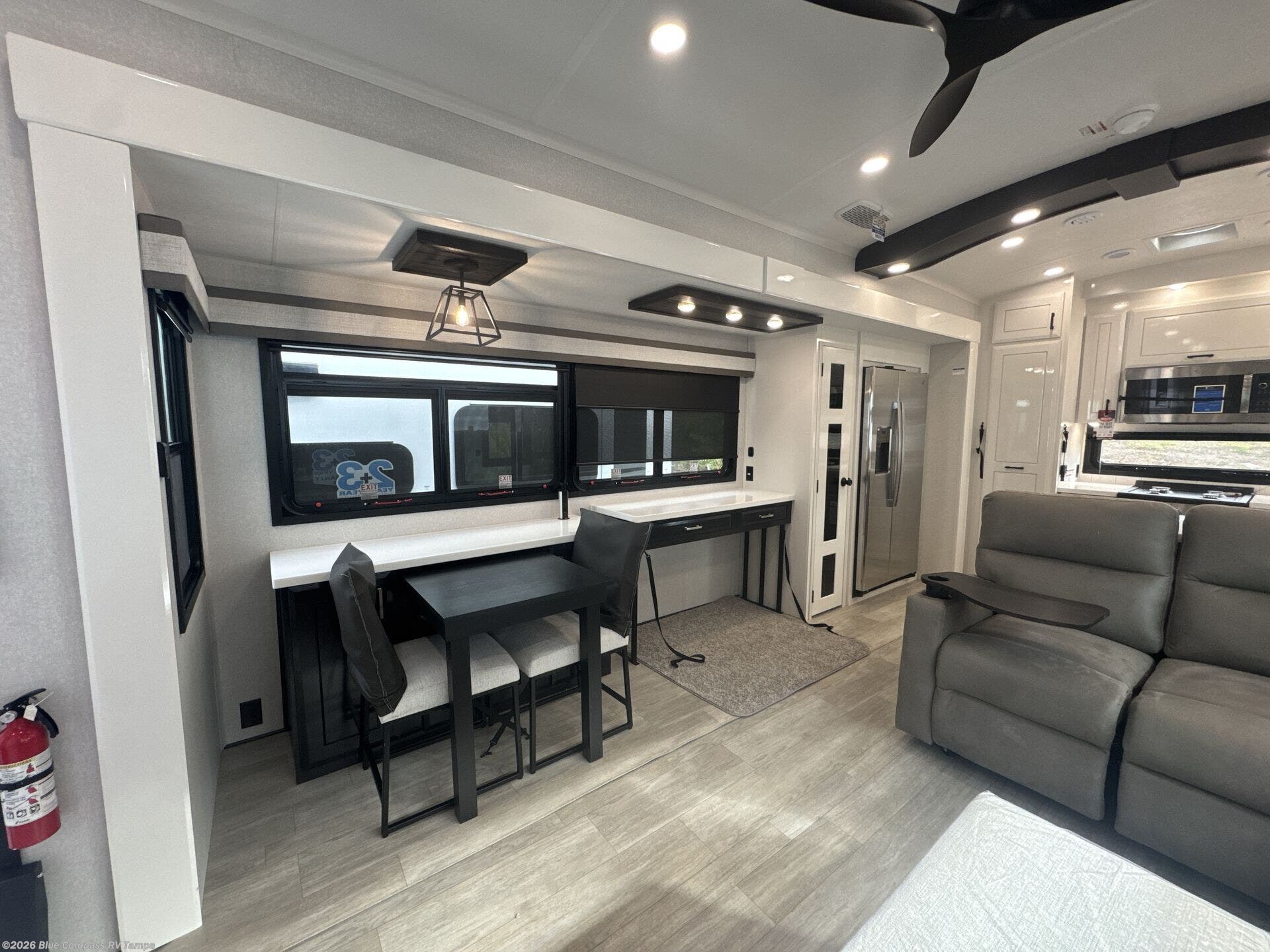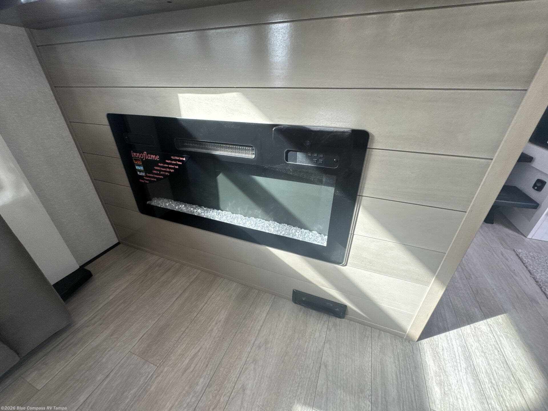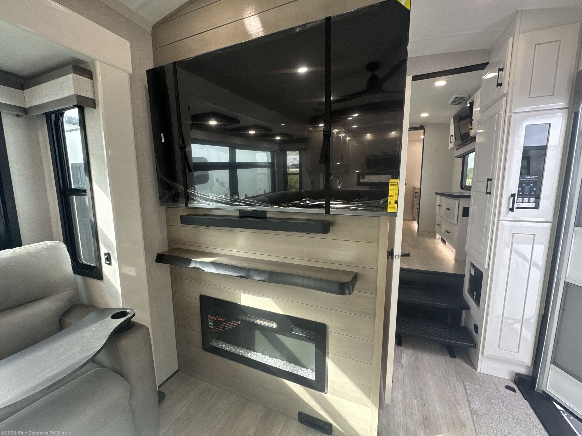 Triples slides, a desk/coffee bar, fireplace, and a huge master bath in front all indicate the kind of vacation you will experience in this Pinnacle Fifth Wheel! As you enter, a convenient half bath is located straight ahead. Slightly to your left, a nice seating area for gathering with family or friends to relax and watch TV, enjoy the fireplace while reading a book or watching a movie, and the dining table with chairs. The dinette slide also houses a 21 cu. ft. residential refrigerator and pantry. The rear kitchen features a u-shaped counter, all the appliances you need to cook like at home, even a pull-out butcher block space for chopping up your veggies. Back through and up the steps to your right in front, the master bedroom will make you feel like royalty with its king bed, plus luxurious full rear bath. A huge vanity with dual bath sinks will allow you both to get ready at the same time, plus there is a walk-in shower with a seat for added convenience. Speaking of walk-in, you will also love the spacious walk-in closet that includes washer/dryer prep.