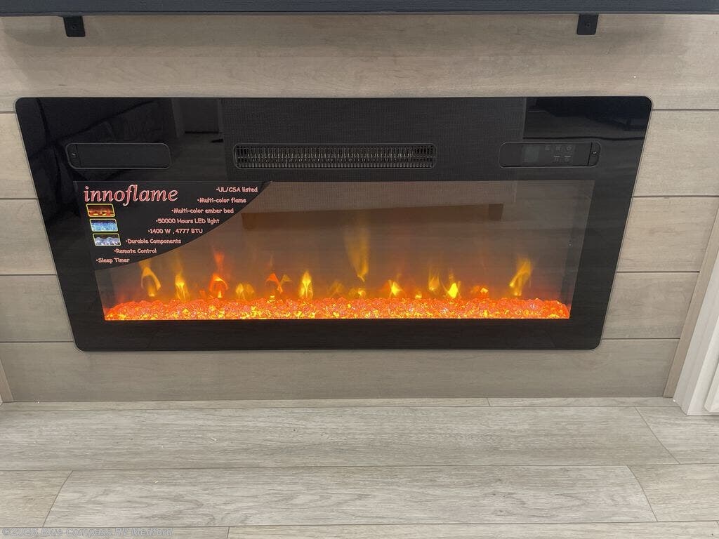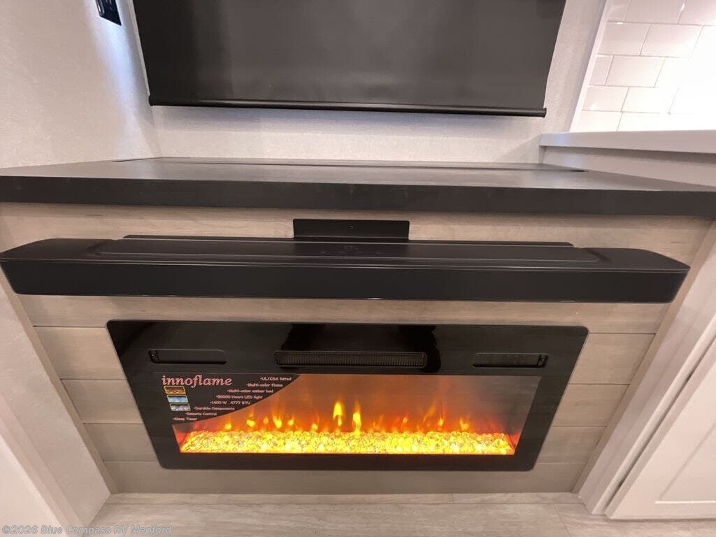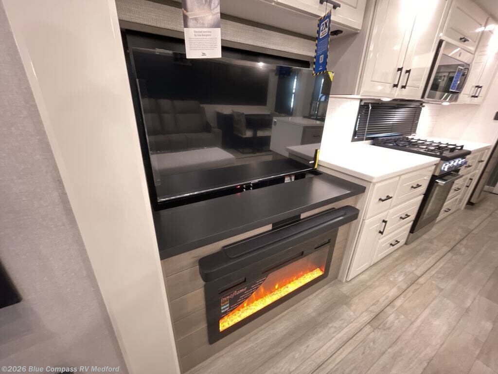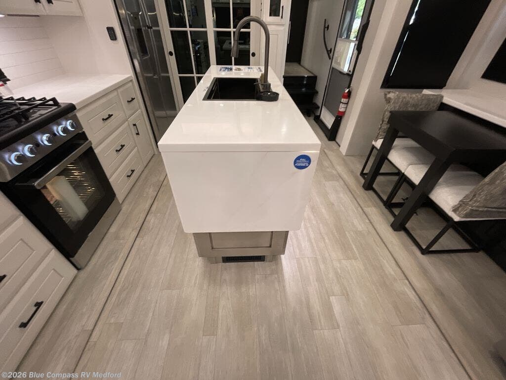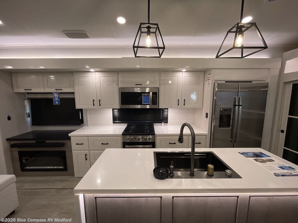 Your search is over now with this perfect luxury fifth wheel for your crew of four. Once you get settled at the campground, take a load off on the theater seat sacross from the TV lift and fireplace. There is also a free-standing table here and a tri-fold sofa that will double as additional seating and sleeping space. The kitchen island includes a pull-out cutting board extension for tons of prep space and even a dishwasher for easy clean up, and a residential range to use for cooking as well as a convection microwave oven with built-in air fryer. Head to the full bath that includes a walk-in shower with a seat, an LED backlit custom framed mirror, plus residential bath backsplash for added luxury. You're gong to love the front private bedroom with its king bed slide out, 32" TV, plus a large front closet complete with a hamper and drawers, and an area that features washer/dryer prep in case you wish to add that convenience as well.
