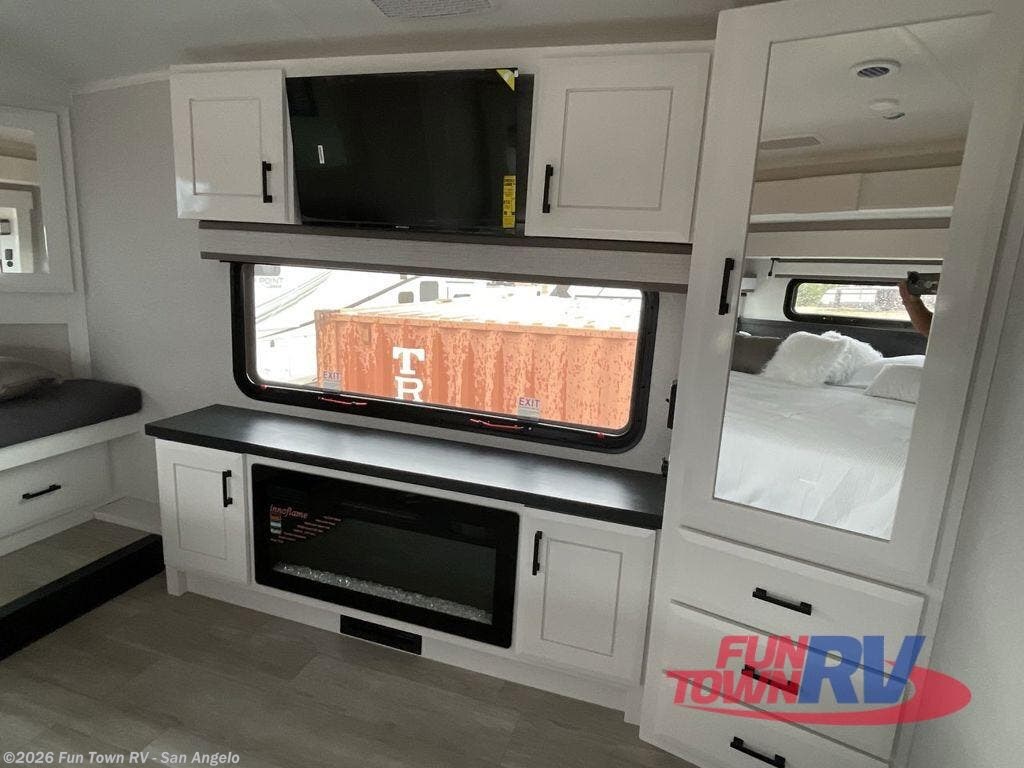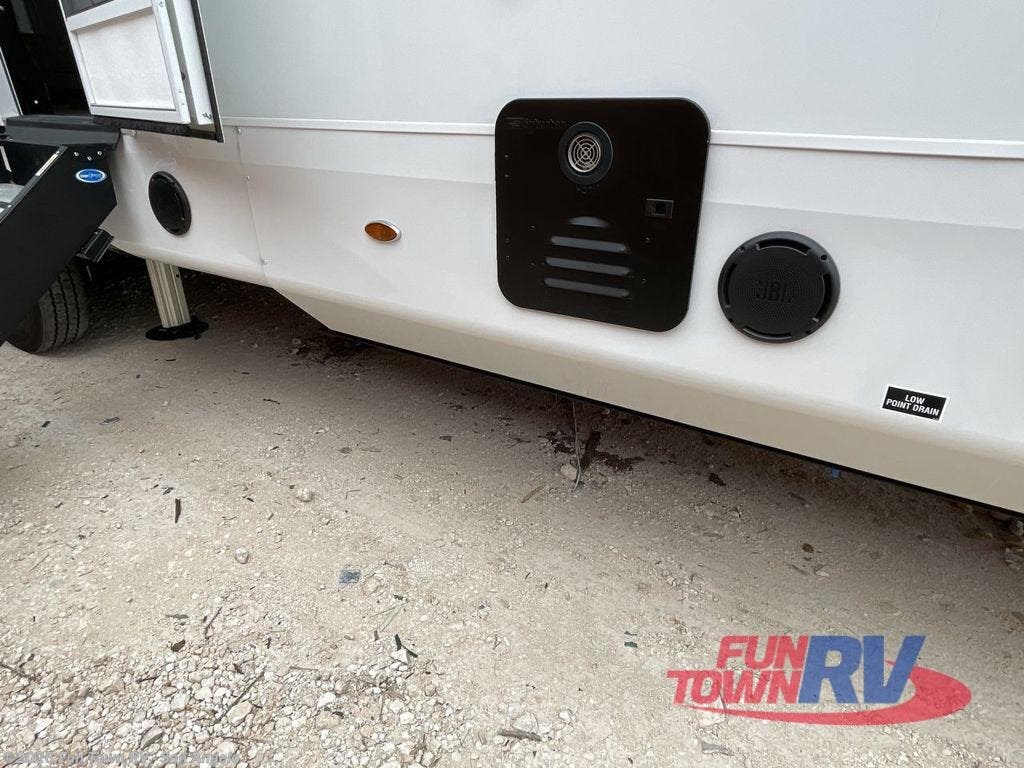 Take your camping trips up a notch in this luxurious fifth wheel! Your family will love to visit in the rear living area on the tri-fold sofa or theater seats, plus there is a credenza with roll-out table here to dine at together. The TV lift and fireplace will make it feel more like home, along with the kitchen island and residential refrigerator. Head up the steps to find cabinets for an optional washer and dryer, a full bath with a large bath vanity, plus a private bedroom up front that you are sure to love. When you aren't resting on the king bed slide out, read a book on the front window seat, or watch a movie with the bedroom TV provided. There is even a bedroom fireplace for added comfort. And check out the exterior with two power awnings with LED lights and a 32" TV!