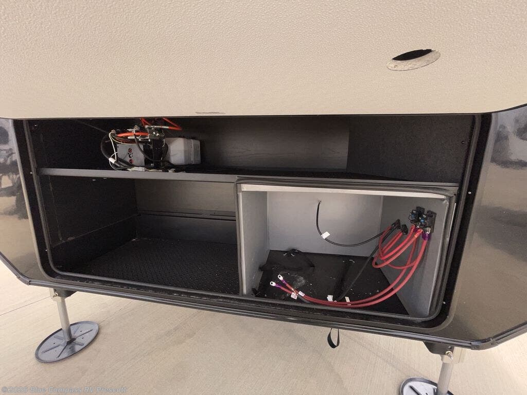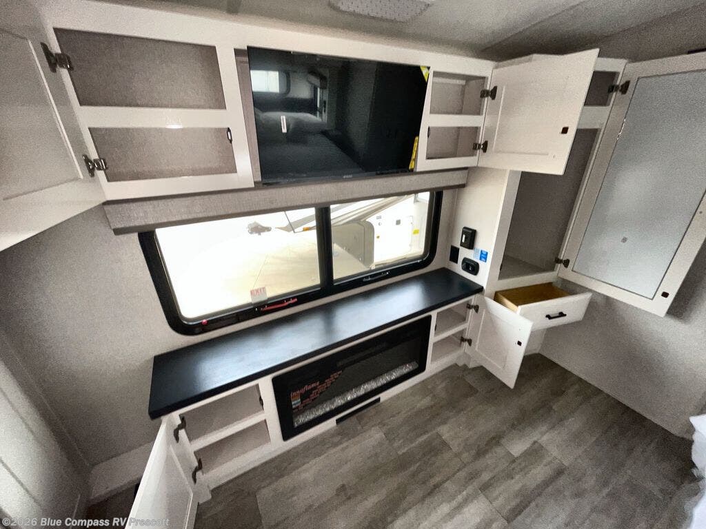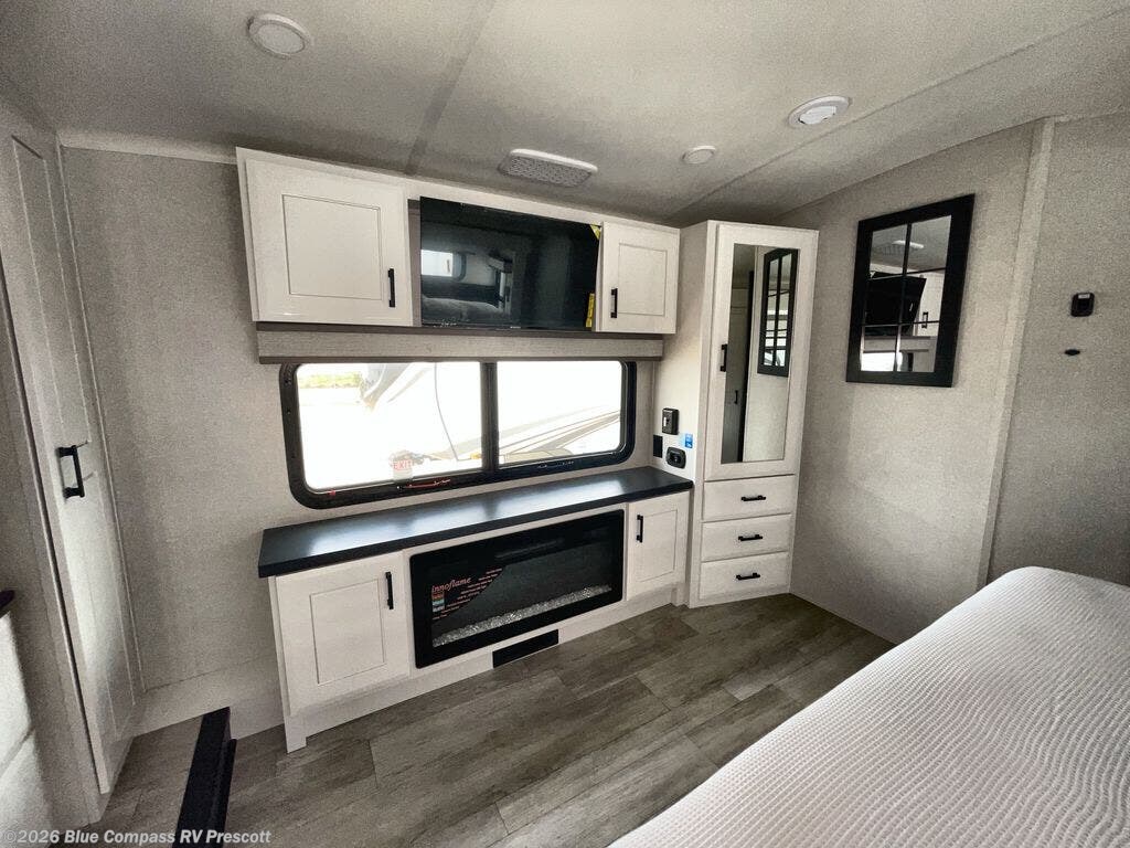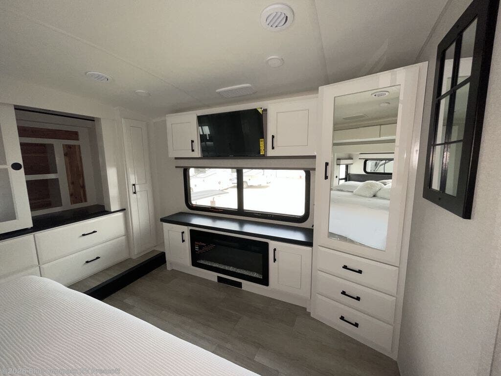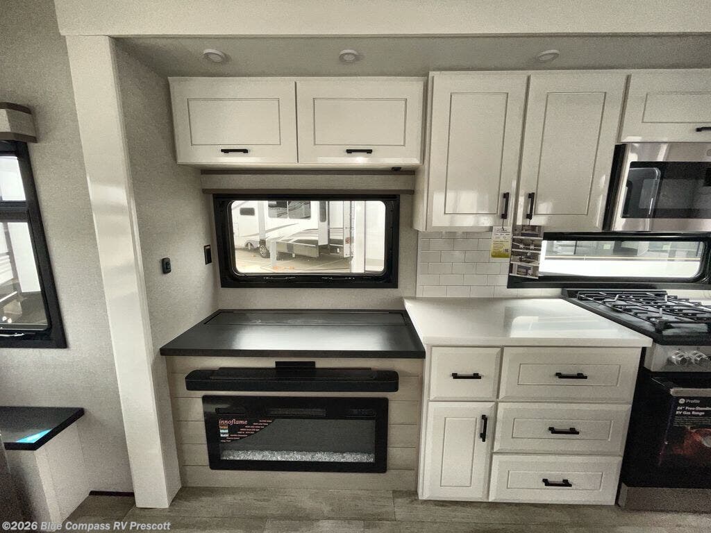 Take your camping trips up a notch in this luxurious fifth wheel! Your family will love to visit in the rear living area on the tri-fold sofa or theater seats, plus there is a credenza with roll-out table here to dine at together. The TV lift and fireplace will make it feel more like home, along with the kitchen island and residential refrigerator. Head up the steps to find cabinets for an optional washer and dryer, a full bath with a large bath vanity, plus a private bedroom up front that you are sure to love. When you aren't resting on the king bed slide out, read a book on the front window seat, or watch a movie with the bedroom TV provided. There is even a bedroom fireplace for added comfort. And check out the exterior with two power awnings with LED lights and a 32" TV!
