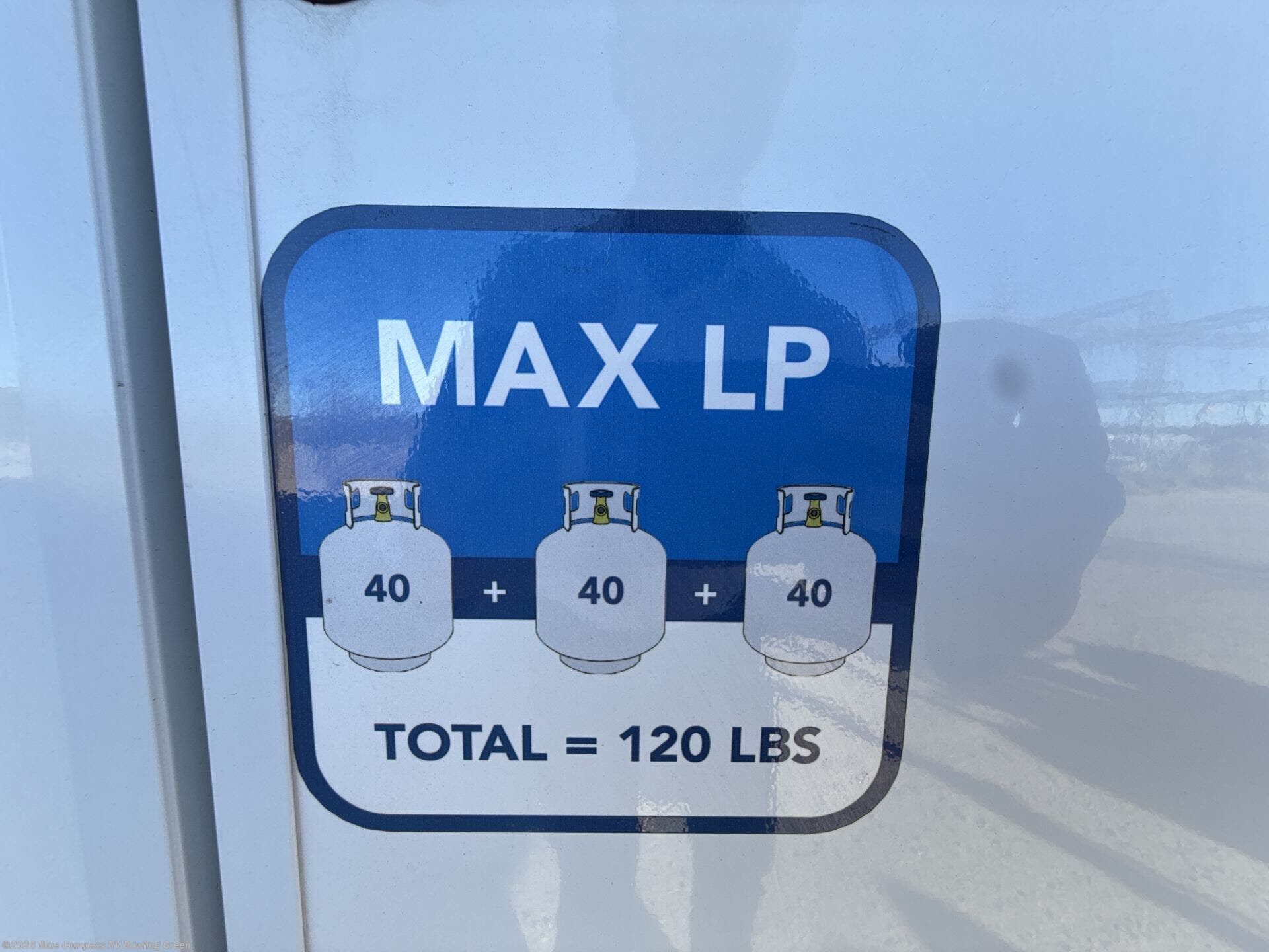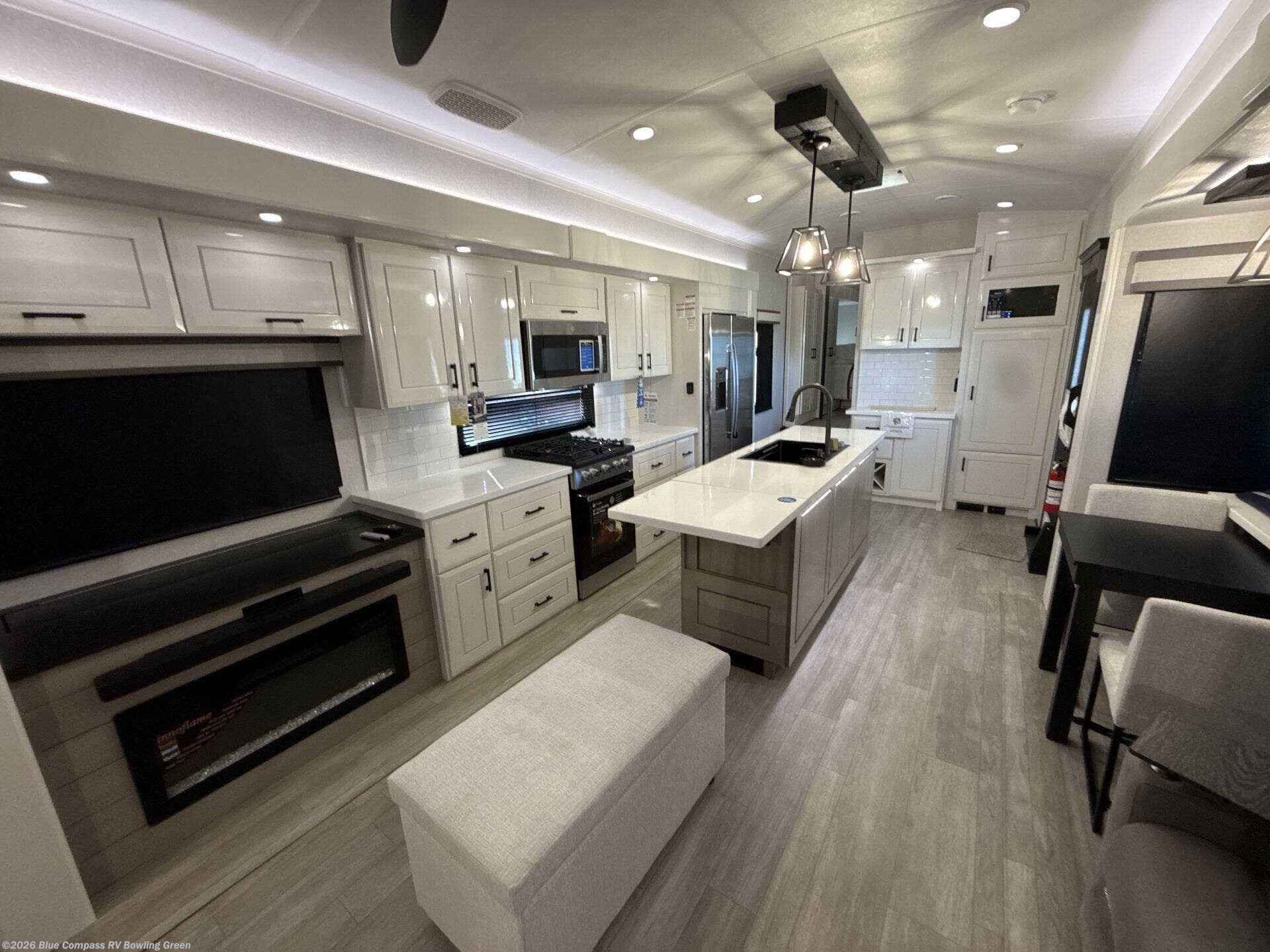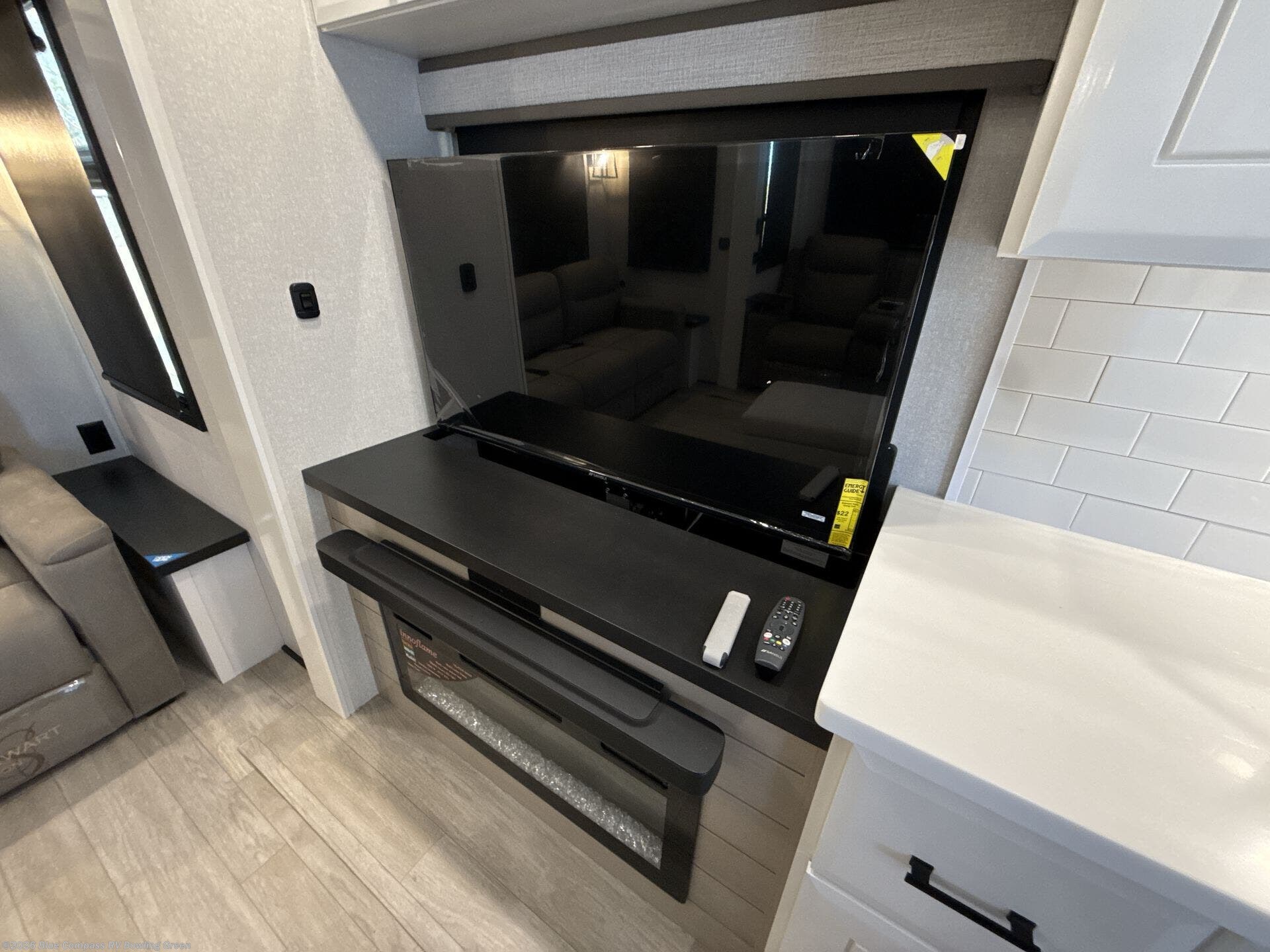 Take your camping trips up a notch in this luxurious fifth wheel! Your family will love to visit in the rear living area on the tri-fold sofa or theater seats, plus there is a credenza with roll-out table here to dine at together. The TV lift and fireplace will make it feel more like home, along with the kitchen island and residential refrigerator. Head up the steps to find cabinets for an optional washer and dryer, a full bath with a large bath vanity, plus a private bedroom up front that you are sure to love. When you aren't resting on the king bed slide out, read a book on the front window seat, or watch a movie with the bedroom TV provided. There is even a bedroom fireplace for added comfort. And check out the exterior with two power awnings with LED lights and a 40" TV!