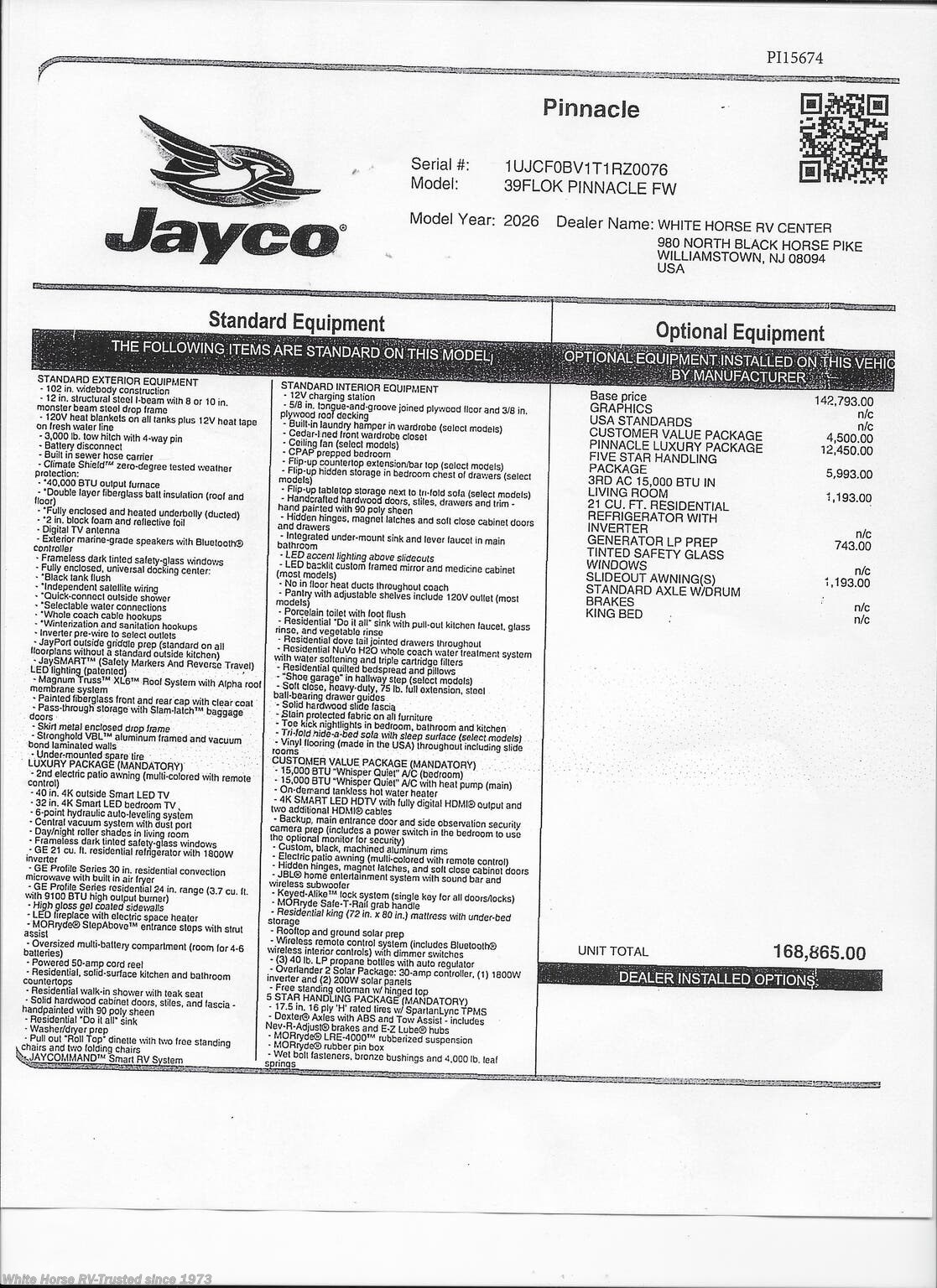 This Stock # PI15674 also has the following factory options included: ... Interior Décor Modern Farmhouse, 3rd AC 15,000 BTU in Living Room, Generator LP Prep, & Slide out Awning (s) ... all backed by Jayco’s 2+3-year warranty! MSRP $168,865.