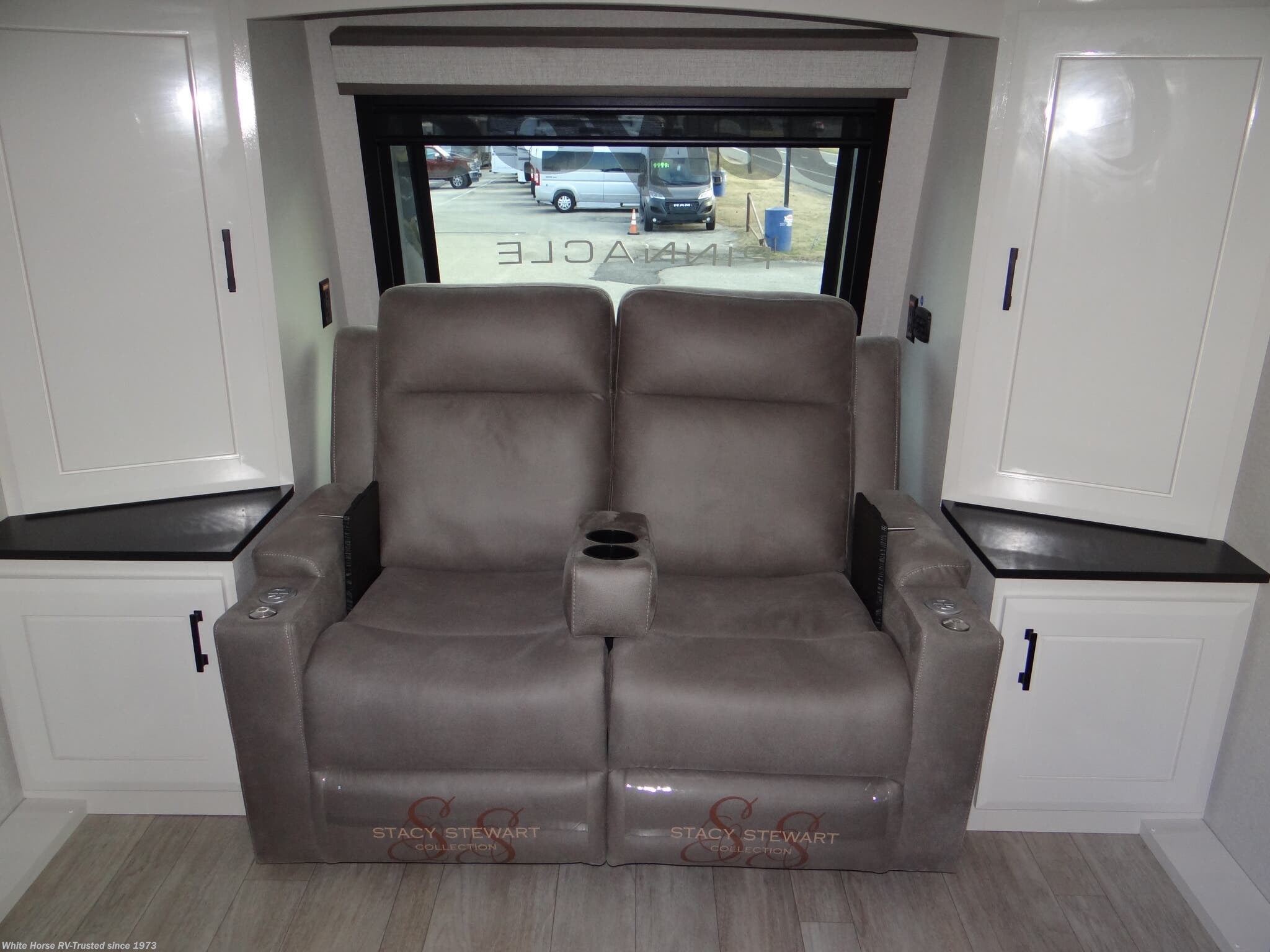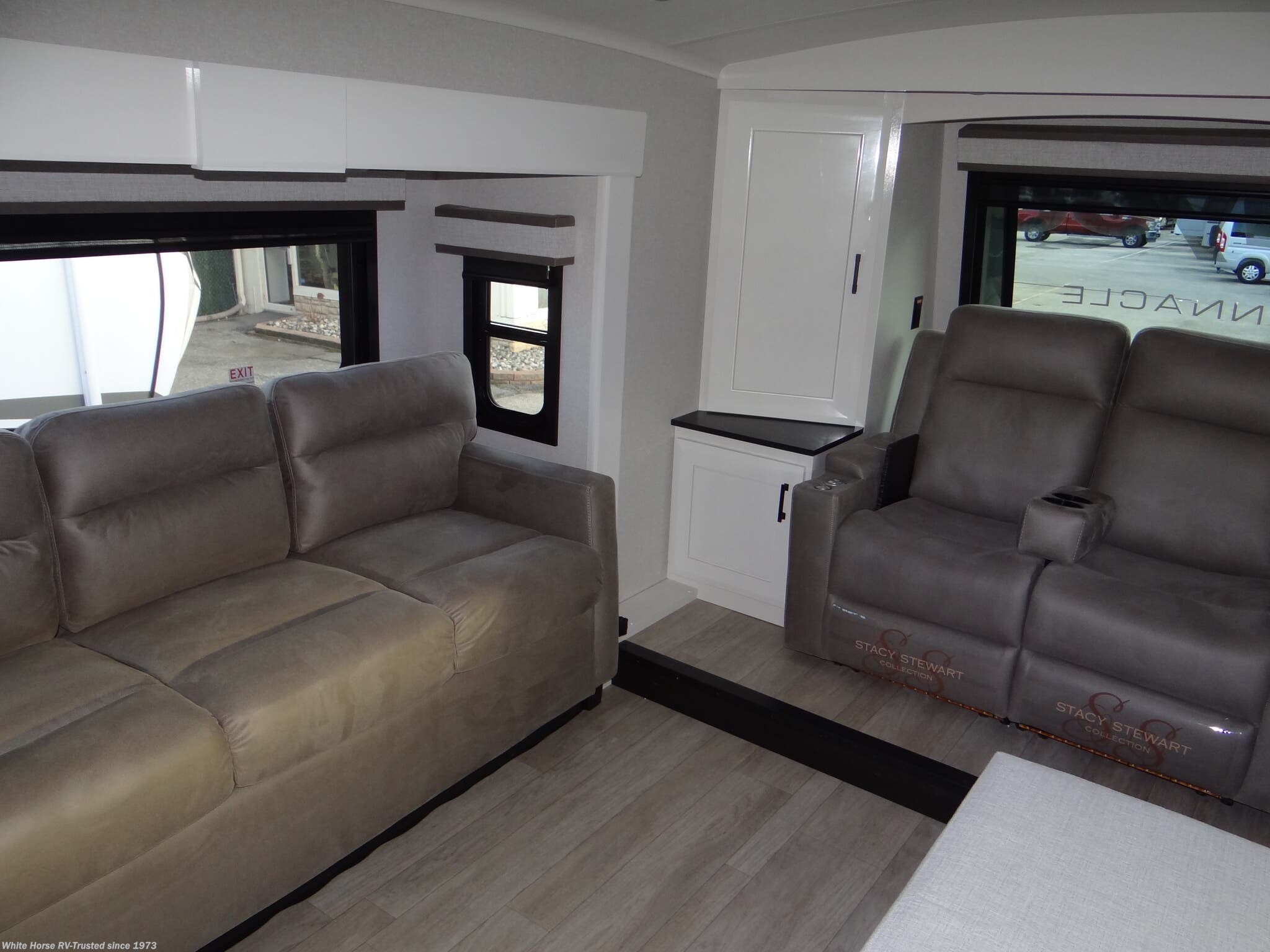 Pinnacle Luxury Package: 2nd Electric Patio Awning w/ Integrated RGB Lights, 40" 4K Outside Smart LED TV, 32" 4K Smart LED Bedroom TV, 6-point Hydraulic Auto-Leveling System, Central Vacuum System w/ Dust Port, Day/Night Roller Shades in Living Room, Frameless Dark Tinted Safety-Glass Windows, GE 21 Cu Ft Residential Refrigerator w/ 1800W Inverter, GE Profile Series 30" Residential Convection Microwave w/Built In Air Fryer, GE Profile Series Residential 24" Range (3.7 cu ft w/9100 BTU high Output Burner), High Gloss Gel-Coated Sidewalls, LED Fireplace w/ Electric Space Heater, MORryde® StepAbove™ Entrance Steps (Main) w/Strut Assist, Oversized Multi Battery Compartment (Industry Leading Room for 4-6 Batteries), Powered 50 Amp Cord Reel, Residential Solid-Surface Kitchen and Bathroom Countertops, Residential Walk-In Shower w/ Shampoo/Soap Holder, Teak Seat and Shower Tower, Solid Hardwood Cabinet Doors, Stiles and Fascia - Hand Painted w/90 Poly Sheen, Under Sink Dishwasher, Washer/Dryer Prep, Pull Out Roll Top Dinette w/ (2) Freestanding Chairs and (2) Folding Chairs, JAYCOMMAND® "Smart RV" System