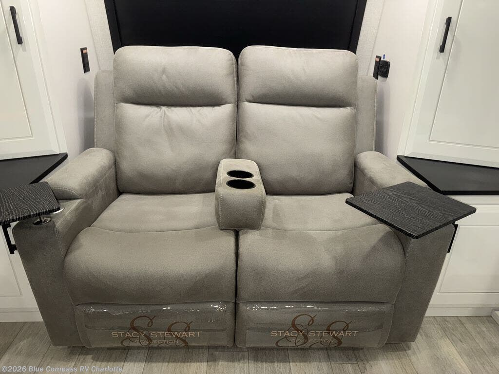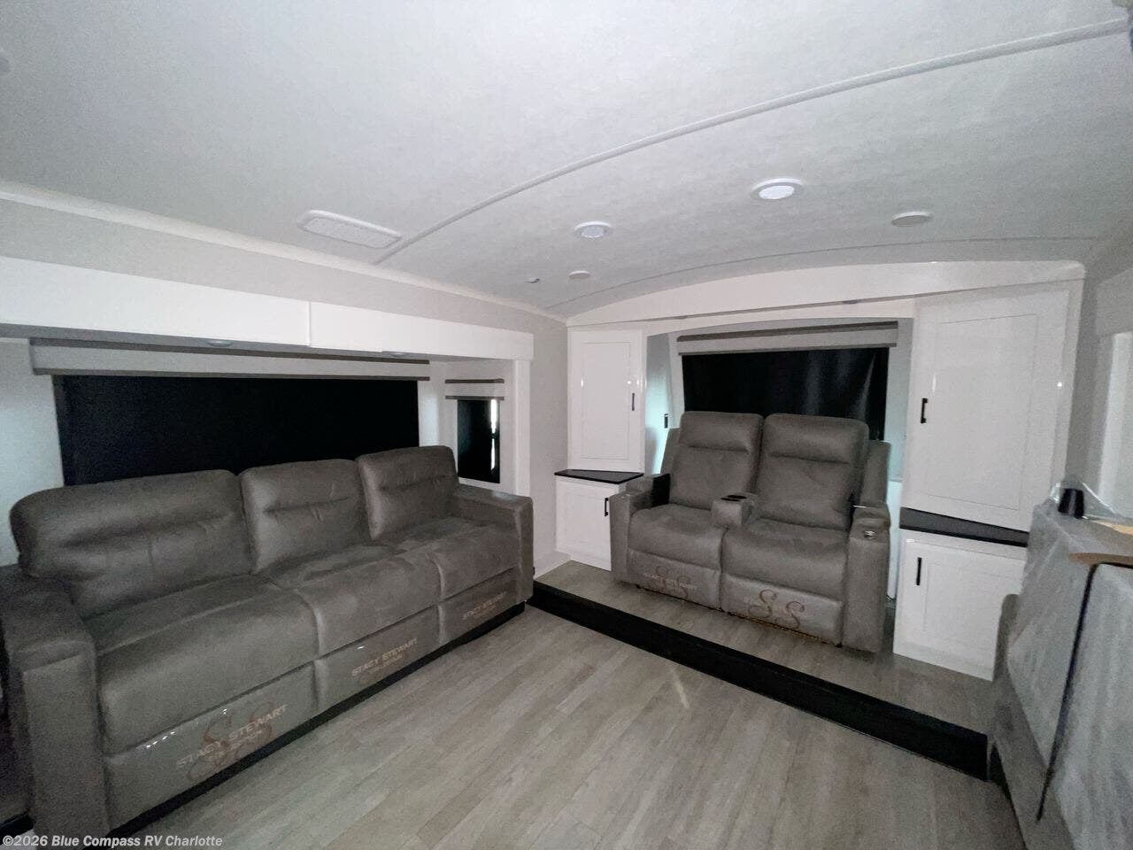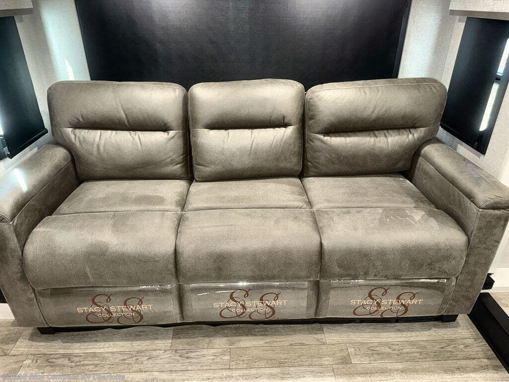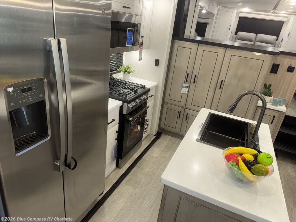 At the front of this fifth wheel, a spacious living area welcomes you with a theater seat and dual opposing slides that hold two tri-fold sofas, perfect for gathering the whole crew after a day of adventure and easily converted into extra sleeping space when needed. A 65" TV enhances cozy movie nights. Moving into the center, the kitchen opens up with its own slide-out, offering a 21-cu. ft. residential refrigerator, 30" convection microwave, 24" range, and plenty of overhead cabinets, along with a functional island equipped with a sink, pull-out cutting board, and generous prep space. A pantry sits conveniently nearby for dry goods, while a half bath across the way adds everyday convenience. Opposite the island, a roll-top dinette in another slide provides even more room to move around and the perfect spot for meals or board games. Toward the rear, the spacious bedroom features a 72" x 80" king bed in a slide for added walking space, along with a bench, a 32" TV, and dual wardrobes for clothing and essentials. At the very back, a luxurious full bathroom awaits, complete with double sinks for smooth morning routines and a 36" x 48" shower with a built-in seat for comfort and accessibility.