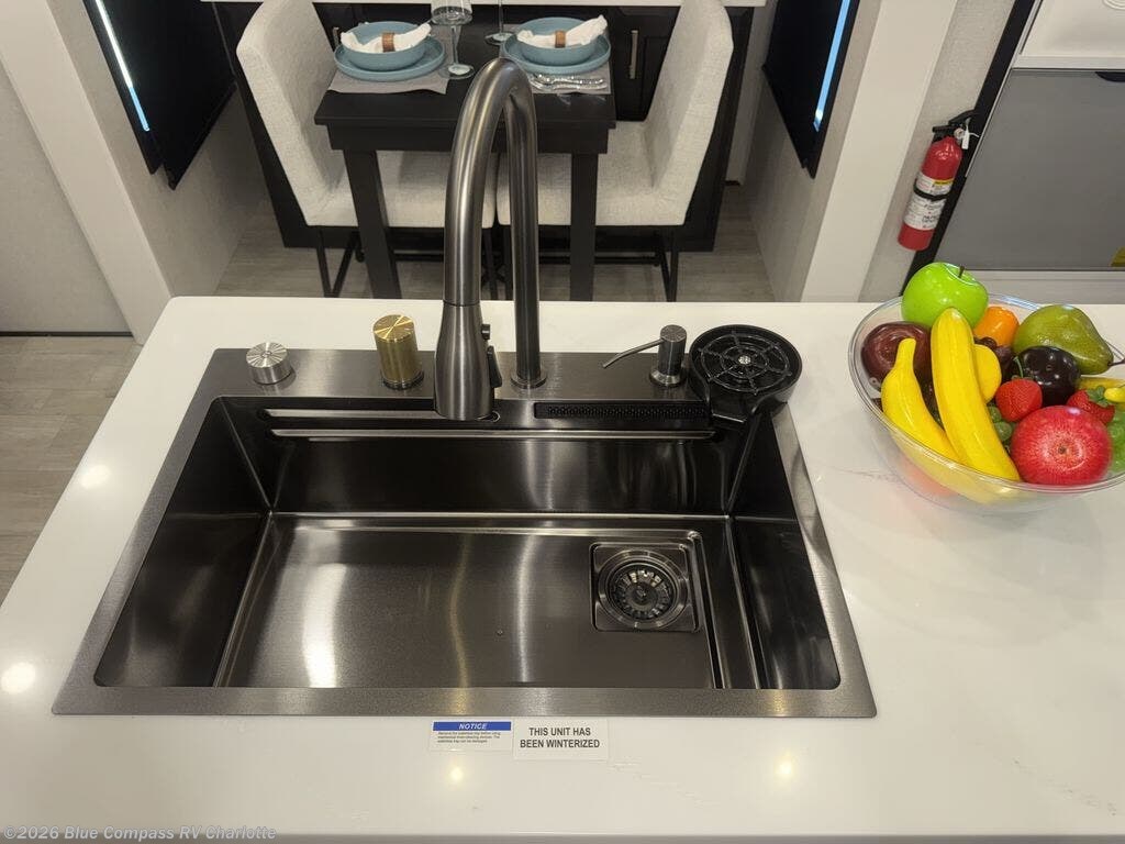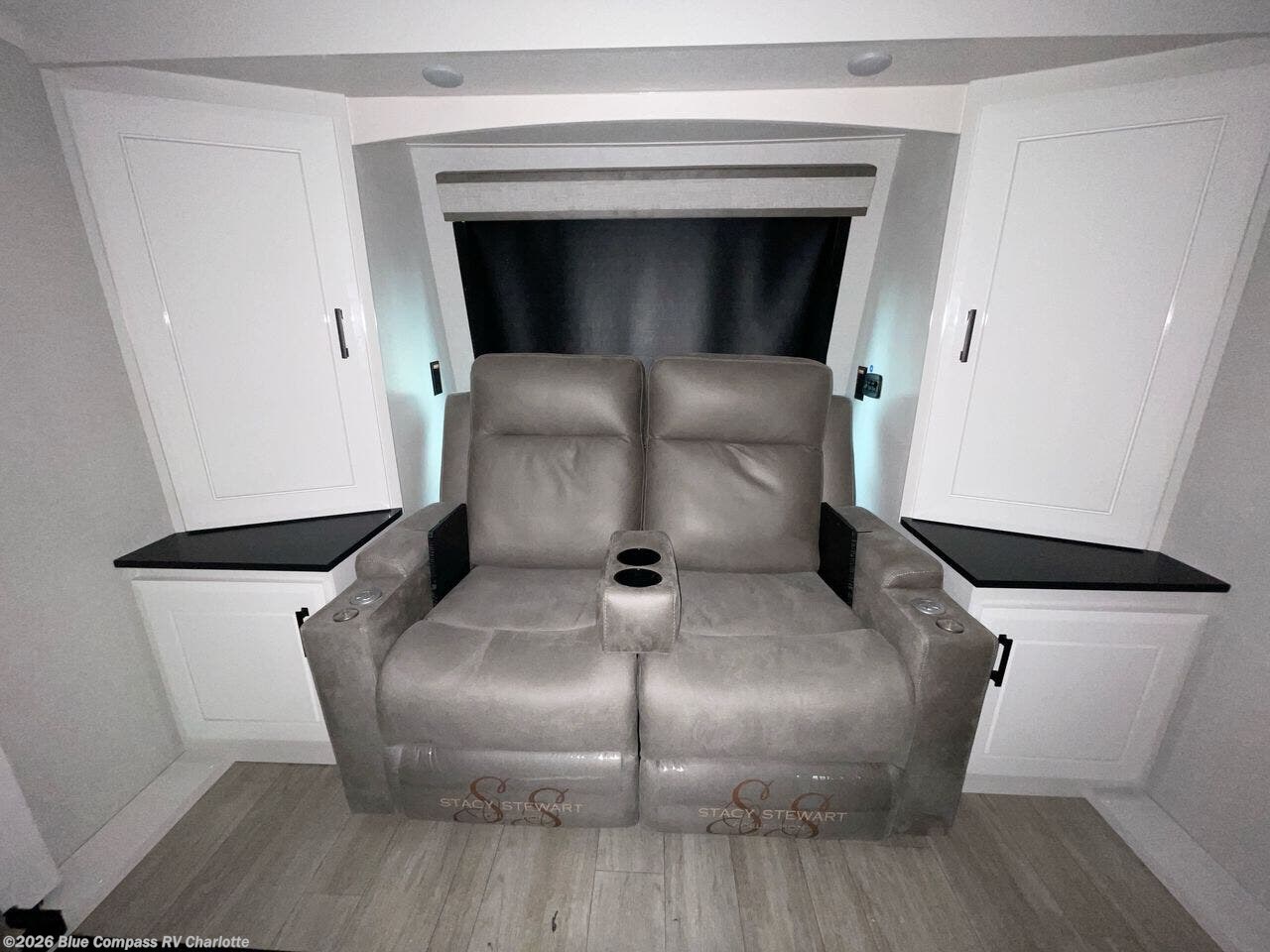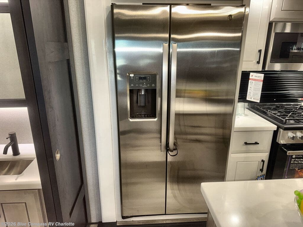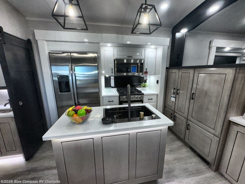 At the front of this fifth wheel, a spacious living area welcomes you with a theater seat and dual opposing slides that hold two tri-fold sofas, perfect for gathering the whole crew after a day of adventure and easily converted into extra sleeping space when needed. A 65" TV enhances cozy movie nights. Moving into the center, the kitchen opens up with its own slide-out, offering a 21-cu. ft. residential refrigerator, 30" convection microwave, 24" range, and plenty of overhead cabinets, along with a functional island equipped with a sink, pull-out cutting board, and generous prep space. A pantry sits conveniently nearby for dry goods, while a half bath across the way adds everyday convenience. Opposite the island, a roll-top dinette in another slide provides even more room to move around and the perfect spot for meals or board games. Toward the rear, the spacious bedroom features a 72" x 80" king bed in a slide for added walking space, along with a bench, a 32" TV, and dual wardrobes for clothing and essentials. At the very back, a luxurious full bathroom awaits, complete with double sinks for smooth morning routines and a 36" x 48" shower with a built-in seat for comfort and accessibility.