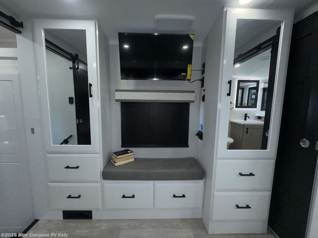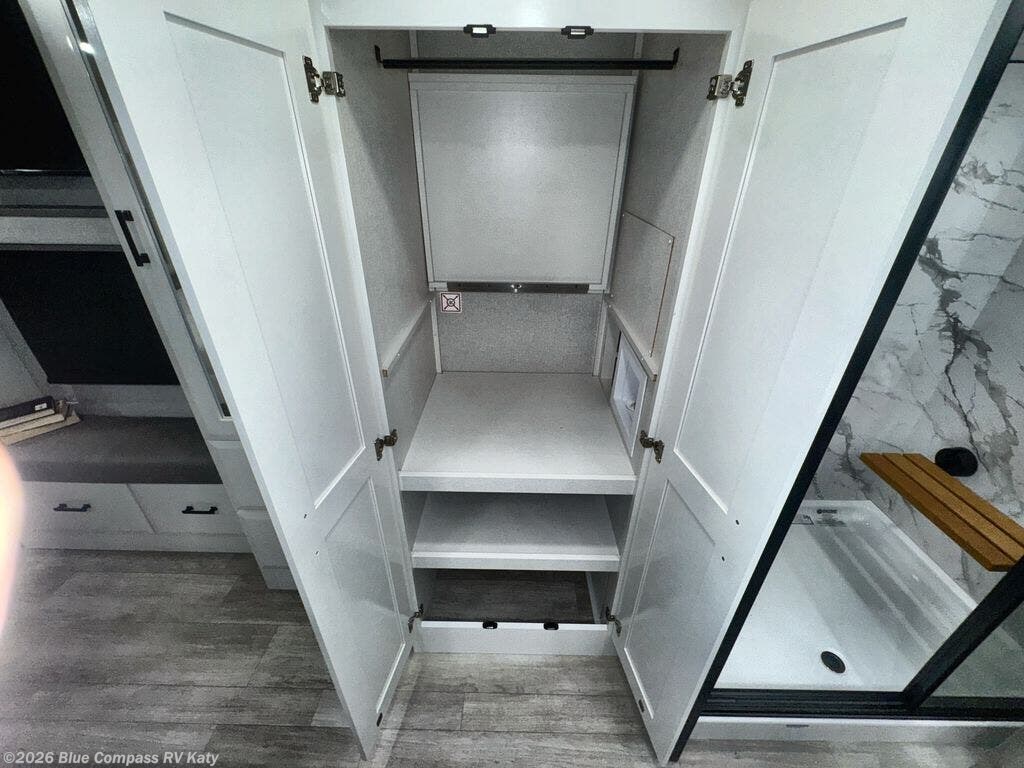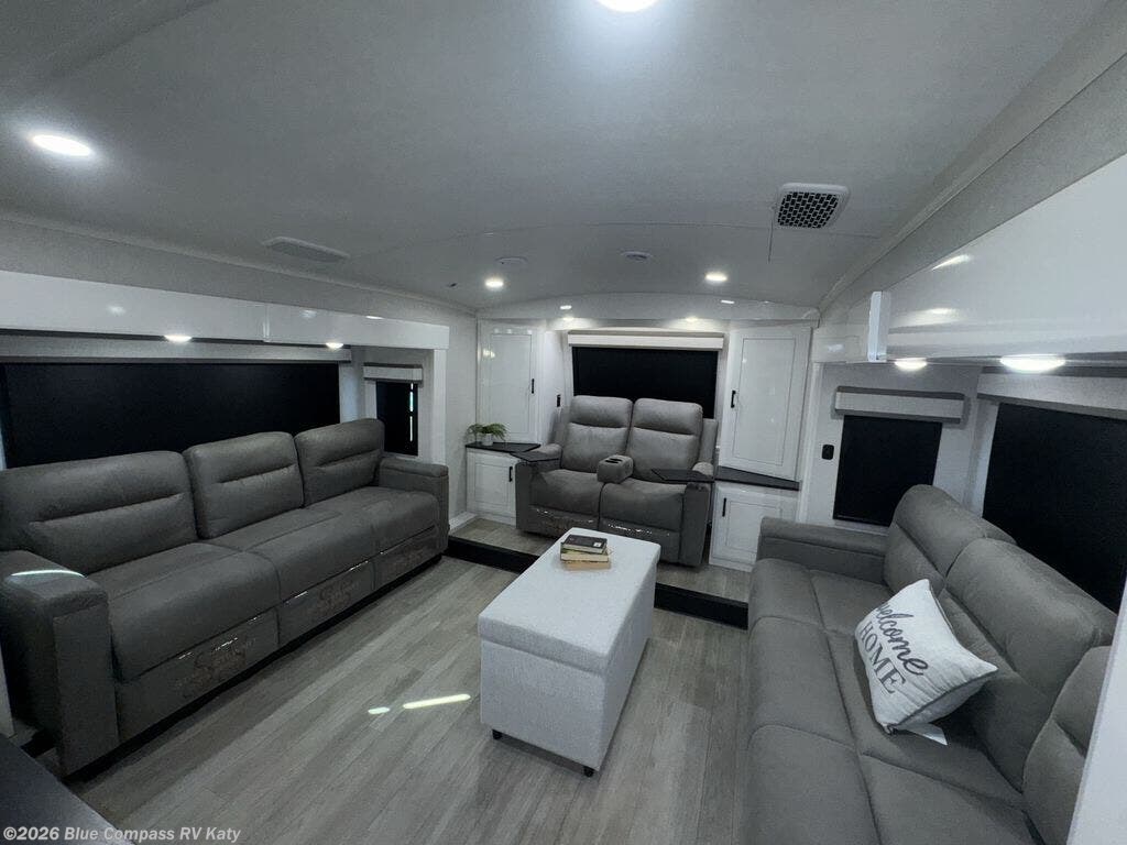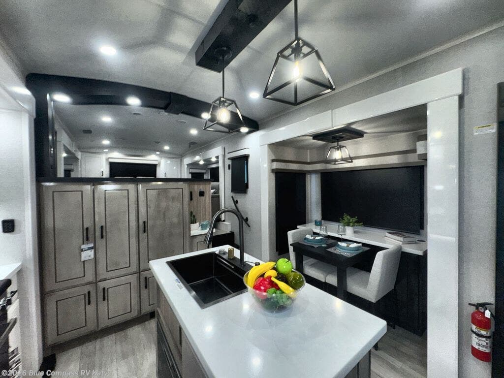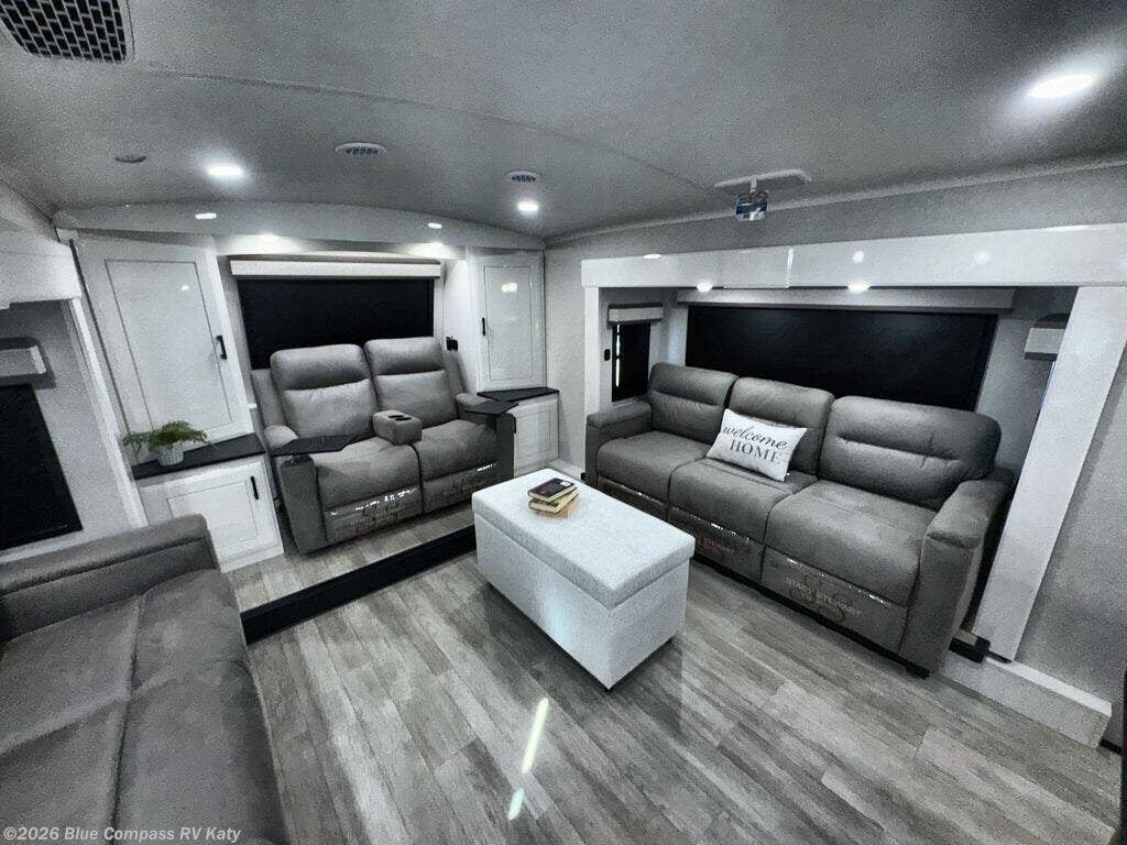 At the front of this fifth wheel, a spacious living area welcomes you with a theater seat and dual opposing slides that hold two tri-fold sofas, perfect for gathering the whole crew after a day of adventure and easily converted into extra sleeping space when needed. A 65" TV enhances cozy movie nights. Moving into the center, the kitchen opens up with its own slide-out, offering a 21-cu. ft. residential refrigerator, 30" convection microwave, 24" range, and plenty of overhead cabinets, along with a functional island equipped with a sink, pull-out cutting board, and generous prep space. A pantry sits conveniently nearby for dry goods, while a half bath across the way adds everyday convenience. Opposite the island, a roll-top dinette in another slide provides even more room to move around and the perfect spot for meals or board games. Toward the rear, the spacious bedroom features a 72" x 80" king bed in a slide for added walking space, along with a bench, a 32" TV, and dual wardrobes for clothing and essentials. At the very back, a luxurious full bathroom awaits, complete with double sinks for smooth morning routines and a 36" x 48" shower with a built-in seat for comfort and accessibility.