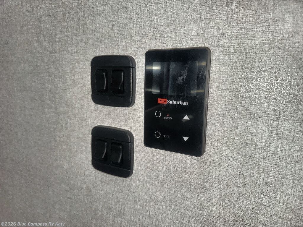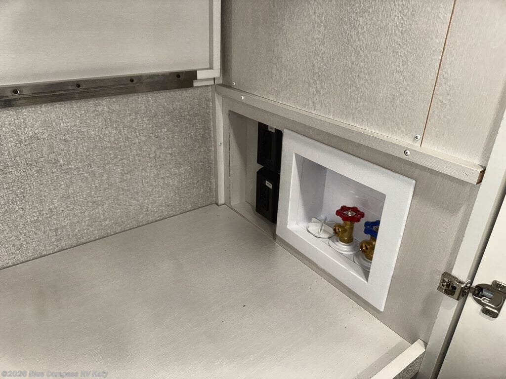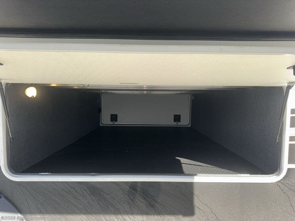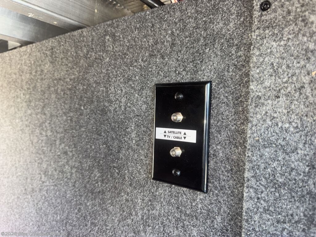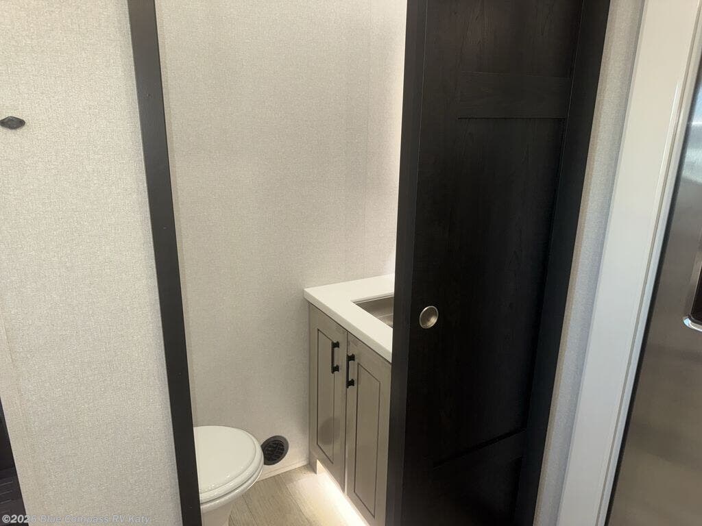 At the front of this fifth wheel, a spacious living area welcomes you with a theater seat and dual opposing slides that hold two tri-fold sofas, perfect for gathering the whole crew after a day of adventure and easily converted into extra sleeping space when needed. A 65" TV enhances cozy movie nights. Moving into the center, the kitchen opens up with its own slide-out, offering a 21-cu. ft. residential refrigerator, 30" convection microwave, 24" range, and plenty of overhead cabinets, along with a functional island equipped with a sink, pull-out cutting board, and generous prep space. A pantry sits conveniently nearby for dry goods, while a half bath across the way adds everyday convenience. Opposite the island, a roll-top dinette in another slide provides even more room to move around and the perfect spot for meals or board games. Toward the rear, the spacious bedroom features a 72" x 80" king bed in a slide for added walking space, along with a bench, a 32" TV, and dual wardrobes for clothing and essentials. At the very back, a luxurious full bathroom awaits, complete with double sinks for smooth morning routines and a 36" x 48" shower with a built-in seat for comfort and accessibility.
