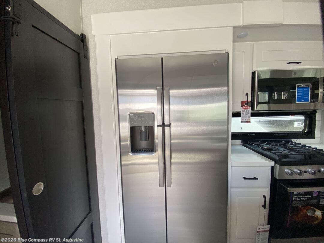 At the front of this fifth wheel, a spacious living area welcomes you with a theater seat and dual opposing slides that hold two tri-fold sofas, perfect for gathering the whole crew after a day of adventure and easily converted into extra sleeping space when needed. A 65" TV enhances cozy movie nights. Moving into the center, the kitchen opens up with its own slide-out, offering a 21-cu. ft. residential refrigerator, 30" convection microwave, 24" range, and plenty of overhead cabinets, along with a functional island equipped with a sink, pull-out cutting board, and generous prep space. A pantry sits conveniently nearby for dry goods, while a half bath across the way adds everyday convenience. Opposite the island, a roll-top dinette in another slide provides even more room to move around and the perfect spot for meals or board games. Toward the rear, the spacious bedroom features a 72" x 80" king bed in a slide for added walking space, along with a bench, a 32" TV, and dual wardrobes for clothing and essentials. At the very back, a luxurious full bathroom awaits, complete with double sinks for smooth morning routines and a 36" x 48" shower with a built-in seat for comfort and accessibility.
