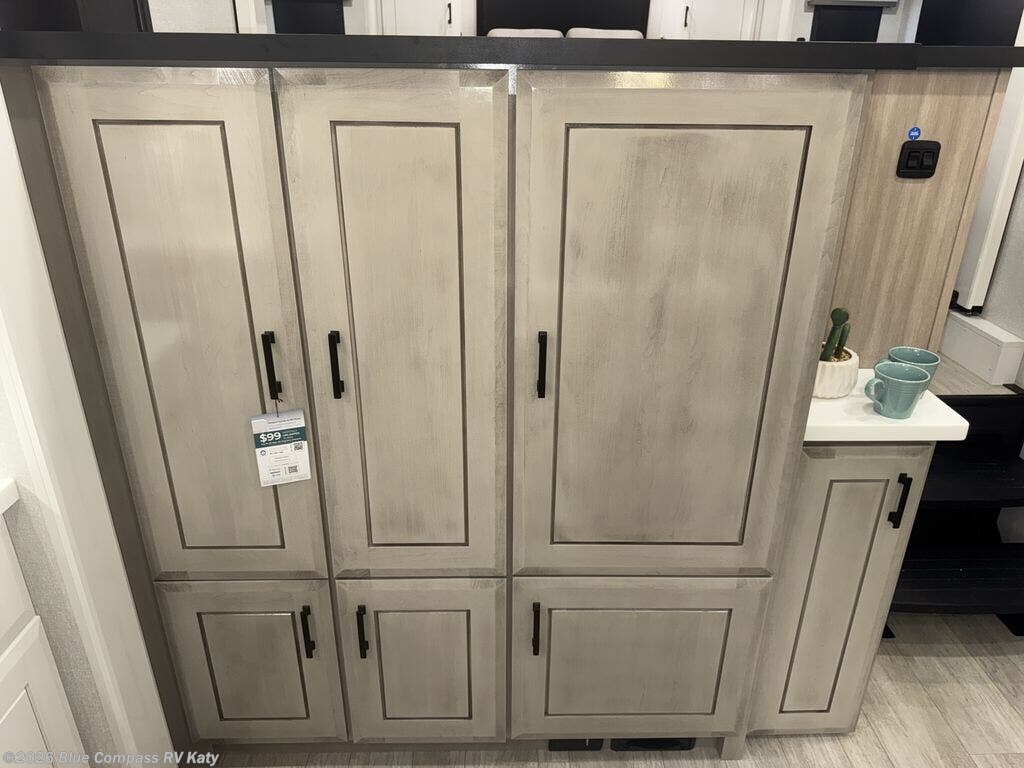 At the front of this fifth wheel, a spacious living area welcomes you with a theater seat and dual opposing slides that hold two tri-fold sofas, perfect for gathering the whole crew after a day of adventure and easily converted into extra sleeping space when needed. A 65" TV enhances cozy movie nights. Moving into the center, the kitchen opens up with its own slide-out, offering a 21-cu. ft. residential refrigerator, 30" convection microwave, 24" range, and plenty of overhead cabinets, along with a functional island equipped with a sink, pull-out cutting board, and generous prep space. A pantry sits conveniently nearby for dry goods, while a half bath across the way adds everyday convenience. Opposite the island, a roll-top dinette in another slide provides even more room to move around and the perfect spot for meals or board games. Toward the rear, the spacious bedroom features a 72" x 80" king bed in a slide for added walking space, along with a bench, a 32" TV, and dual wardrobes for clothing and essentials. At the very back, a luxurious full bathroom awaits, complete with double sinks for smooth morning routines and a 36" x 48" shower with a built-in seat for comfort and accessibility.