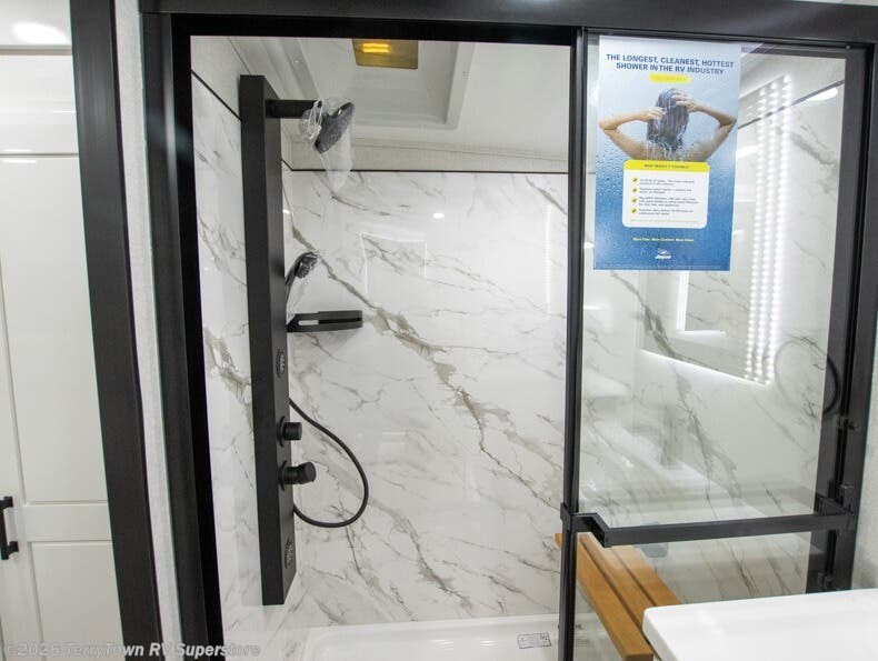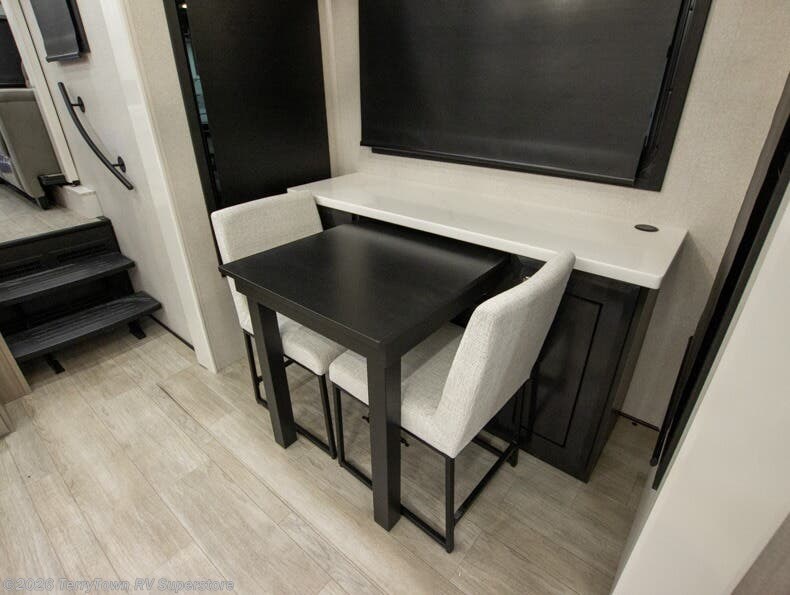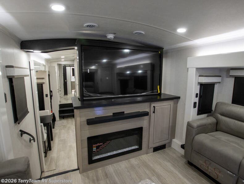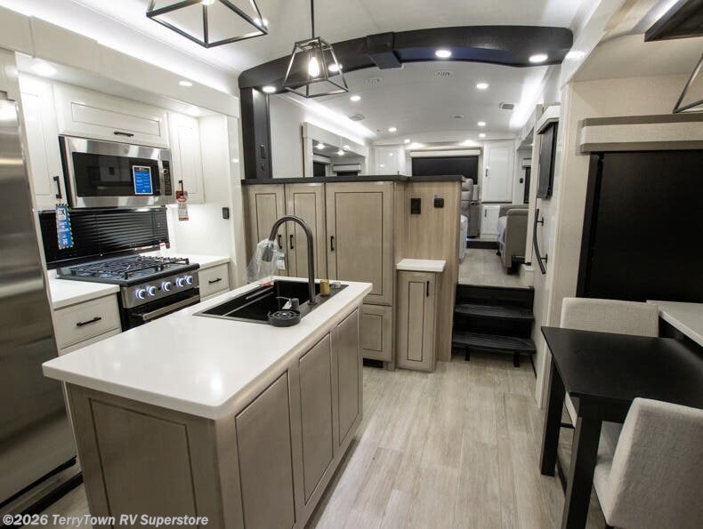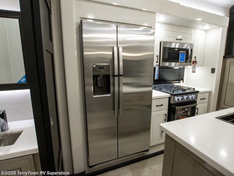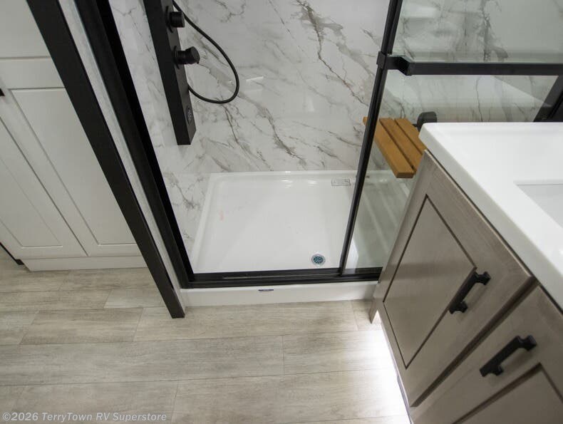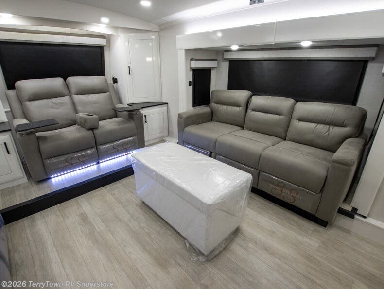 At the front of this fifth wheel, a spacious living area welcomes you with a theater seat and dual opposing slides that hold two tri-fold sofas, perfect for gathering the whole crew after a day of adventure and easily converted into extra sleeping space when needed. A 65" TV enhances cozy movie nights. Moving into the center, the kitchen opens up with its own slide-out, offering a 21-cu. ft. residential refrigerator, 30" convection microwave, 24" range, and plenty of overhead cabinets, along with a functional island equipped with a sink, pull-out cutting board, and generous prep space. A pantry sits conveniently nearby for dry goods, while a half bath across the way adds everyday convenience. Opposite the island, a roll-top dinette in another slide provides even more room to move around and the perfect spot for meals or board games. Toward the rear, the spacious bedroom features a 72" x 80" king bed in a slide for added walking space, along with a bench, a 32" TV, and dual wardrobes for clothing and essentials. At the very back, a luxurious full bathroom awaits, complete with double sinks for smooth morning routines and a 36" x 48" shower with a built-in seat for comfort and accessibility.