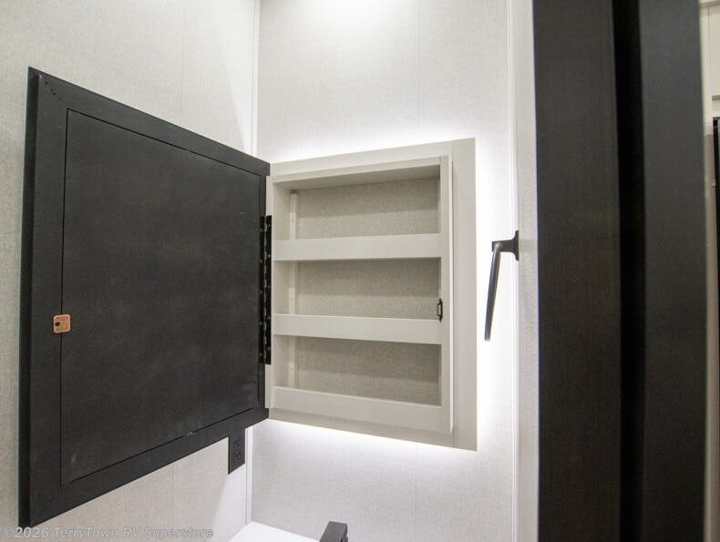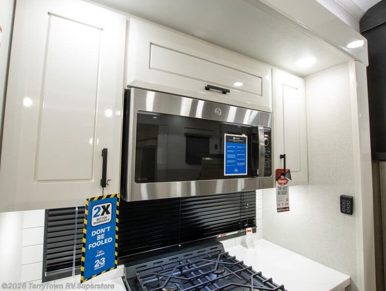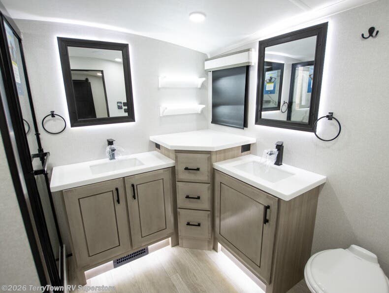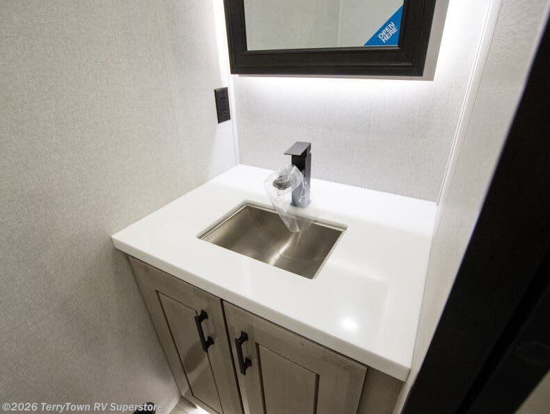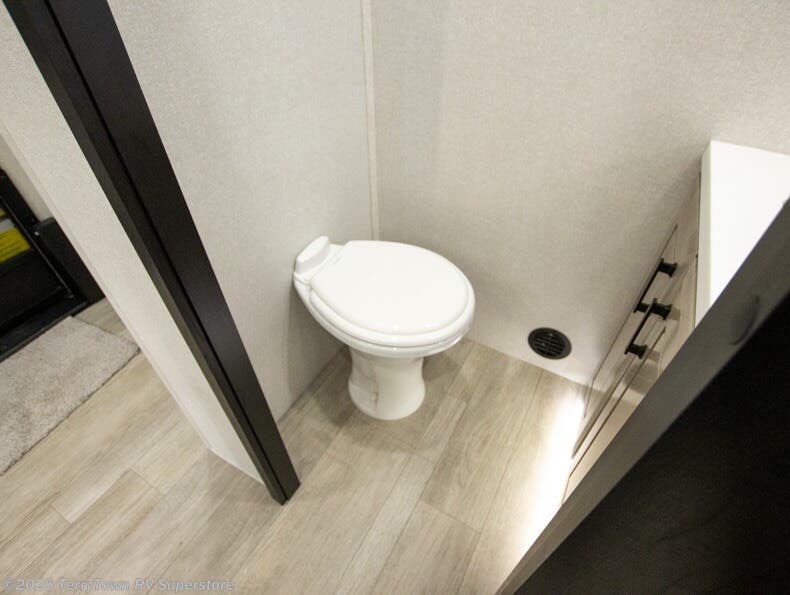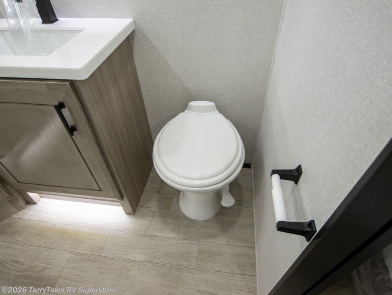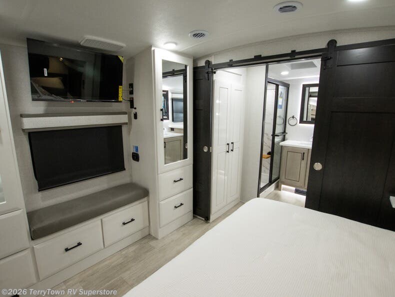At the front of this fifth wheel, a spacious living area welcomes you with a theater seat and dual opposing slides that hold two tri-fold sofas, perfect for gathering the whole crew after a day of adventure and easily converted into extra sleeping space when needed. A 65" TV enhances cozy movie nights. Moving into the center, the kitchen opens up with its own slide-out, offering a 21-cu. ft. residential refrigerator, 30" convection microwave, 24" range, and plenty of overhead cabinets, along with a functional island equipped with a sink, pull-out cutting board, and generous prep space. A pantry sits conveniently nearby for dry goods, while a half bath across the way adds everyday convenience. Opposite the island, a roll-top dinette in another slide provides even more room to move around and the perfect spot for meals or board games. Toward the rear, the spacious bedroom features a 72" x 80" king bed in a slide for added walking space, along with a bench, a 32" TV, and dual wardrobes for clothing and essentials. At the very back, a luxurious full bathroom awaits, complete with double sinks for smooth morning routines and a 36" x 48" shower with a built-in seat for comfort and accessibility.