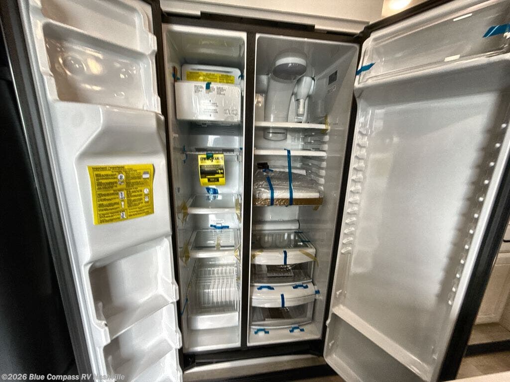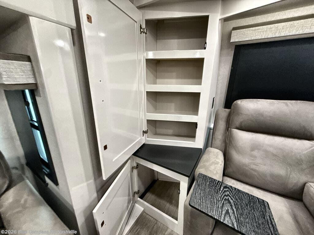 At the front of this fifth wheel, a spacious living area welcomes you with a theater seat and dual opposing slides that hold two tri-fold sofas, perfect for gathering the whole crew after a day of adventure and easily converted into extra sleeping space when needed. A 65" TV enhances cozy movie nights. Moving into the center, the kitchen opens up with its own slide-out, offering a 21-cu. ft. residential refrigerator, 30" convection microwave, 24" range, and plenty of overhead cabinets, along with a functional island equipped with a sink, pull-out cutting board, and generous prep space. A pantry sits conveniently nearby for dry goods, while a half bath across the way adds everyday convenience. Opposite the island, a roll-top dinette in another slide provides even more room to move around and the perfect spot for meals or board games. Toward the rear, the spacious bedroom features a 72" x 80" king bed in a slide for added walking space, along with a bench, a 32" TV, and dual wardrobes for clothing and essentials. At the very back, a luxurious full bathroom awaits, complete with double sinks for smooth morning routines and a 36" x 48" shower with a built-in seat for comfort and accessibility.