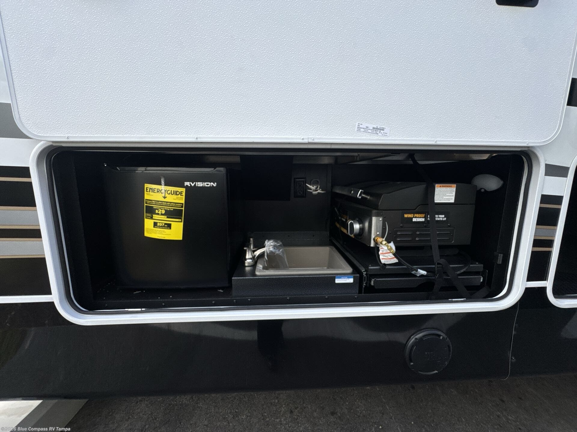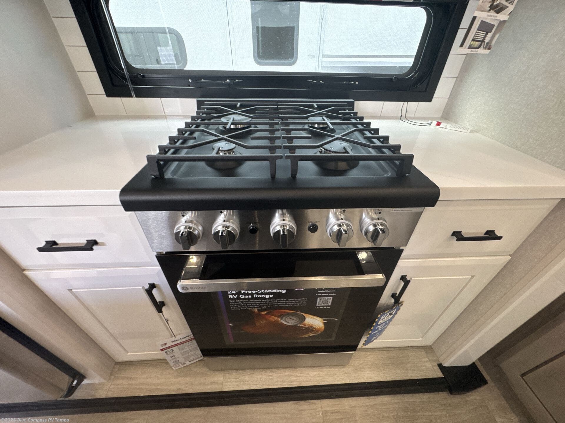 At the front of this fifth wheel, a spacious living area welcomes you with a theater seat and dual opposing slides that hold two tri-fold sofas, perfect for gathering the whole crew after a day of adventure and easily converted into extra sleeping space when needed. A 65" TV enhances cozy movie nights. Moving into the center, the kitchen opens up with its own slide-out, offering a 21-cu. ft. residential refrigerator, 30" convection microwave, 24" range, and plenty of overhead cabinets, along with a functional island equipped with a sink, pull-out cutting board, and generous prep space. A pantry sits conveniently nearby for dry goods, while a half bath across the way adds everyday convenience. Opposite the island, a roll-top dinette in another slide provides even more room to move around and the perfect spot for meals or board games. Toward the rear, the spacious bedroom features a 72" x 80" king bed in a slide for added walking space, along with a bench, a 32" TV, and dual wardrobes for clothing and essentials. At the very back, a luxurious full bathroom awaits, complete with double sinks for smooth morning routines and a 36" x 48" shower with a built-in seat for comfort and accessibility.