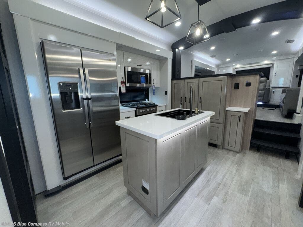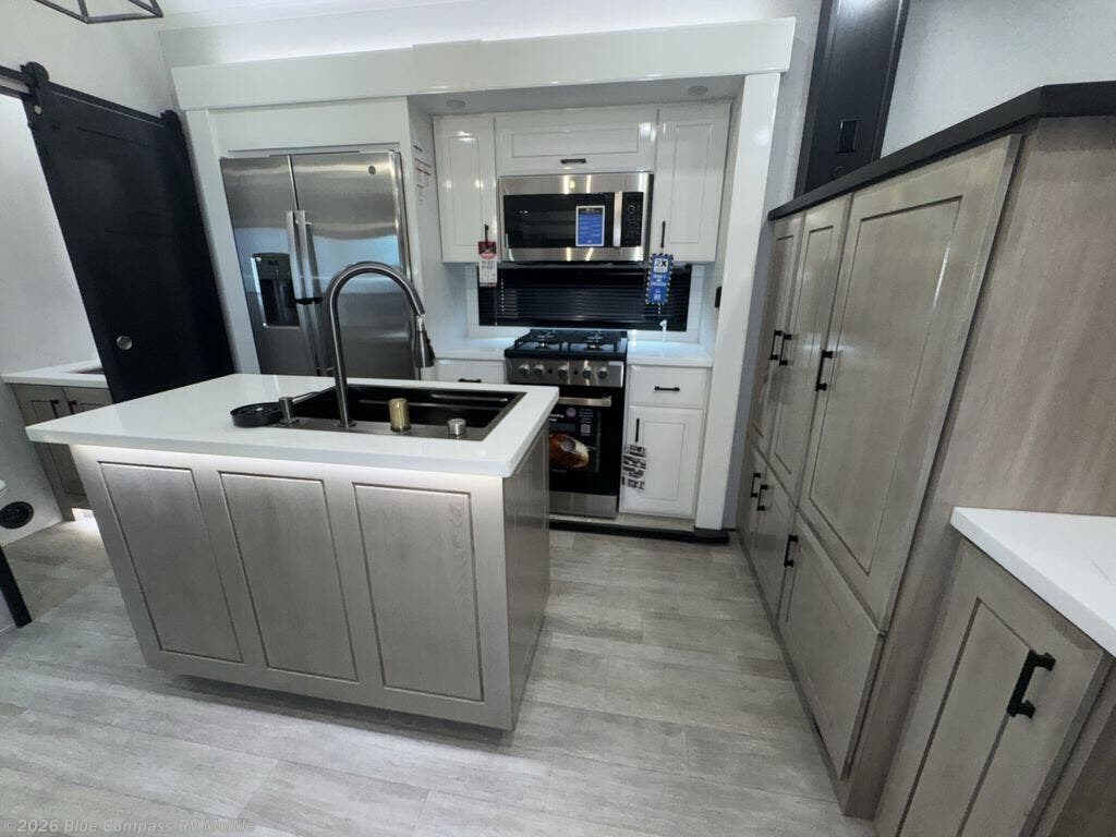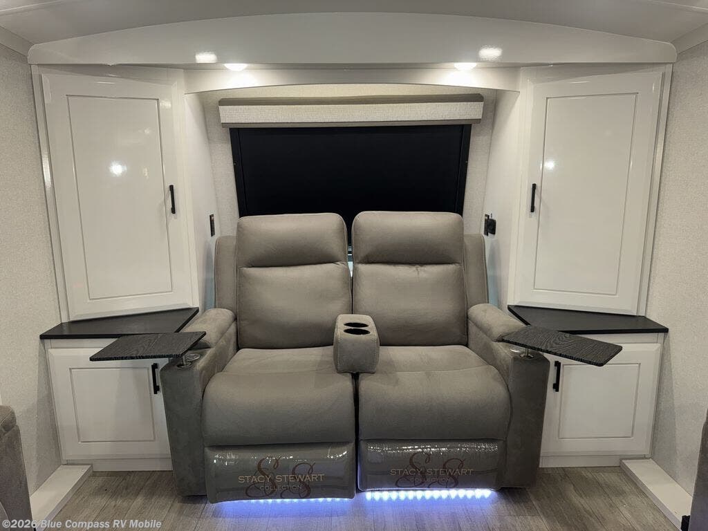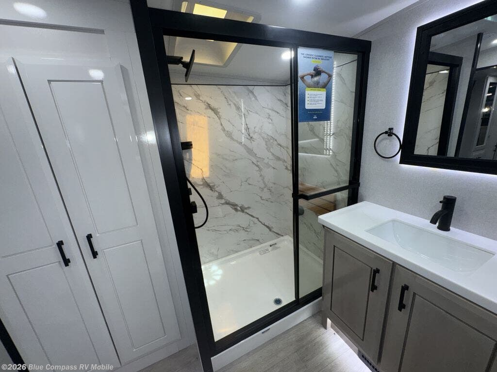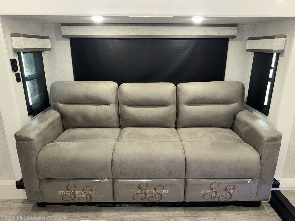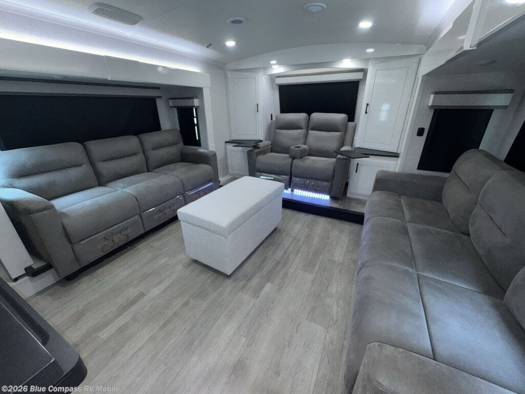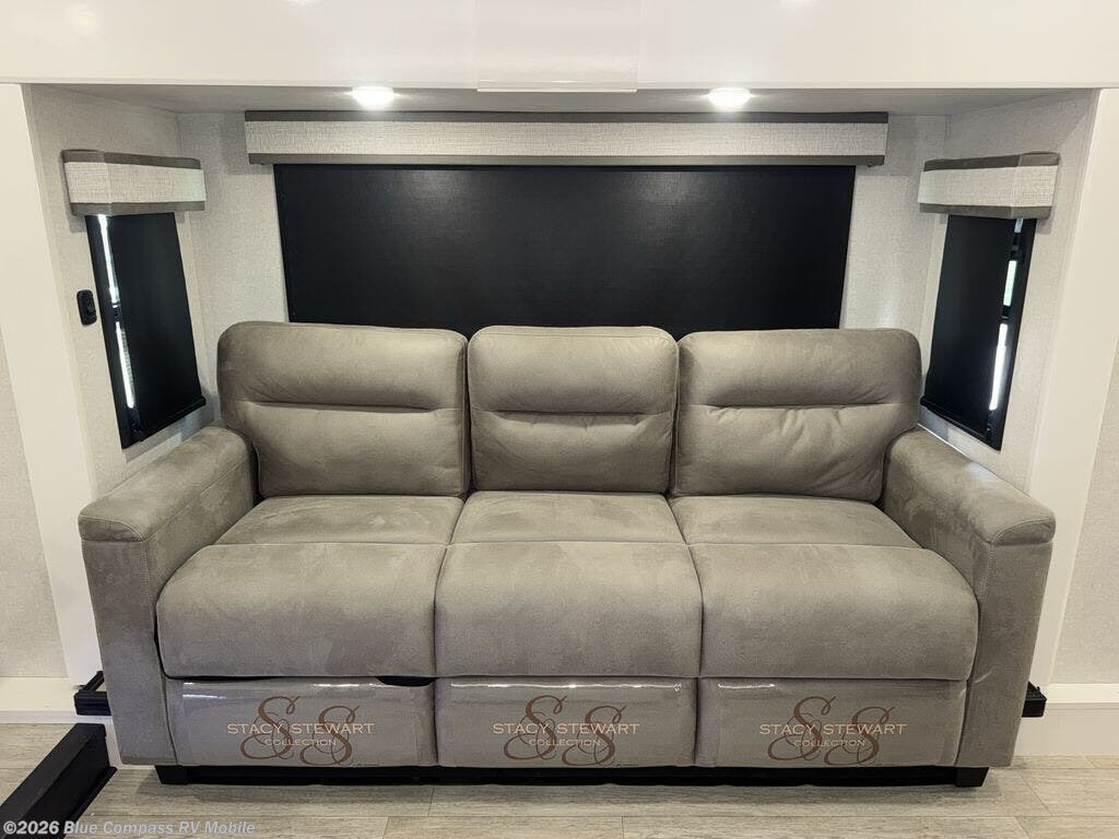 At the front of this fifth wheel, a spacious living area welcomes you with a theater seat and dual opposing slides that hold two tri-fold sofas, perfect for gathering the whole crew after a day of adventure and easily converted into extra sleeping space when needed. A 65" TV enhances cozy movie nights. Moving into the center, the kitchen opens up with its own slide-out, offering a 21-cu. ft. residential refrigerator, 30" convection microwave, 24" range, and plenty of overhead cabinets, along with a functional island equipped with a sink, pull-out cutting board, and generous prep space. A pantry sits conveniently nearby for dry goods, while a half bath across the way adds everyday convenience. Opposite the island, a roll-top dinette in another slide provides even more room to move around and the perfect spot for meals or board games. Toward the rear, the spacious bedroom features a 72" x 80" king bed in a slide for added walking space, along with a bench, a 32" TV, and dual wardrobes for clothing and essentials. At the very back, a luxurious full bathroom awaits, complete with double sinks for smooth morning routines and a 36" x 48" shower with a built-in seat for comfort and accessibility.