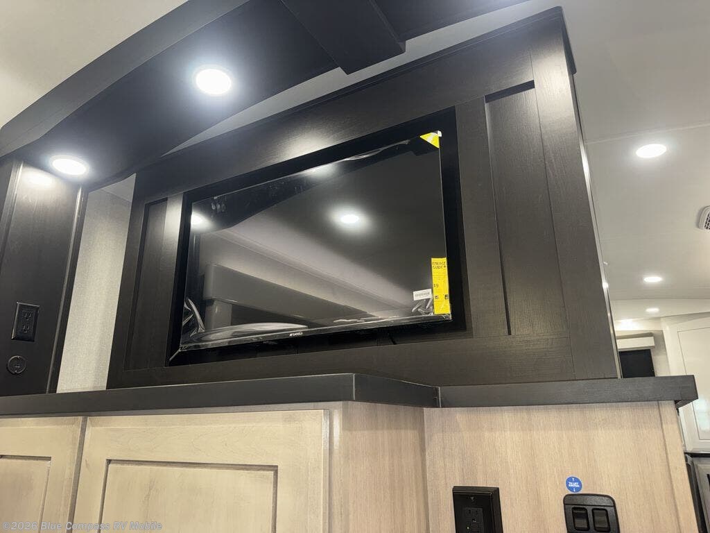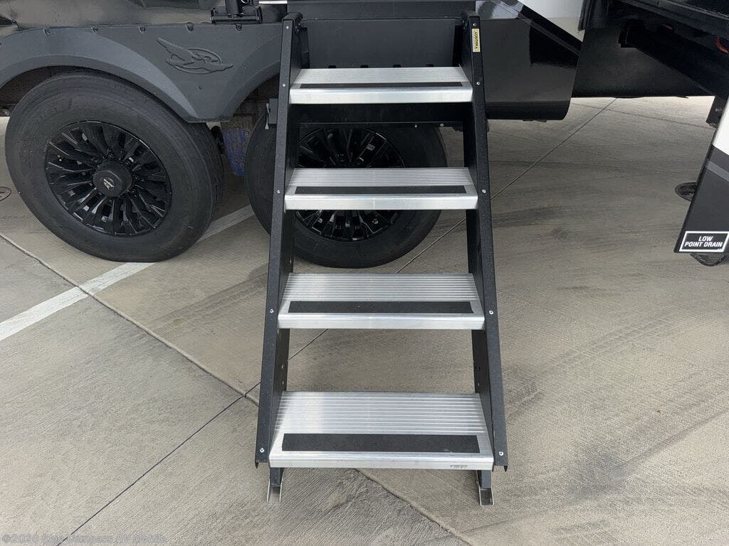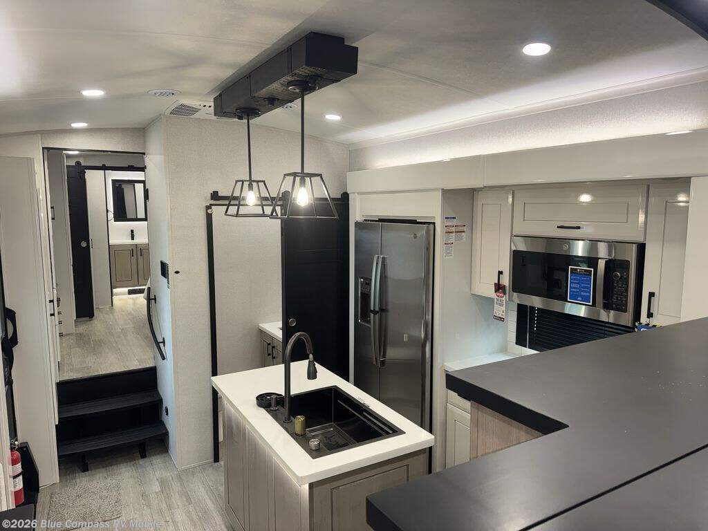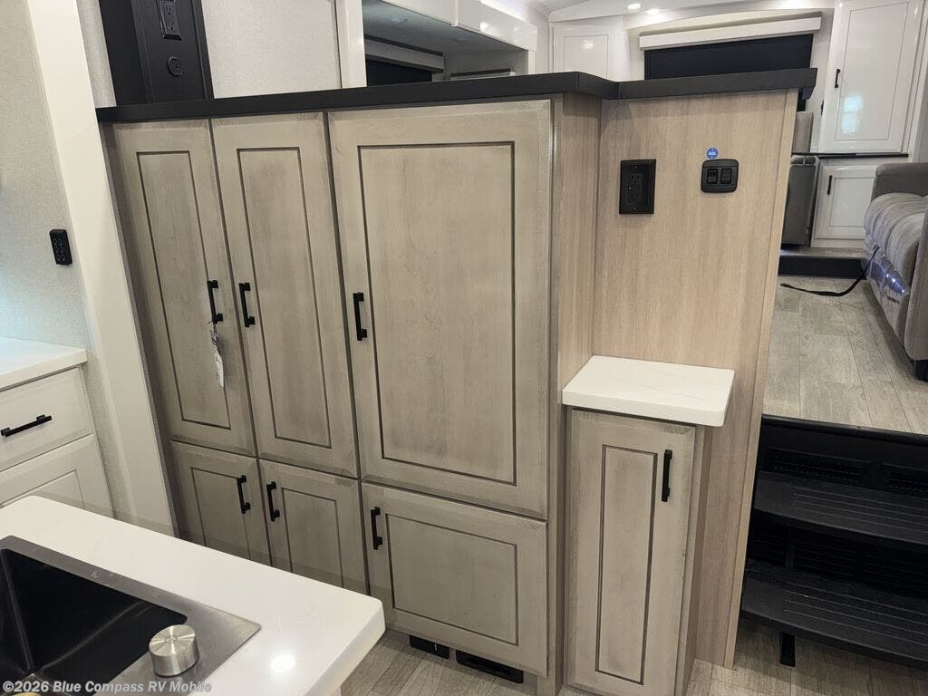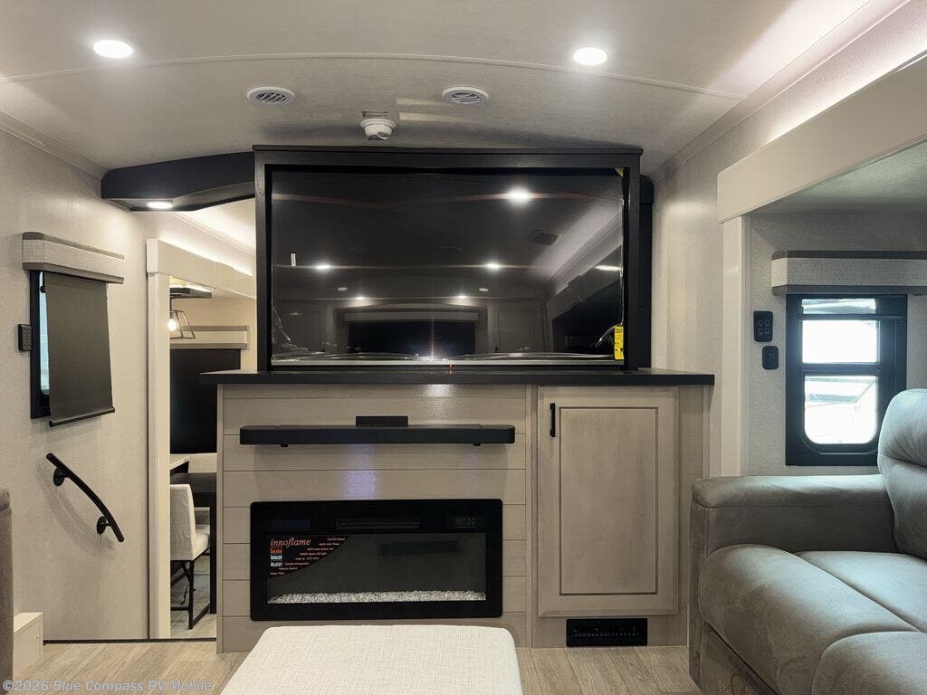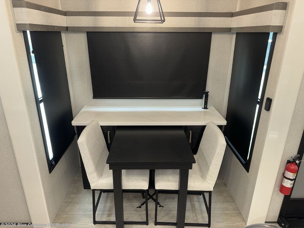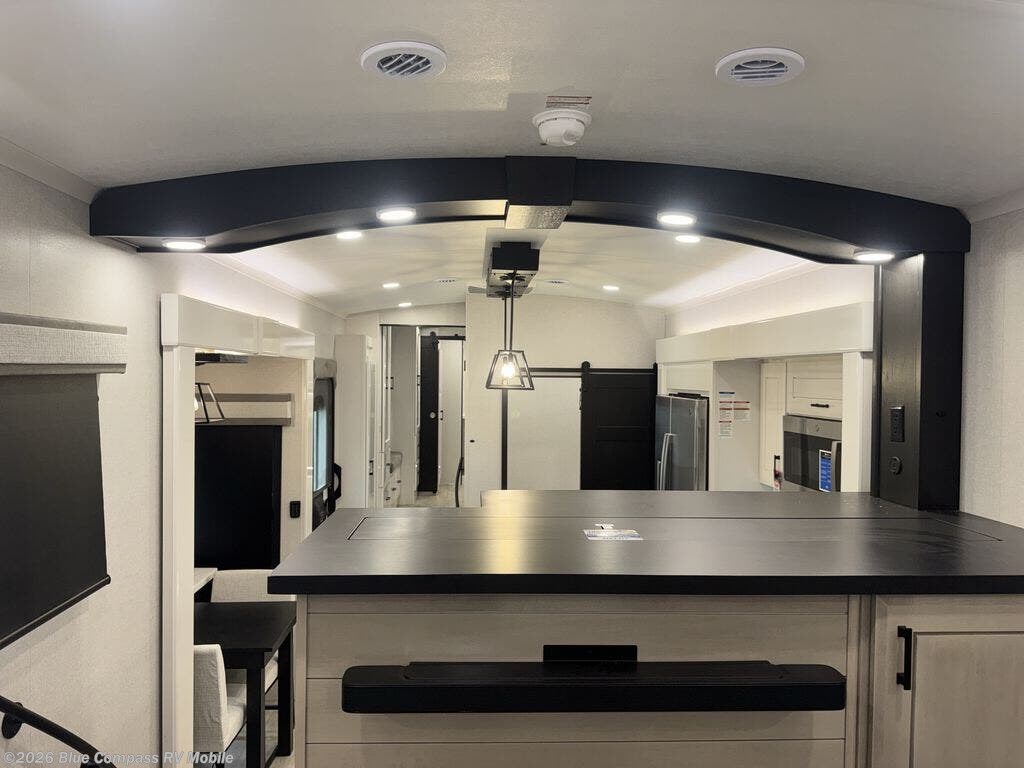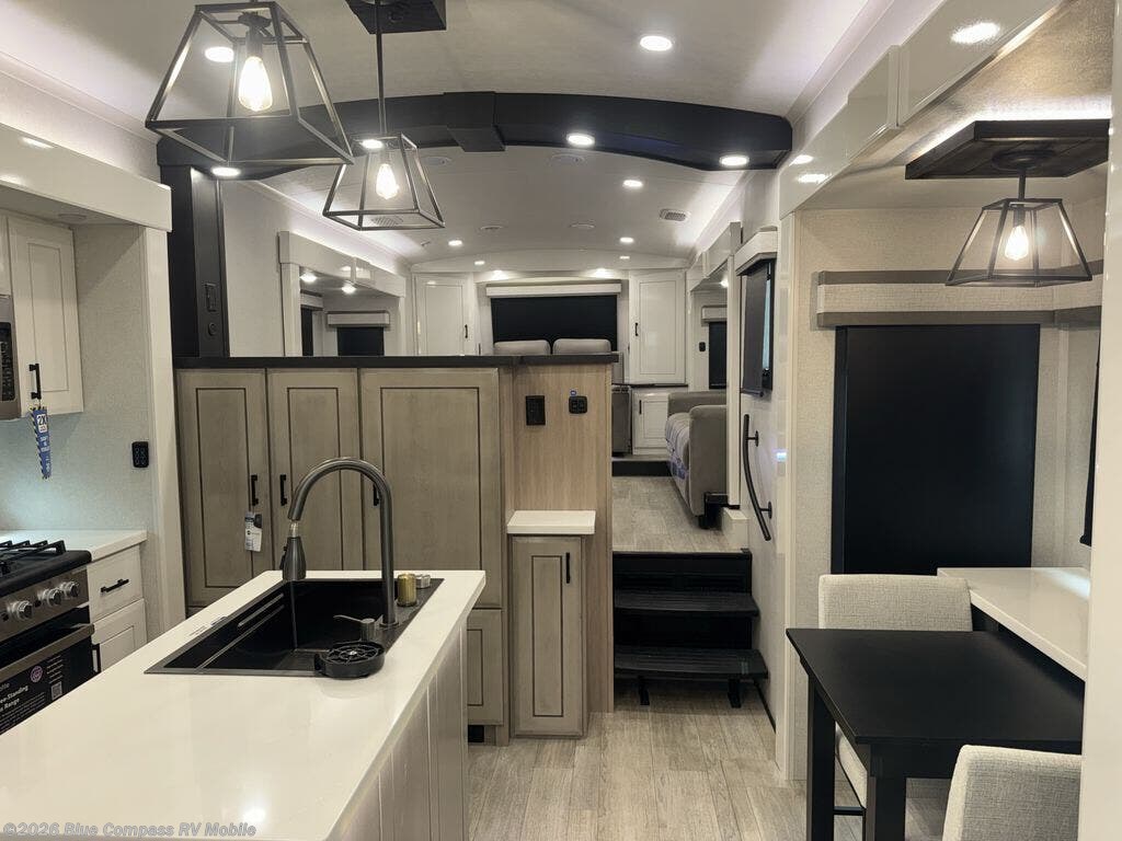 At the front of this fifth wheel, a spacious living area welcomes you with a theater seat and dual opposing slides that hold two tri-fold sofas, perfect for gathering the whole crew after a day of adventure and easily converted into extra sleeping space when needed. A 65" TV enhances cozy movie nights. Moving into the center, the kitchen opens up with its own slide-out, offering a 21-cu. ft. residential refrigerator, 30" convection microwave, 24" range, and plenty of overhead cabinets, along with a functional island equipped with a sink, pull-out cutting board, and generous prep space. A pantry sits conveniently nearby for dry goods, while a half bath across the way adds everyday convenience. Opposite the island, a roll-top dinette in another slide provides even more room to move around and the perfect spot for meals or board games. Toward the rear, the spacious bedroom features a 72" x 80" king bed in a slide for added walking space, along with a bench, a 32" TV, and dual wardrobes for clothing and essentials. At the very back, a luxurious full bathroom awaits, complete with double sinks for smooth morning routines and a 36" x 48" shower with a built-in seat for comfort and accessibility.